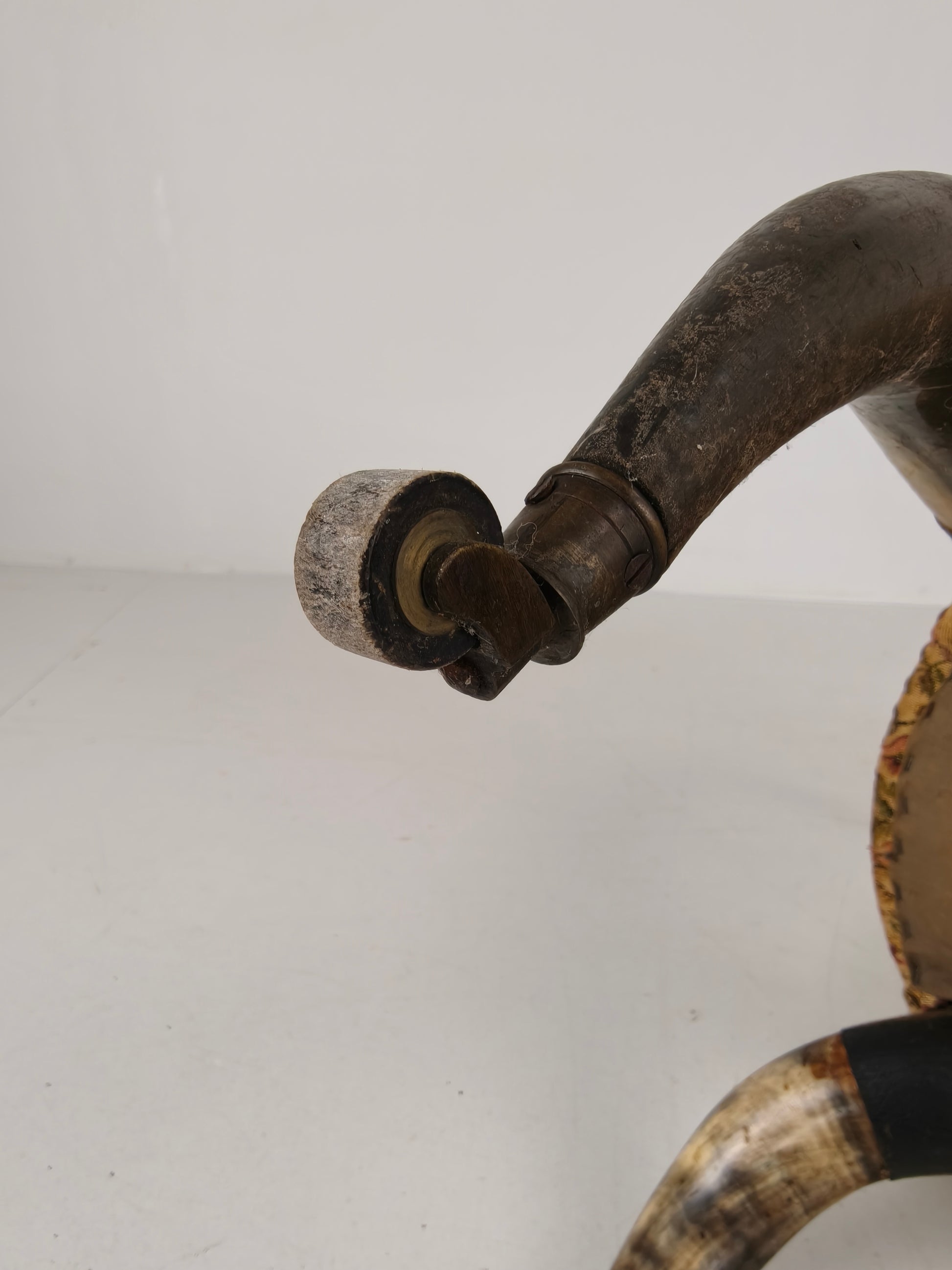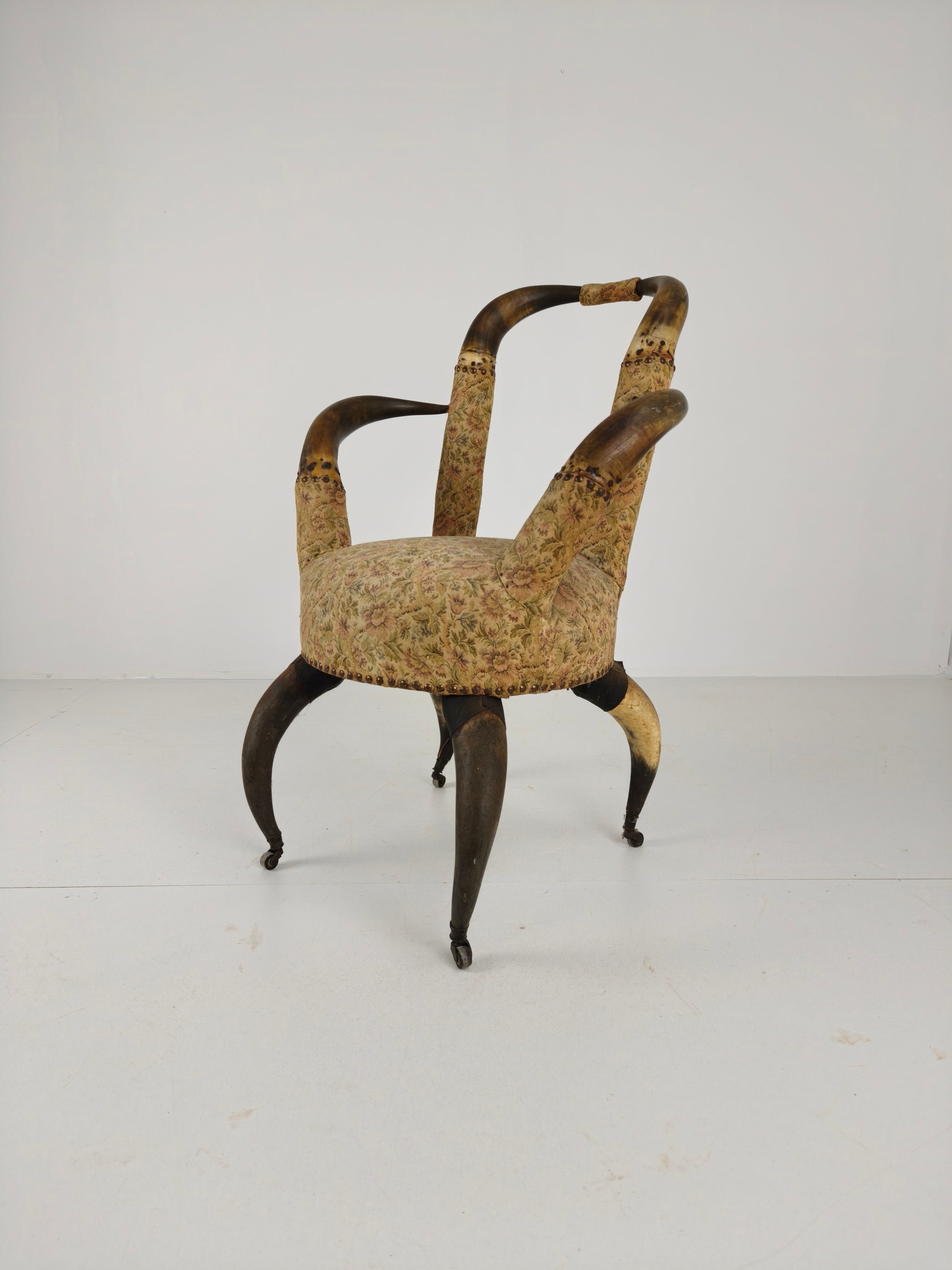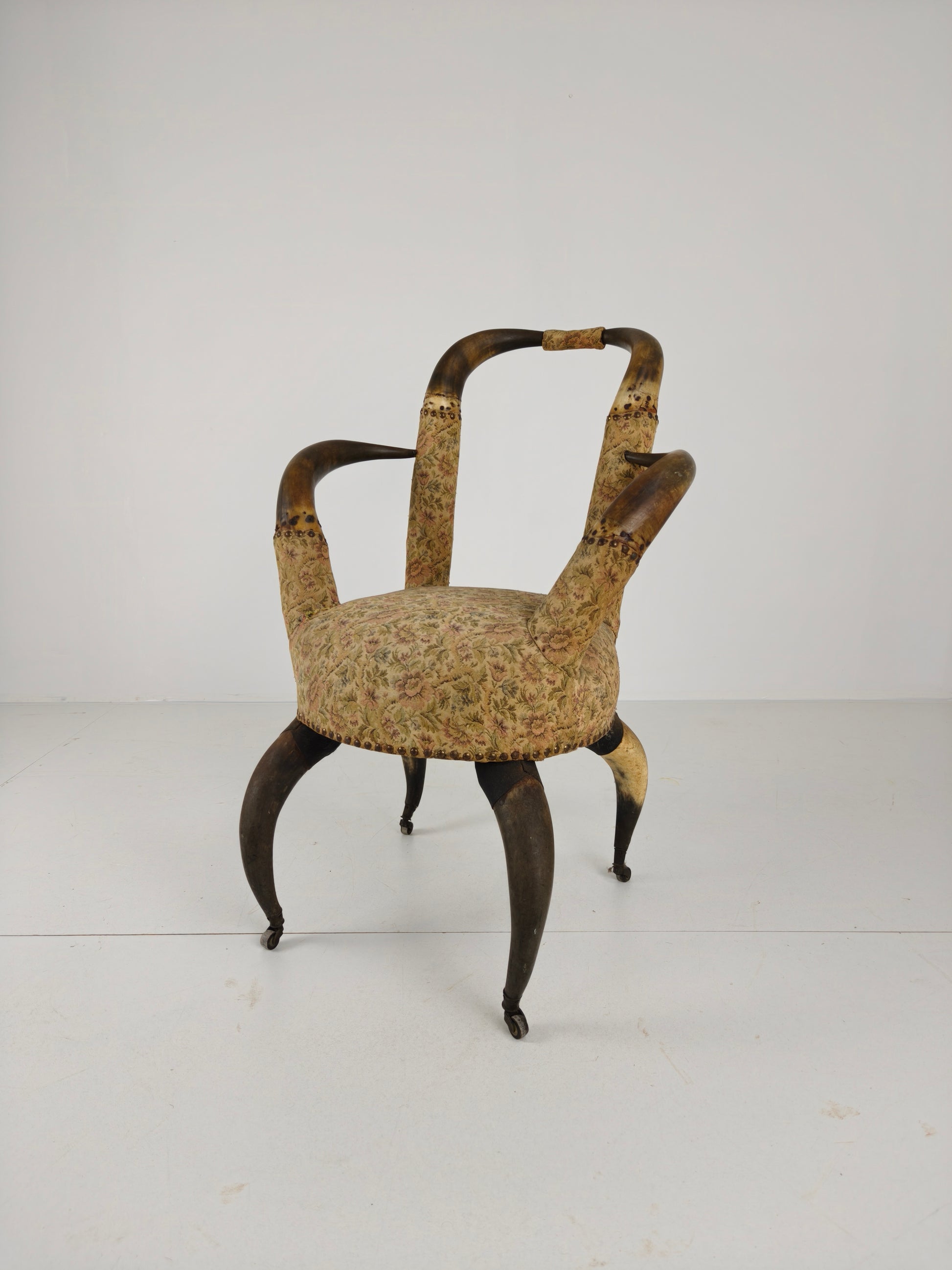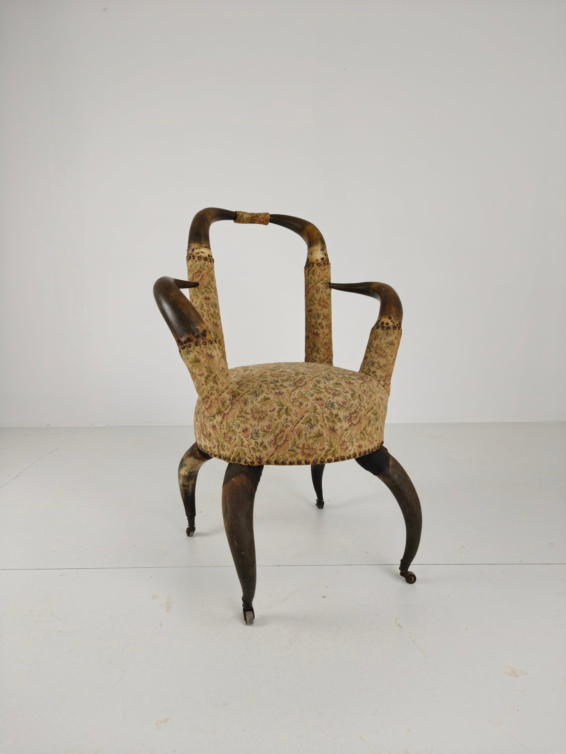 This extraordinary and fully original armchair from 1870 is an exceptional example of late 19th-century craftsmanship. Supported on its original brass castors, the chair combines both functionality and striking decoration. The seat is beautifully upholstered with a floral motif, transitioning seamlessly from the horns to the fabric, highlighted by a leather band around the upholstery. The piece exhibits natural wear consistent with age and use, adding to its character and charm (please see photos).