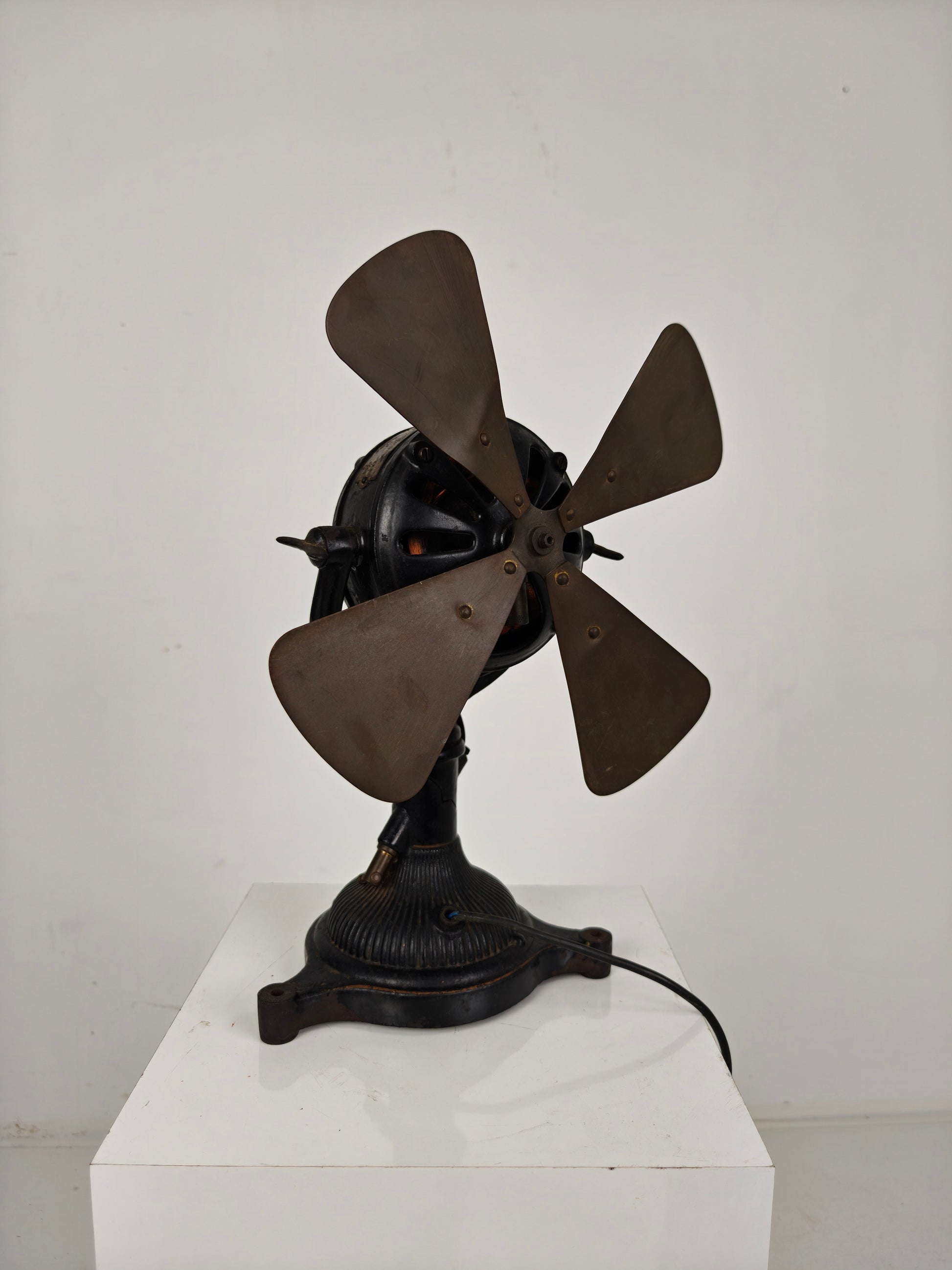 It features a solid cast iron housing, original brass blades, and the iconic Bergmann Berlin “B” emblem. Fully functional and running smoothly, this fan is not only a decorative statement but also a working piece of history that adds character to any interior, from industrial lofts to Art Deco settings.