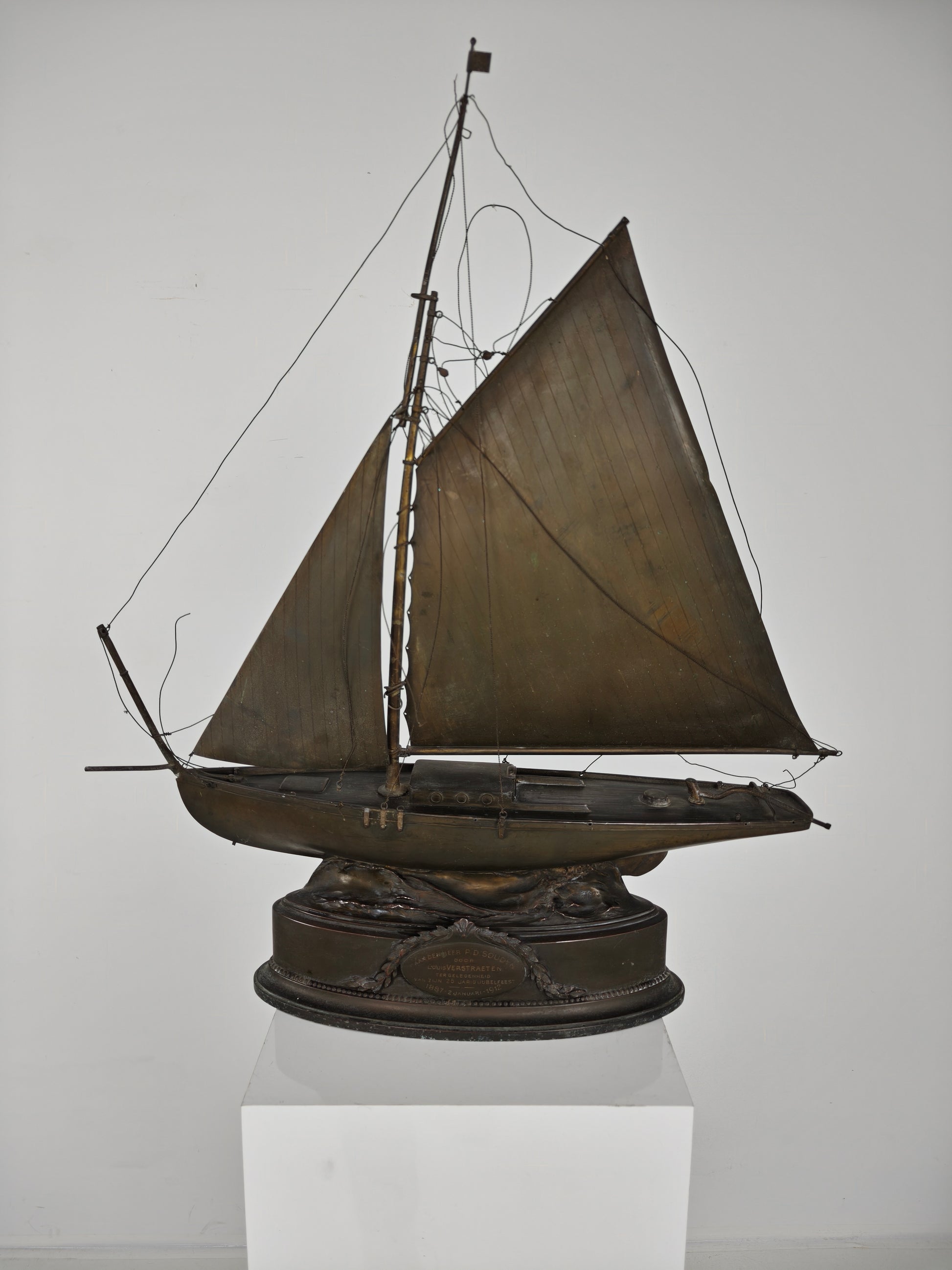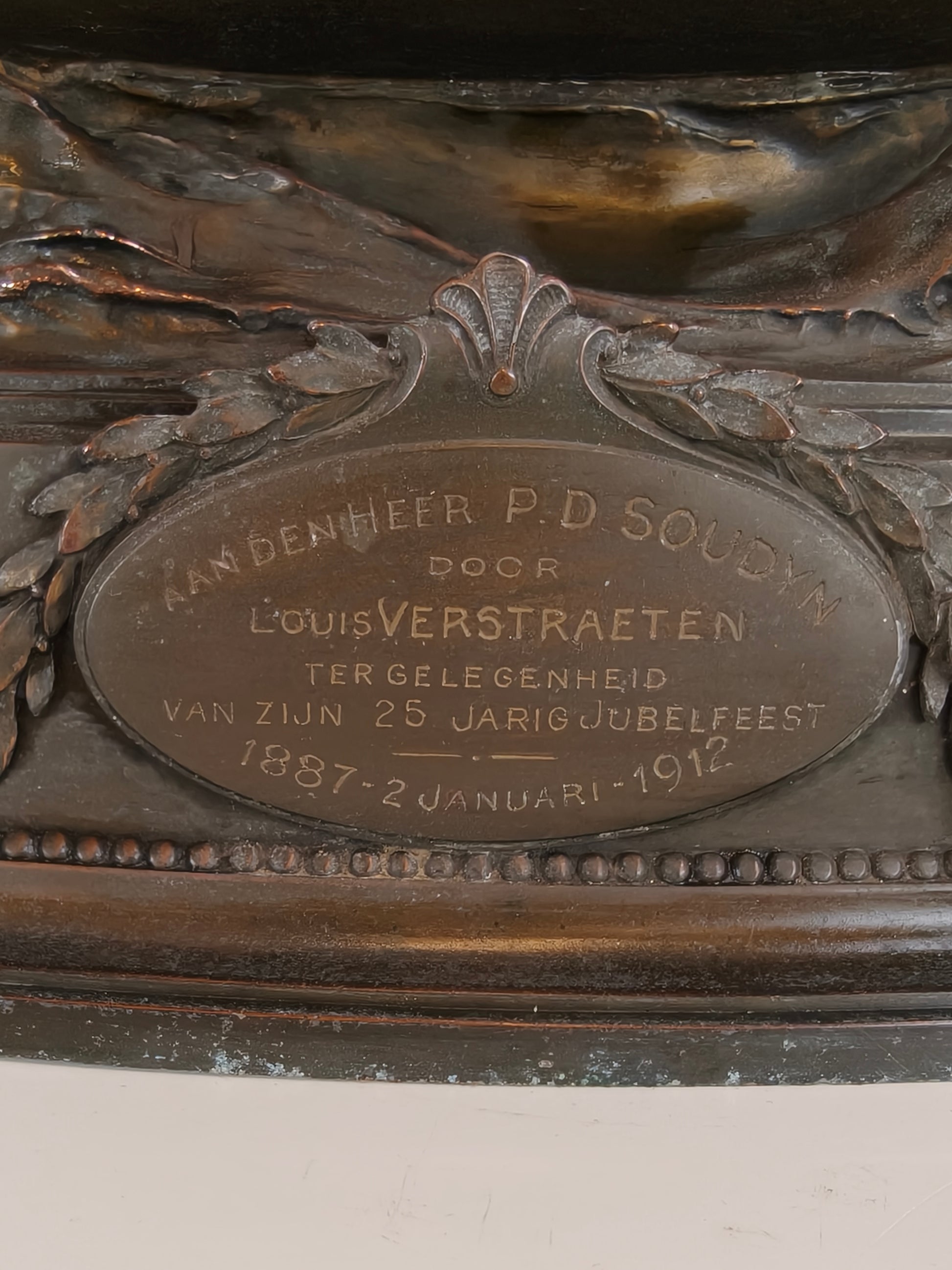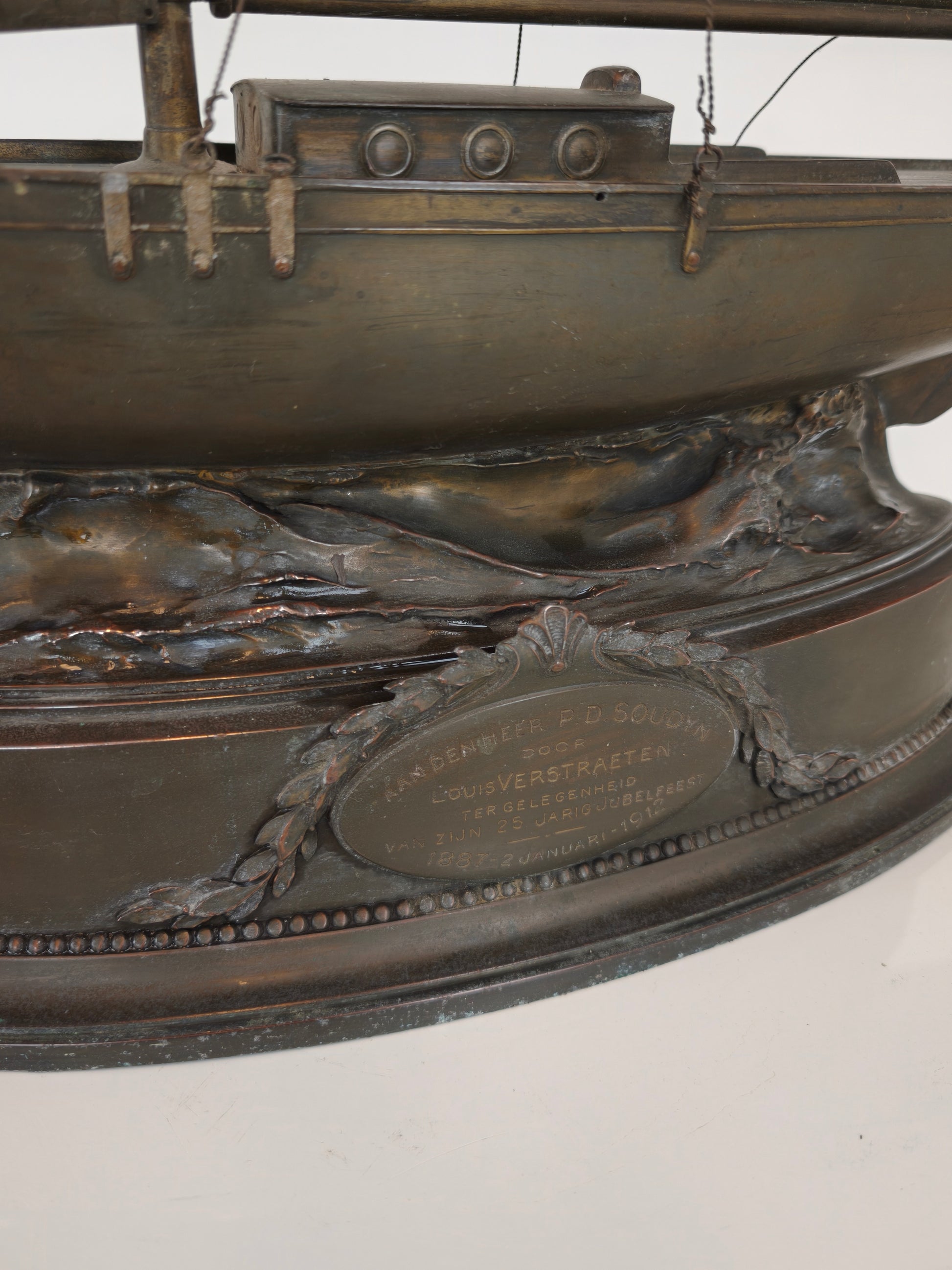 A remarkable brass sailing ship, entirely crafted from brass and signed in 1912 by Louis Verstraeten to Mr. P.D. Soudyn, commemorating his 25th anniversary (1887 – January 2, 1912). Now 113 years old, this piece remains a highly decorative object, retaining its original character and charm.