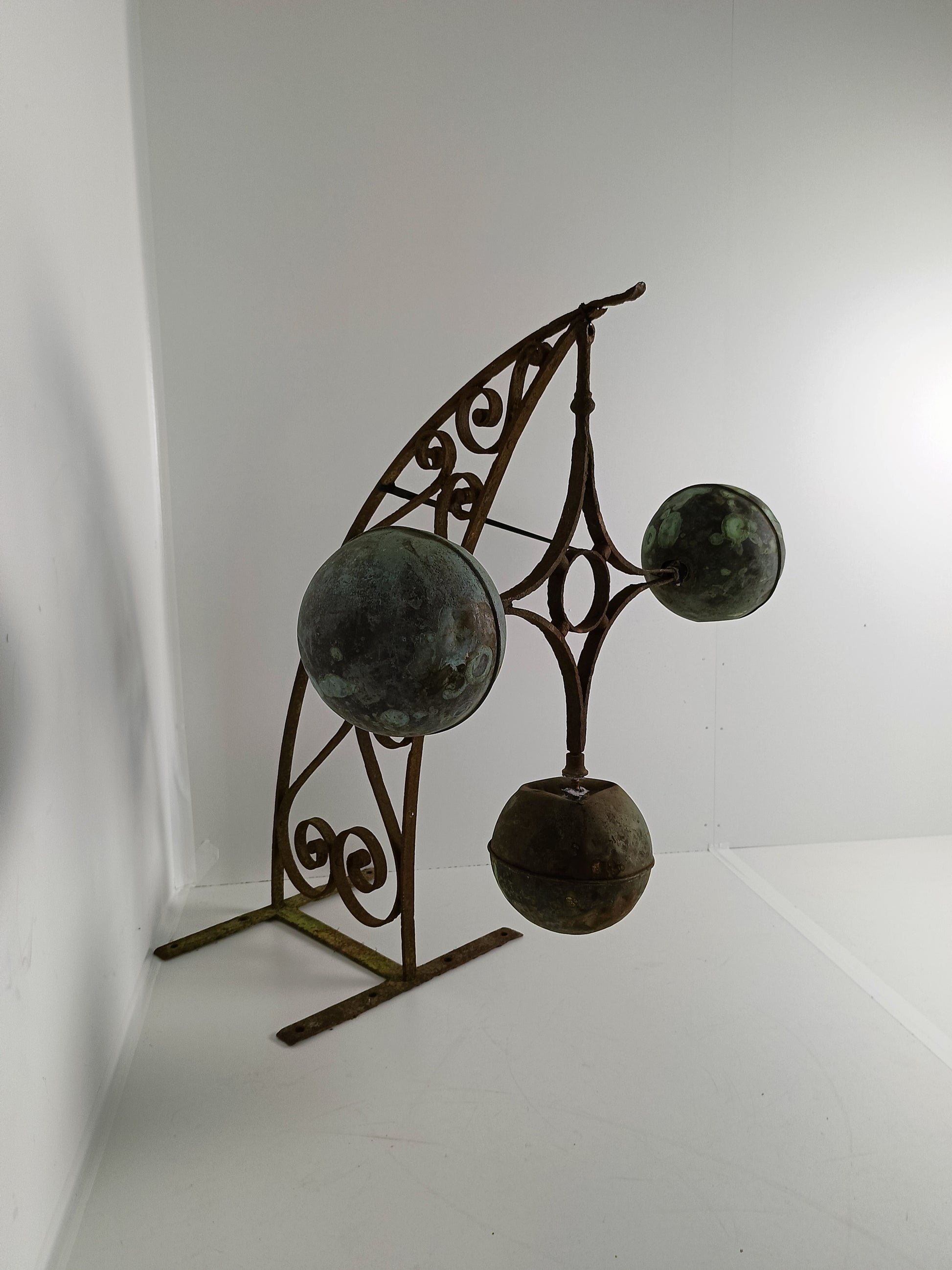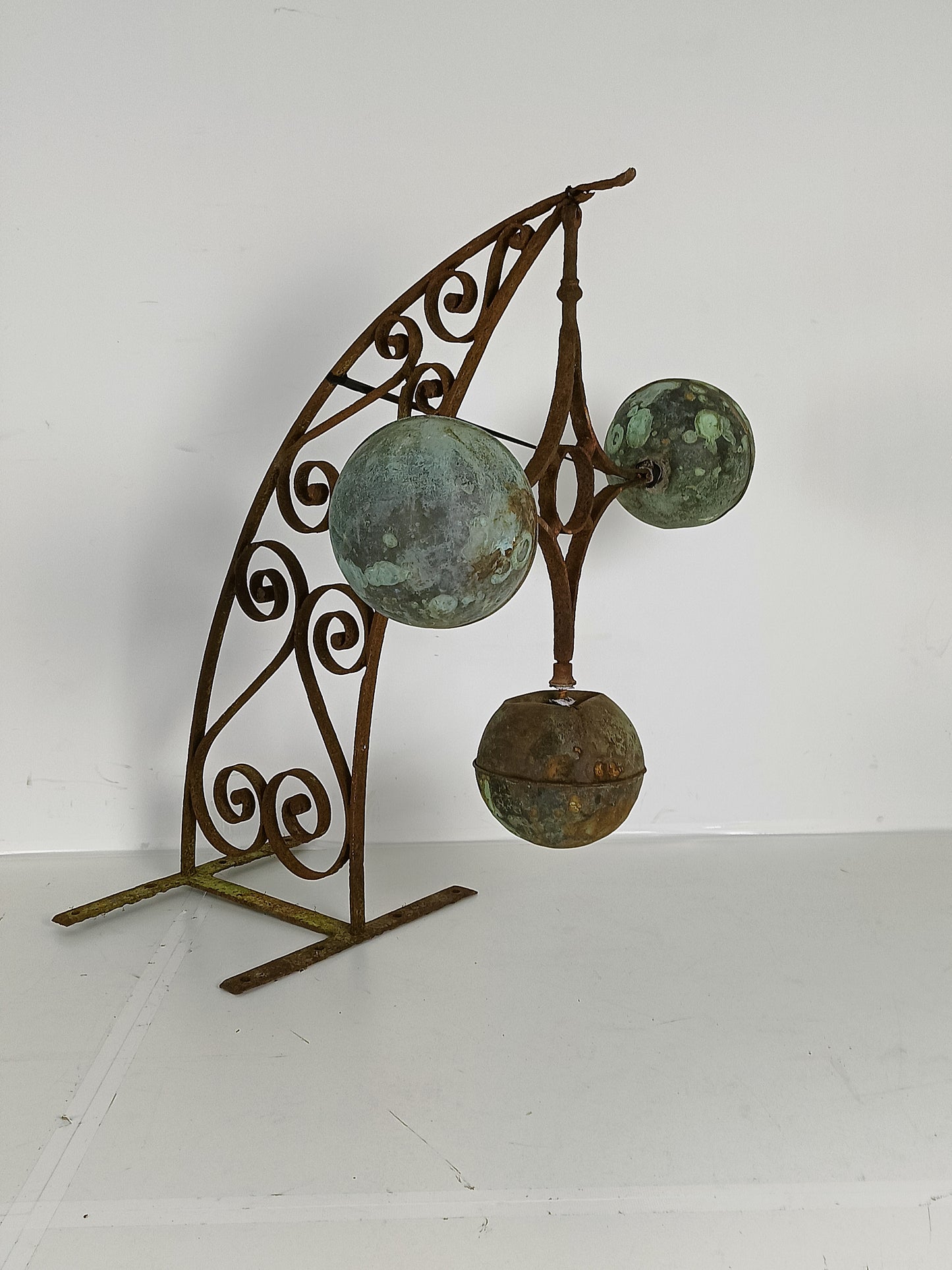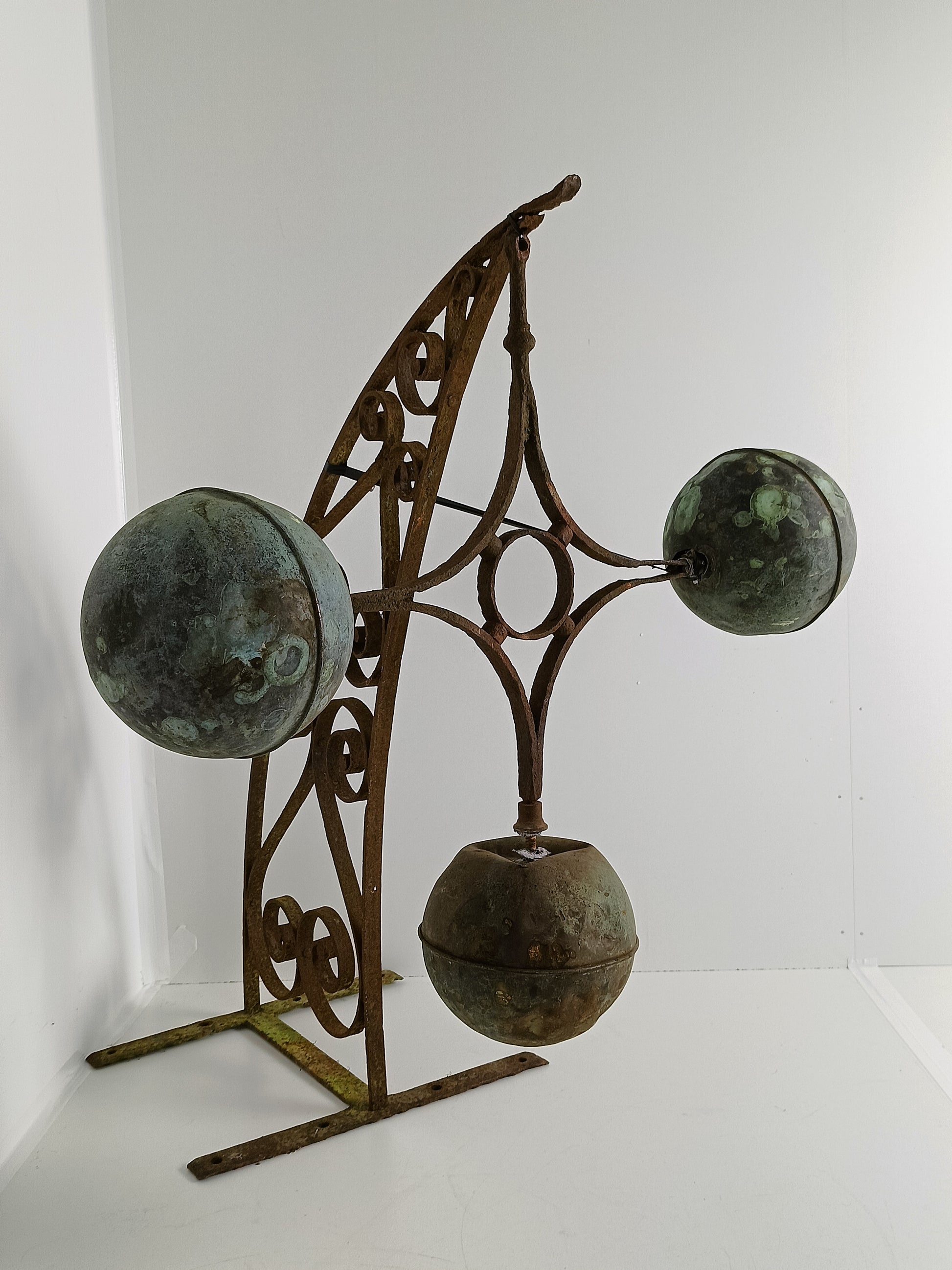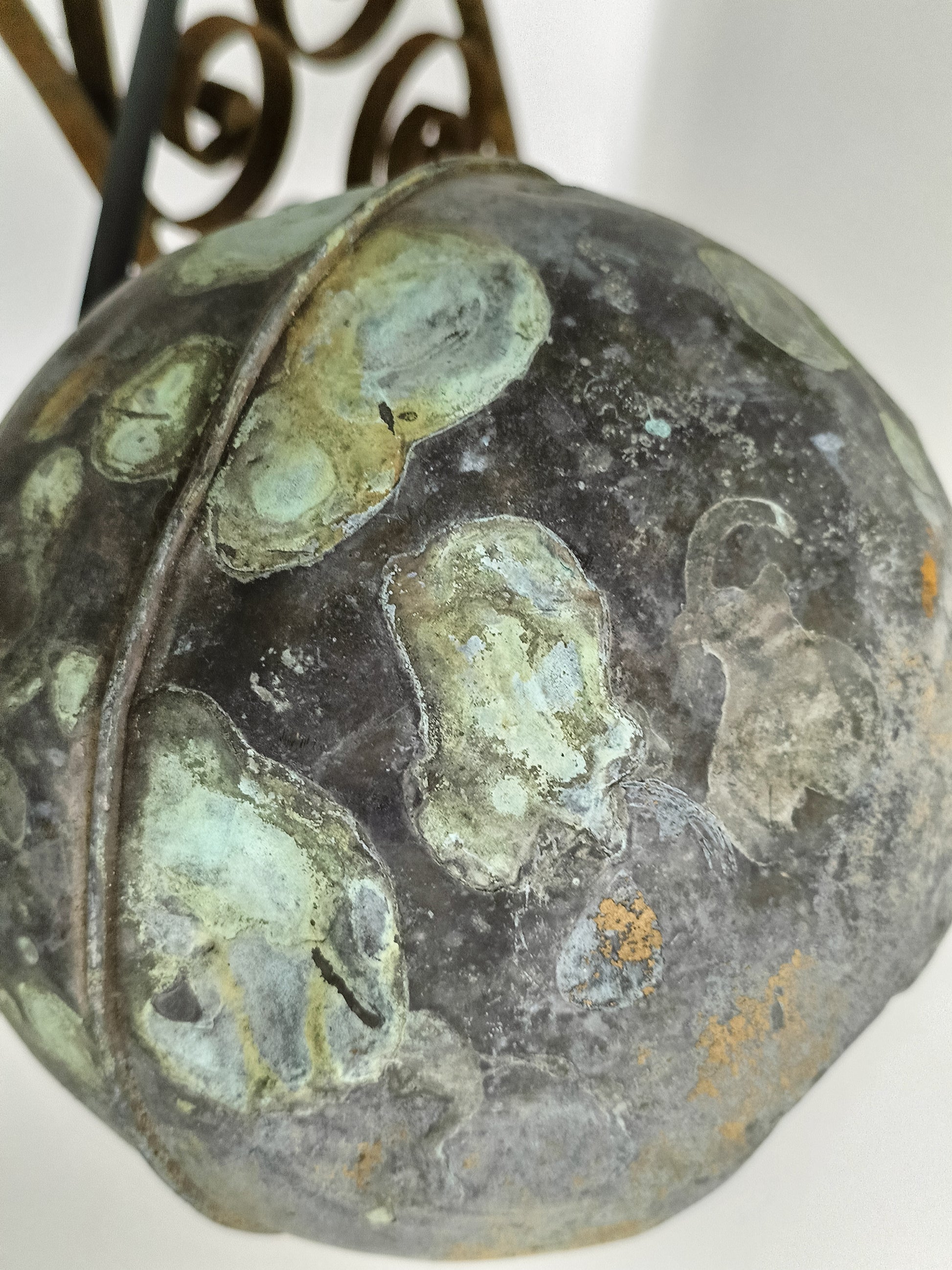 The piece retains its original verdigris copper balls, a rare and iconic feature, showing attractive age-related wear and some small dents consistent with its age and use (see photos).