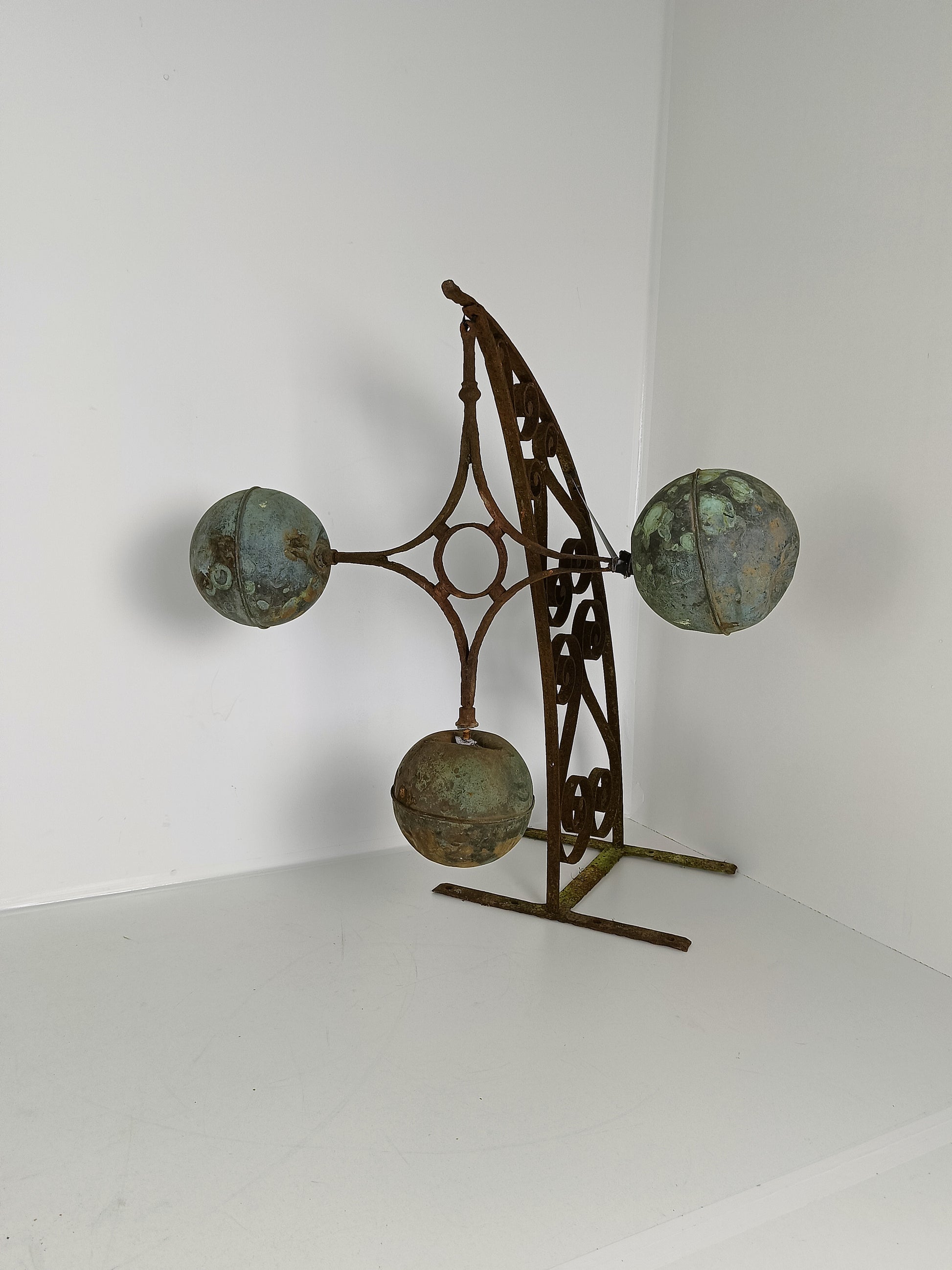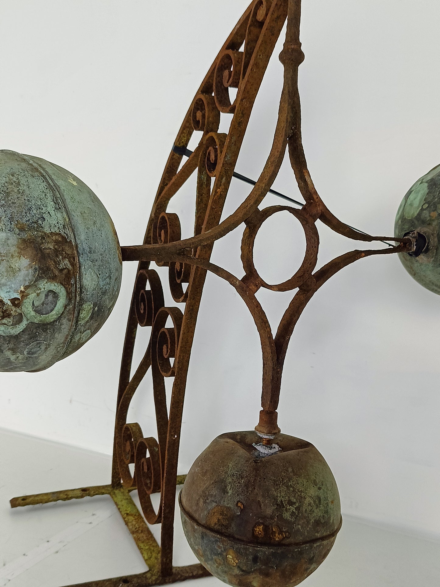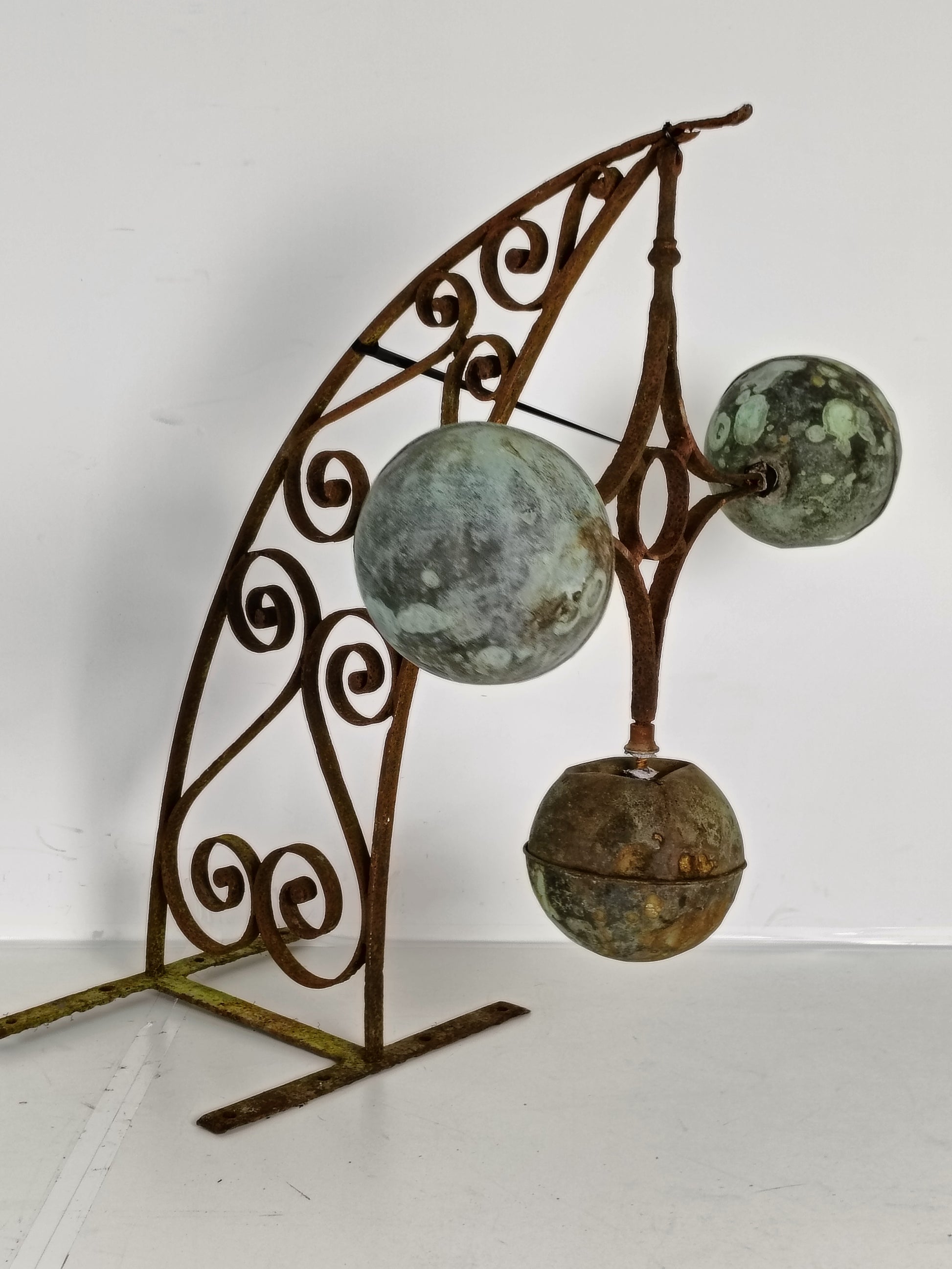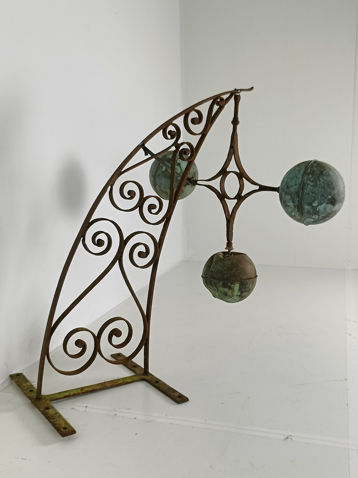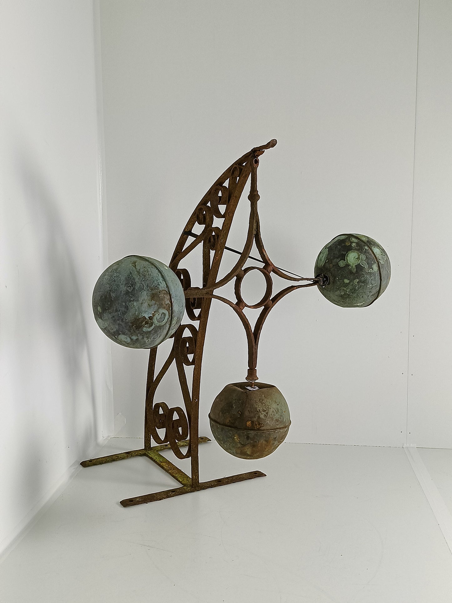 The piece retains its original verdigris copper balls, a rare and iconic feature, showing attractive age-related wear and some small dents consistent with its age and use (see photos).