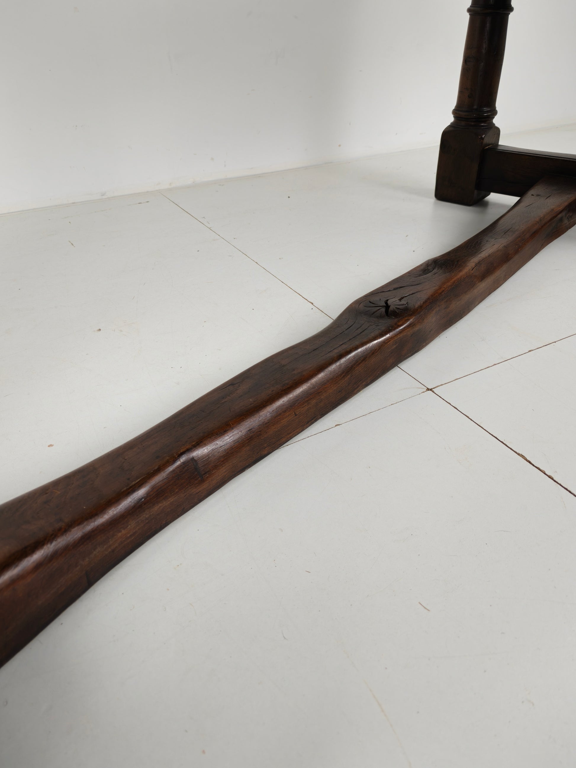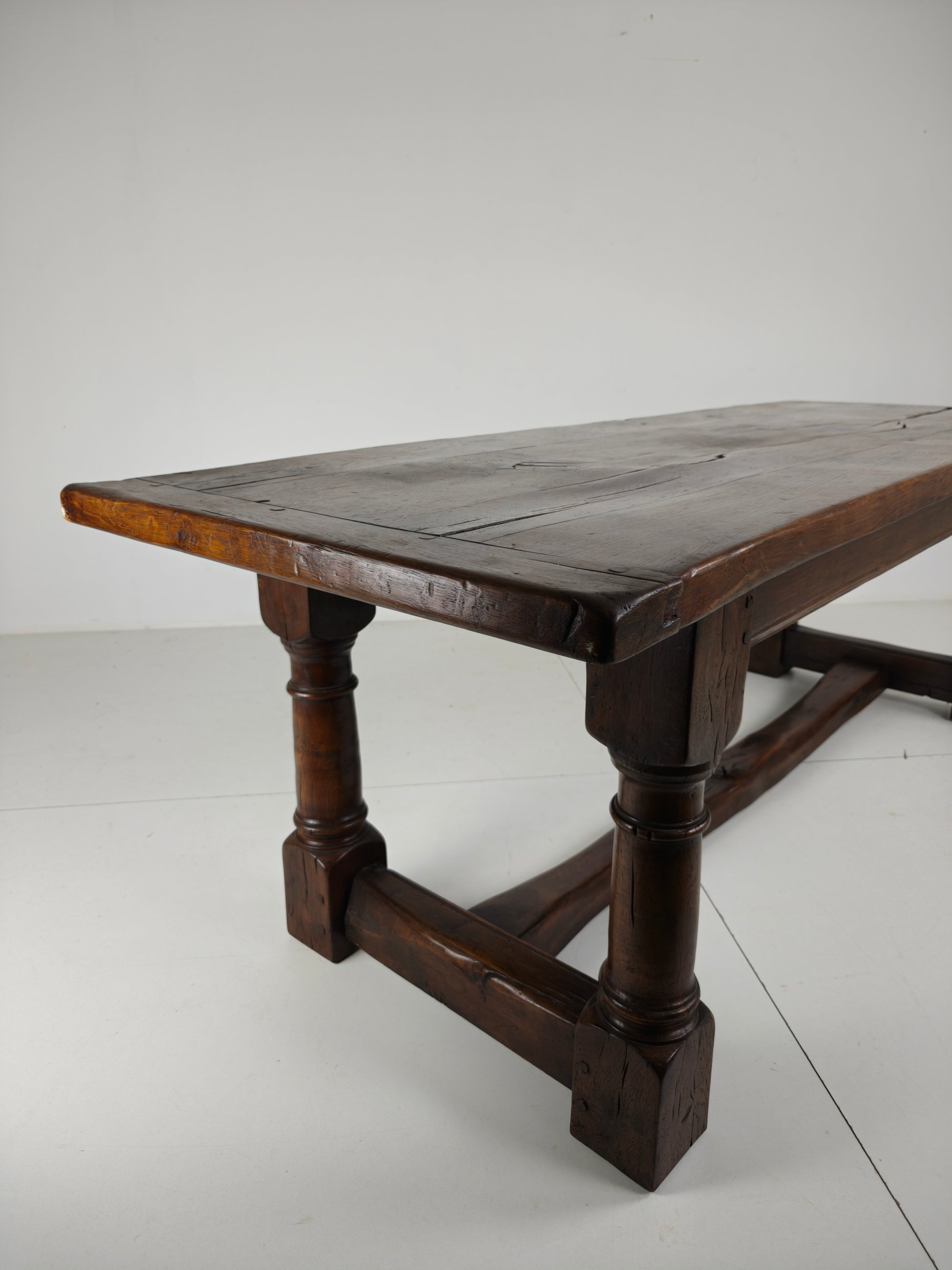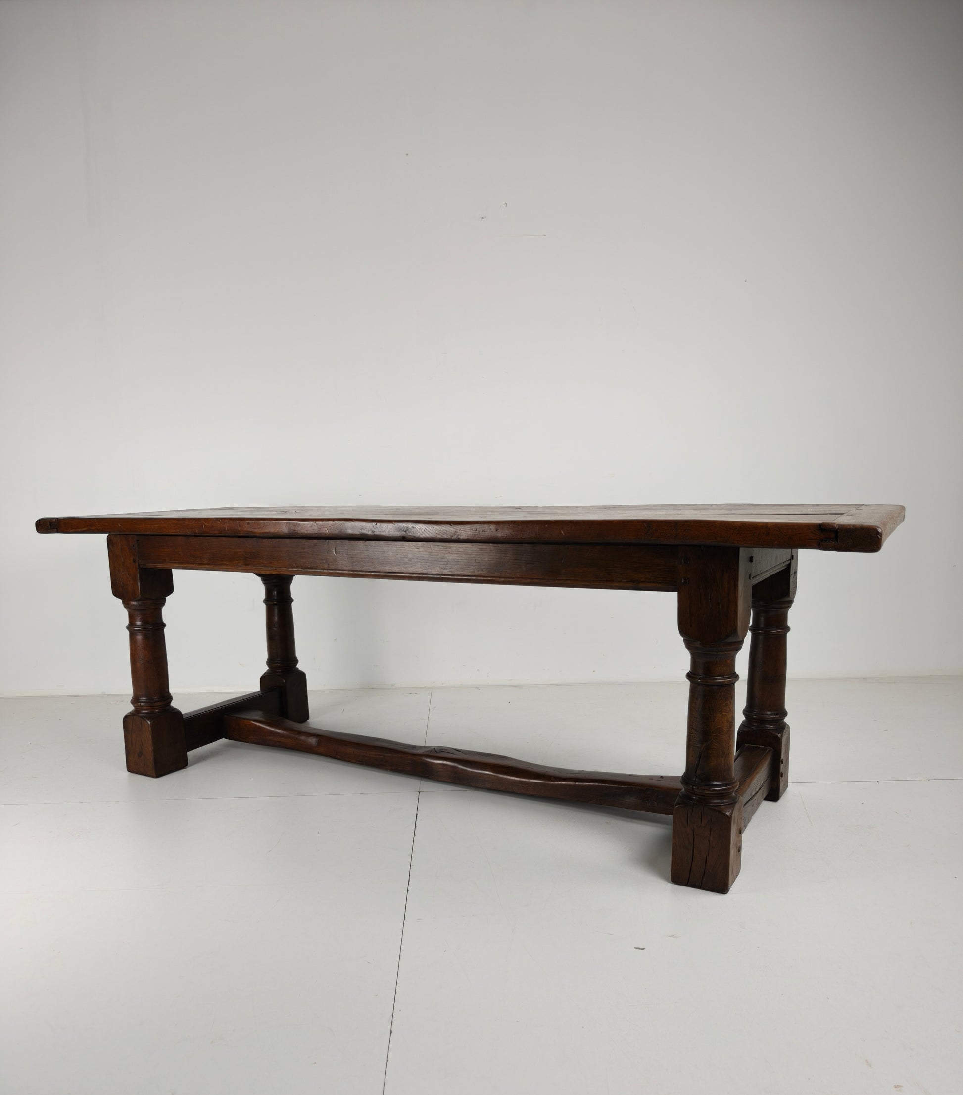 A handsome and sturdy English oak dining table made in the 20th century. Crafted from solid oak, the table showcases a beautifully grained top and a warm, natural patina that highlights the quality of the wood.