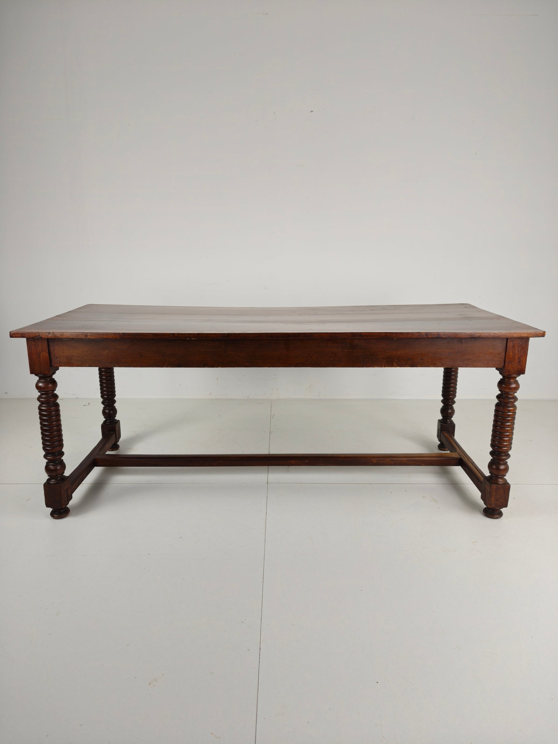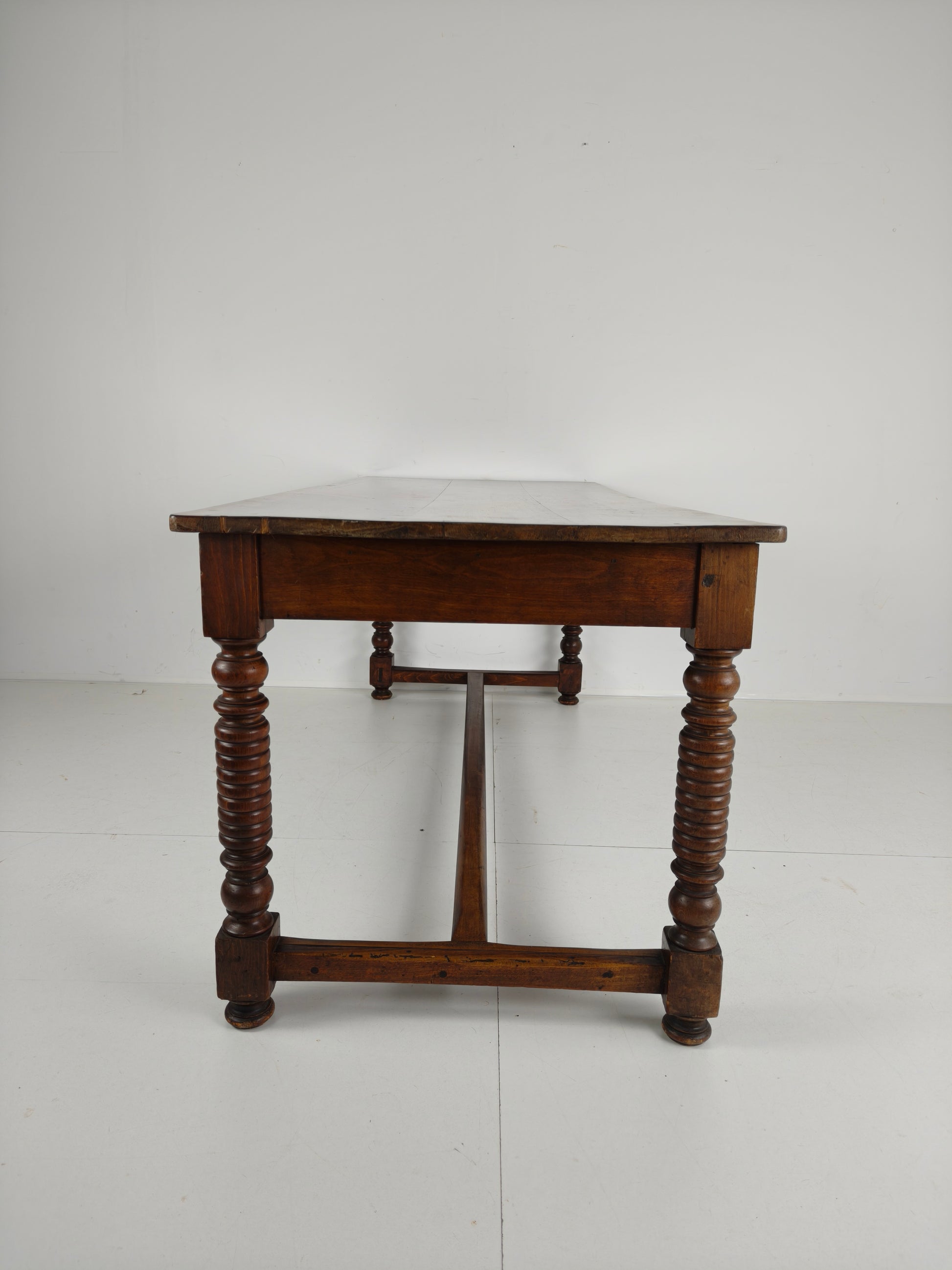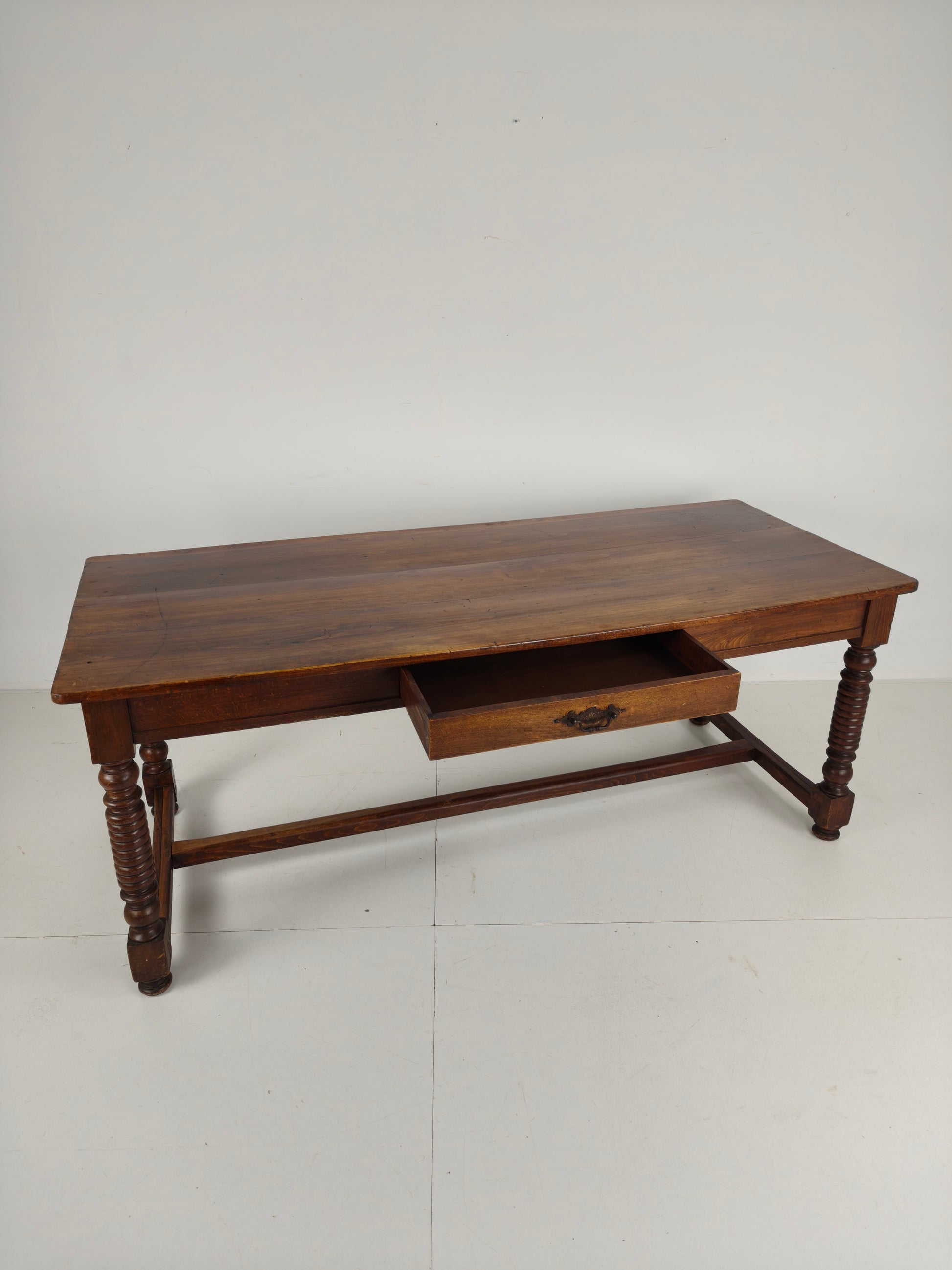 Made from high-quality wood, this table boasts a sturdy construction and a rich patina, It shows signs of wear consistent with age and use, adding to its authenticity and vintage appeal. The spacious tabletop offers plenty of room for family gatherings and elegant dinner parties, while the unique barley twist design adds a touch of sophistication and elegance.