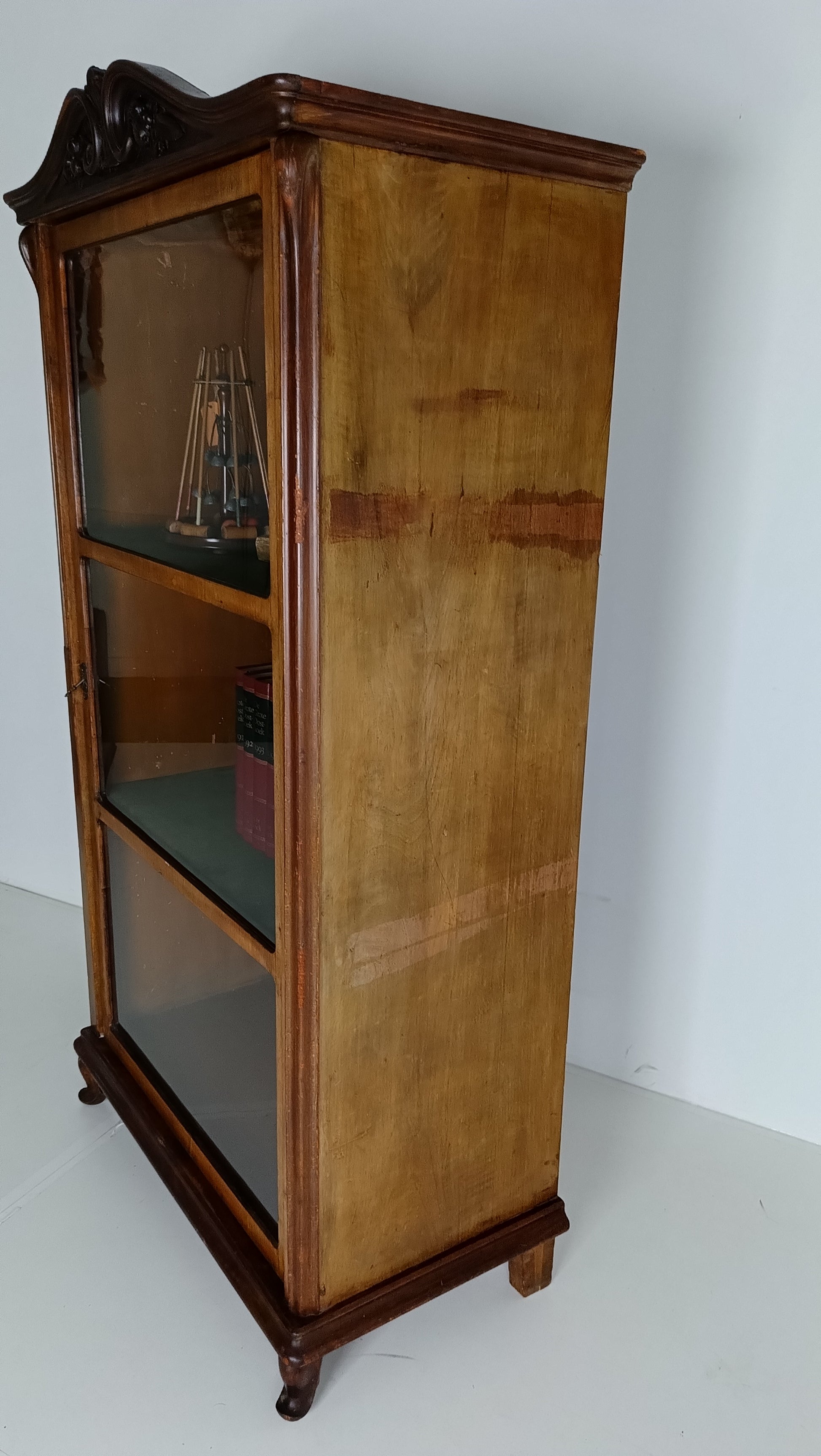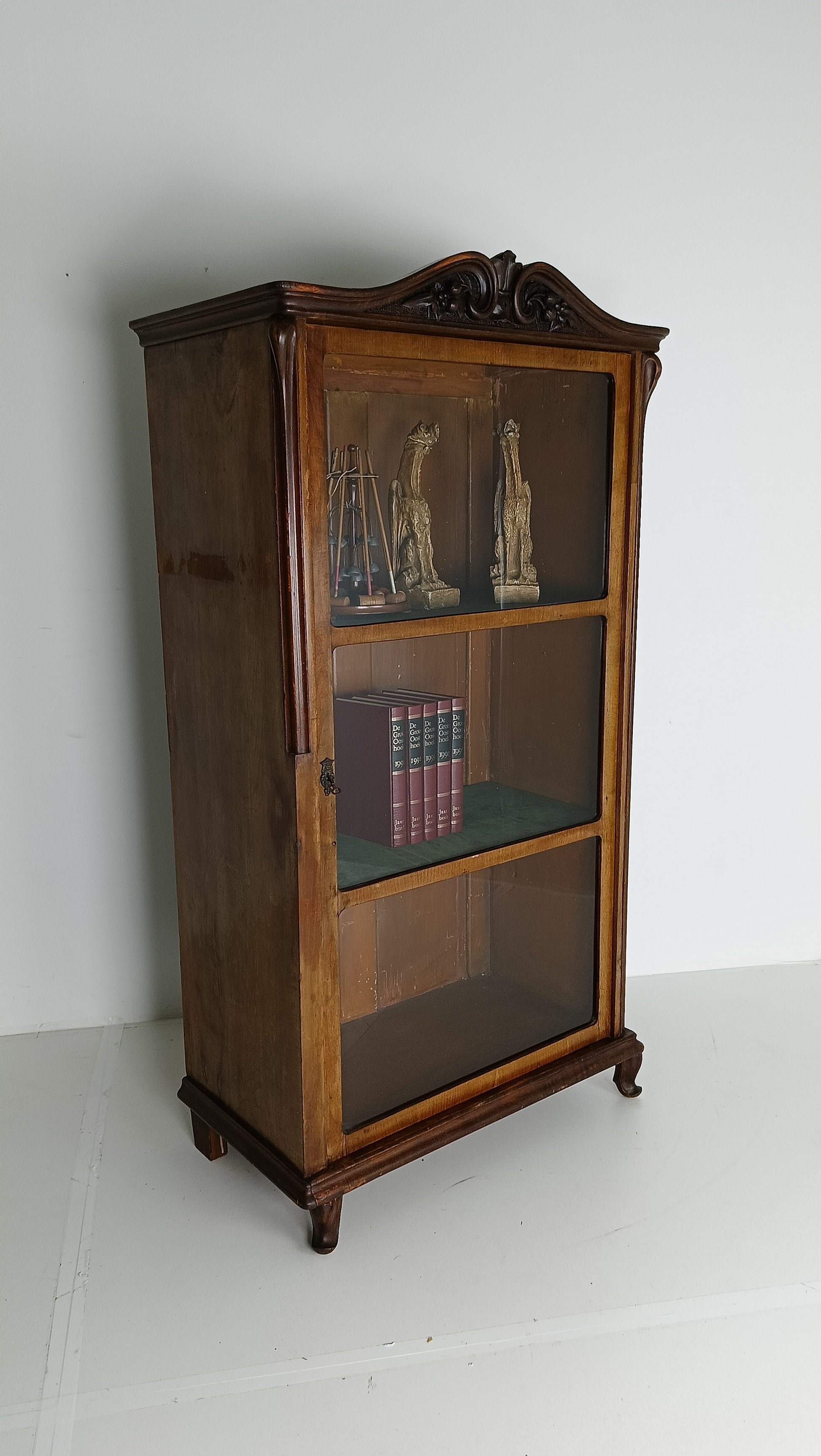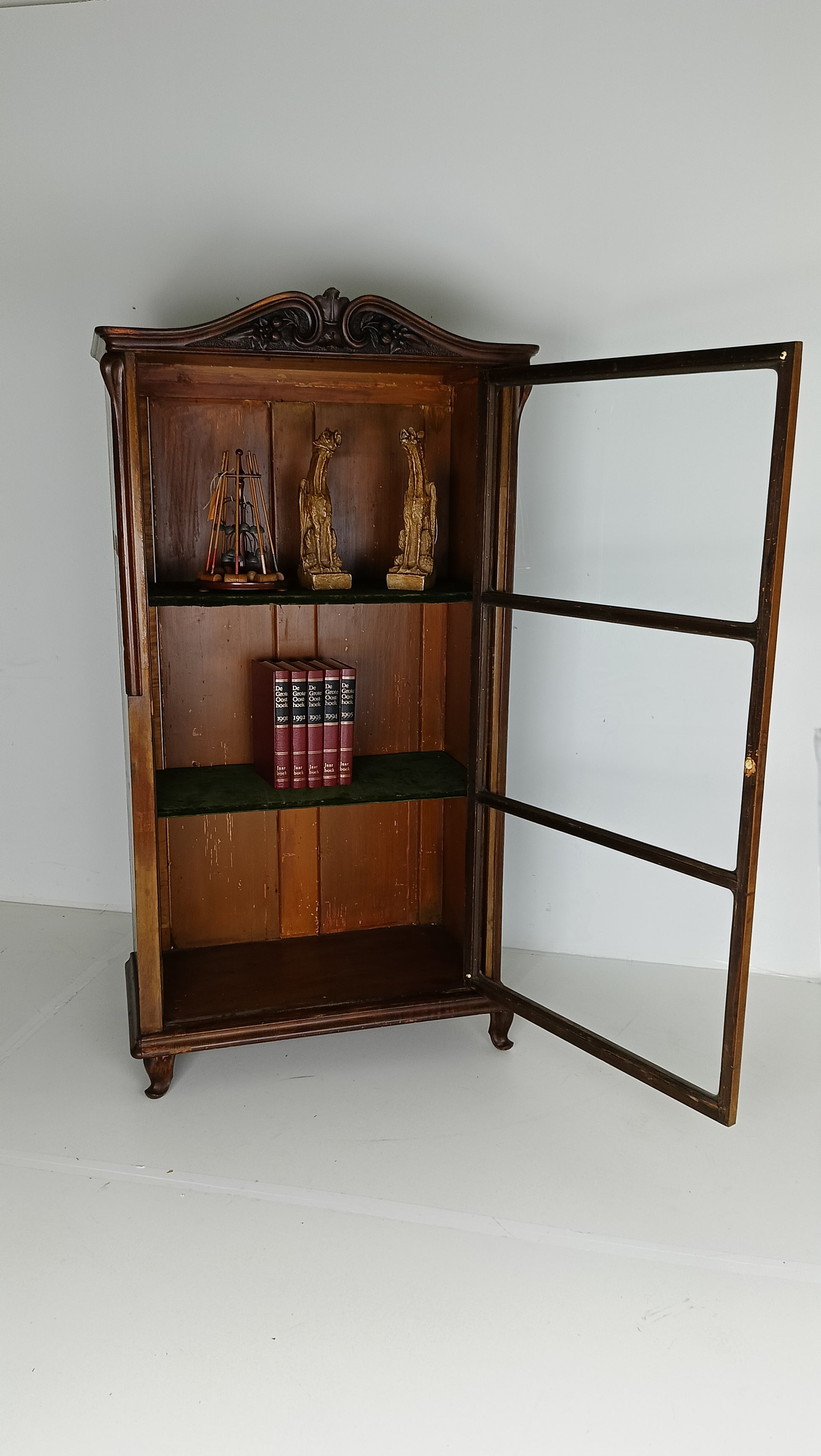 This antique display cabinet exudes charm and looks adorable. Its compact size makes it perfect for cozy spaces, while its vintage design adds a touch of elegance. Ideal for storing and displaying your cherished book collection. Has beautiful carved details in the woodworks. Has three shelves. Includes original key.