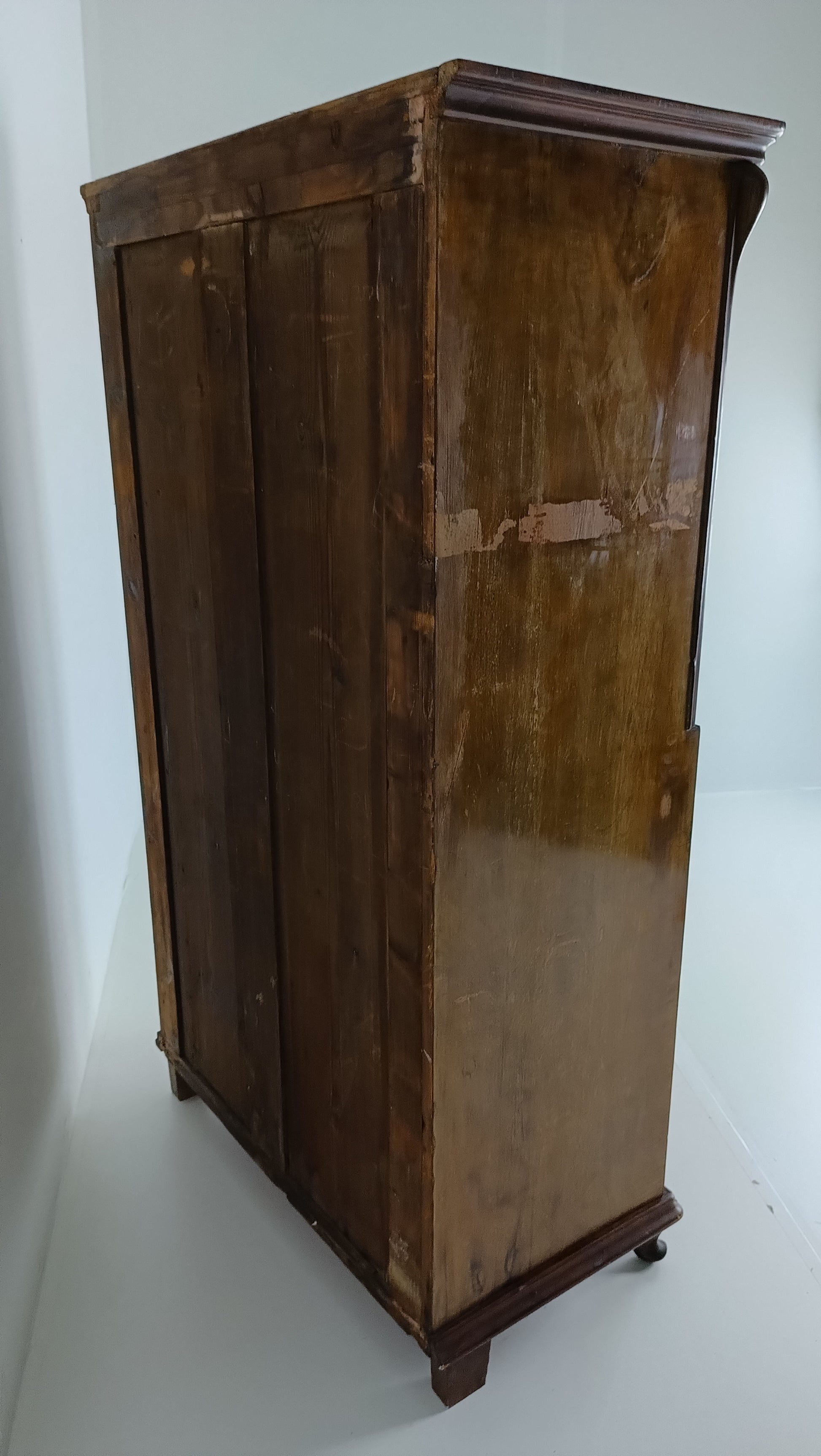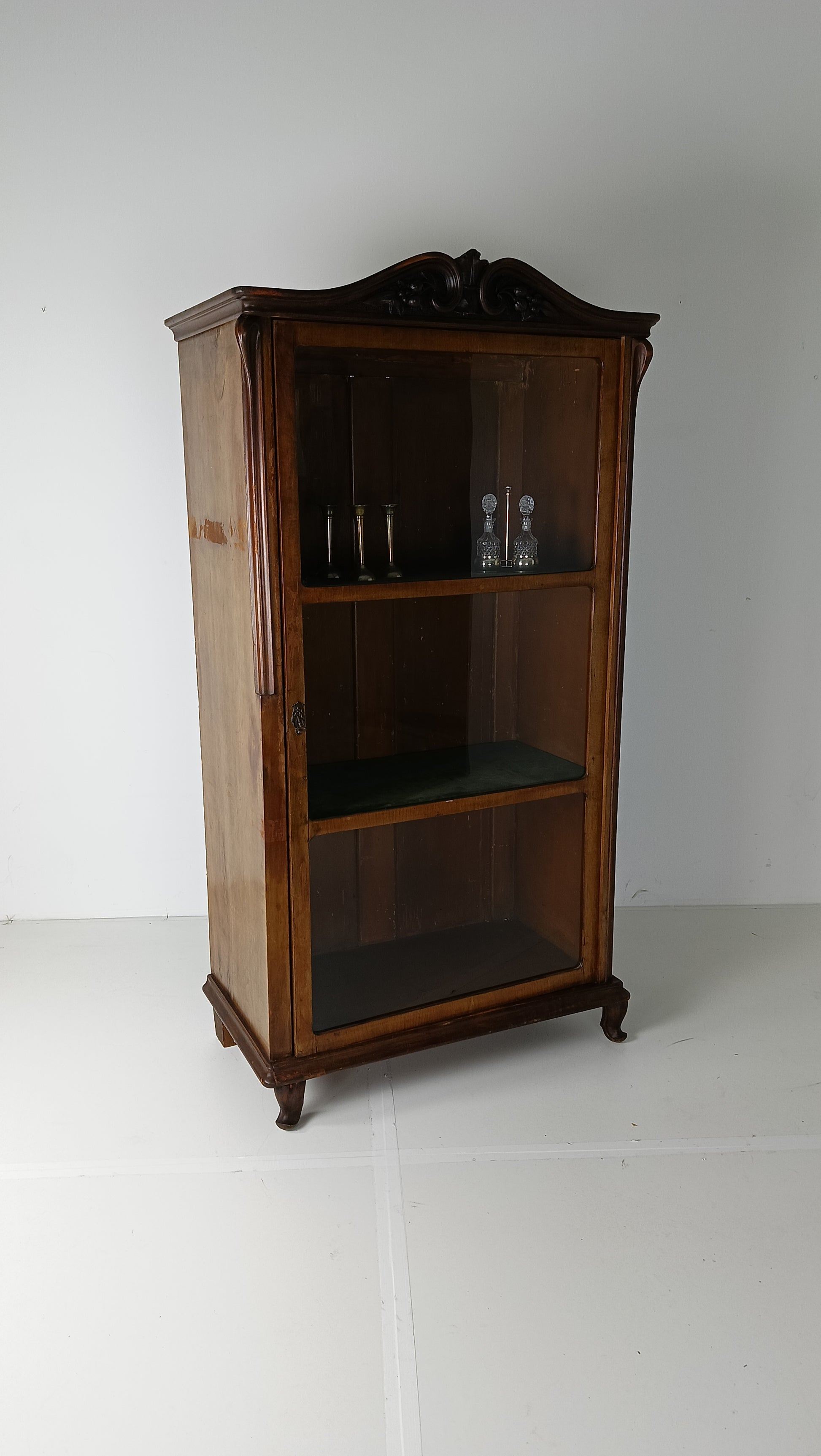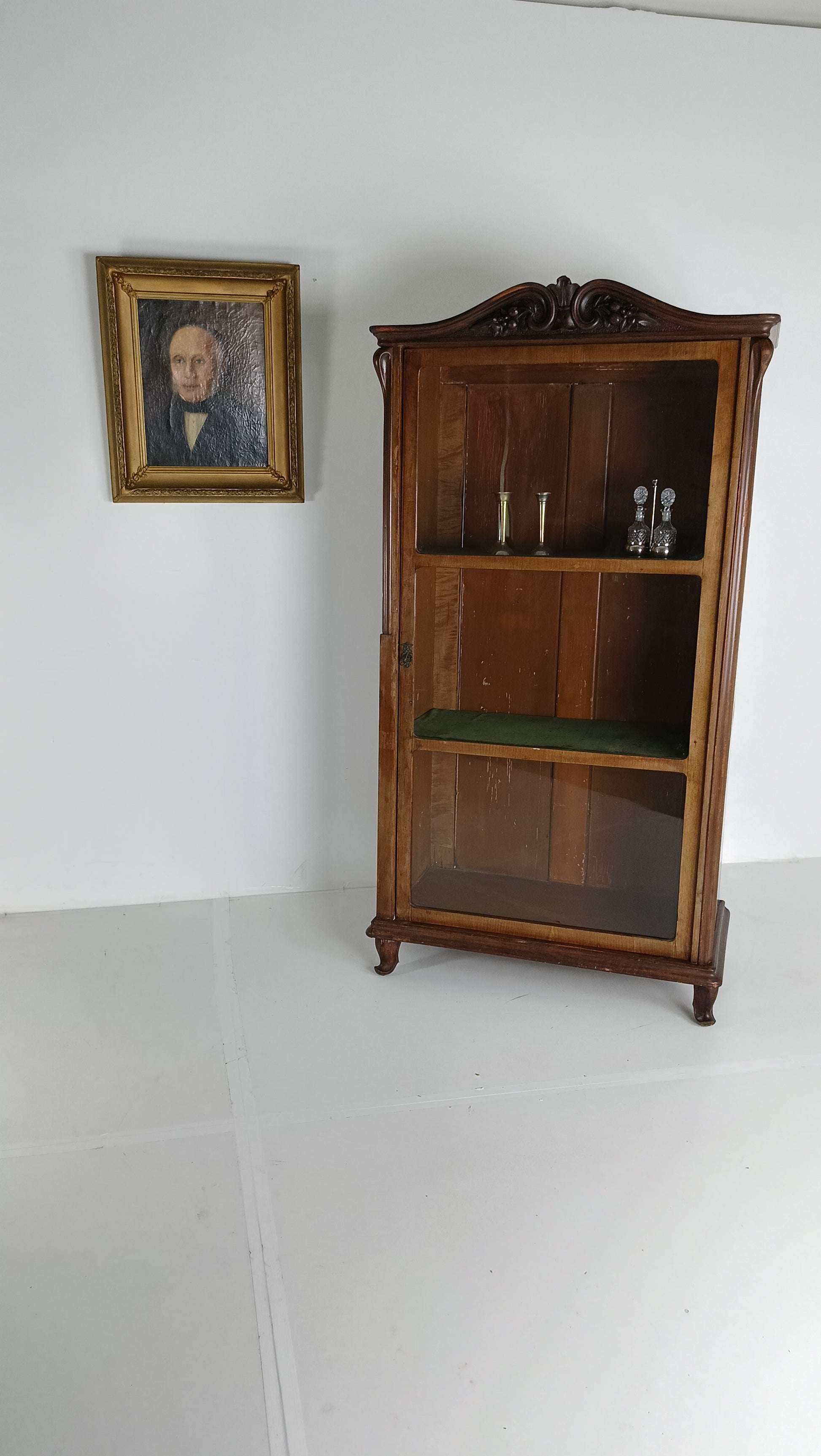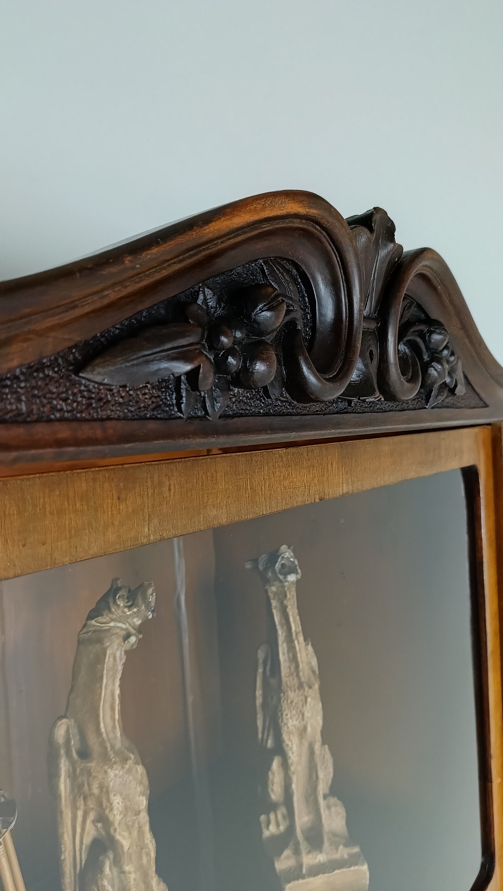 This antique display cabinet exudes charm and looks adorable. Its compact size makes it perfect for cozy spaces, while its vintage design adds a touch of elegance. Ideal for storing and displaying your cherished book collection. Has beautiful carved details in the woodworks. Has three shelves. Includes original key.