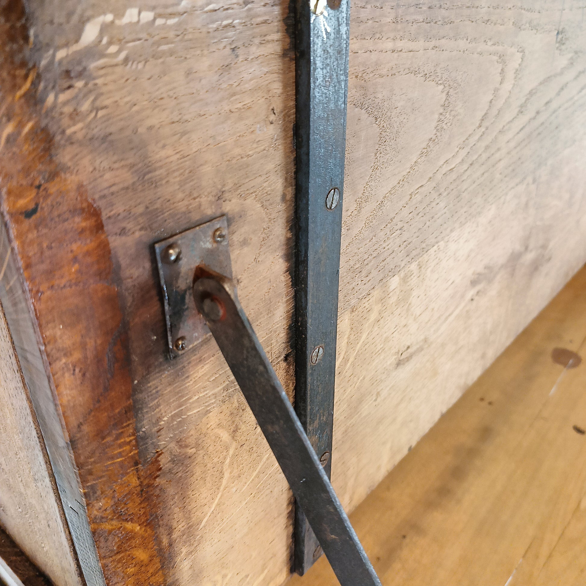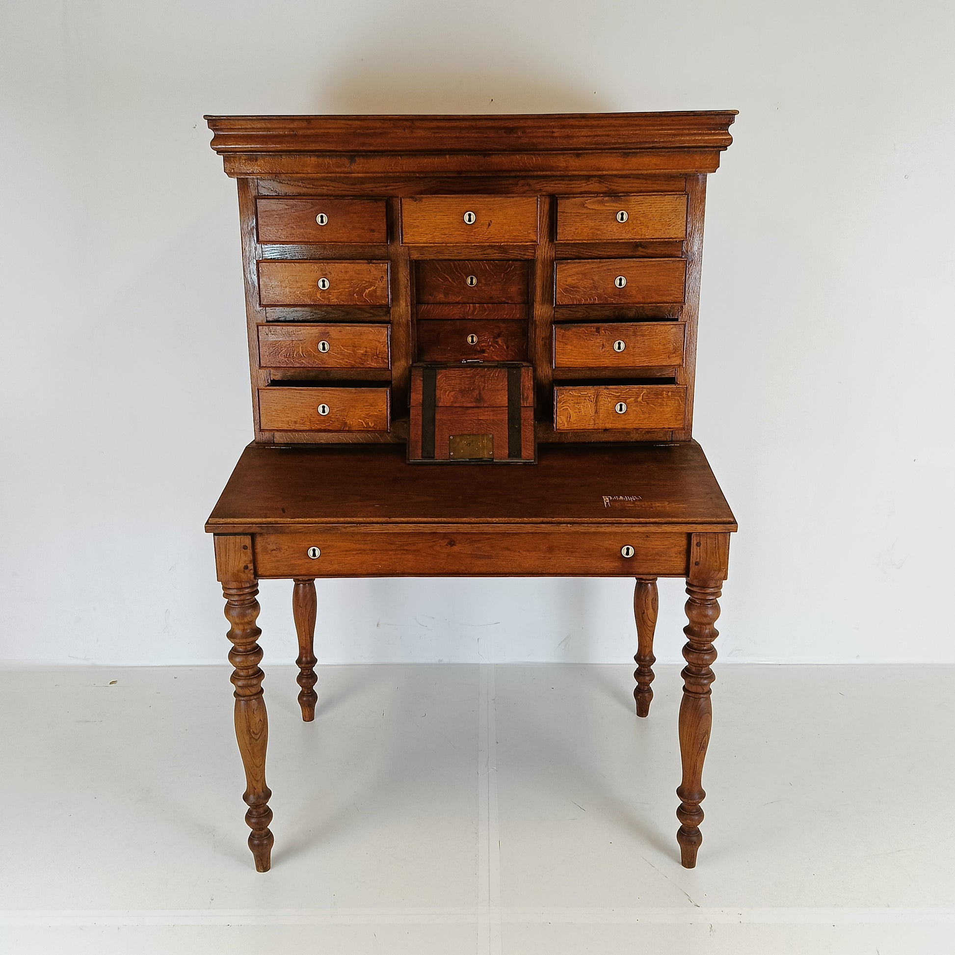 An antique notary desk is a specialized piece of furniture designed for official notarial duties, typically from the 19th century, circa 1830-1850. These desks often feature multiple compartments, for organizing documents and a lockable section to secure important papers. One unique feature found in some antique notary desks (like this one) is a built-in locked safe, designed to store valuable items securely. Often, these safes were equipped with a small bell mechanism that would ring when the safe was opened, adding an extra layer of security to alert the notary or office owner. Has signs of wear and patina consistant with age and use. One of the backlegs has been professionally restored.
