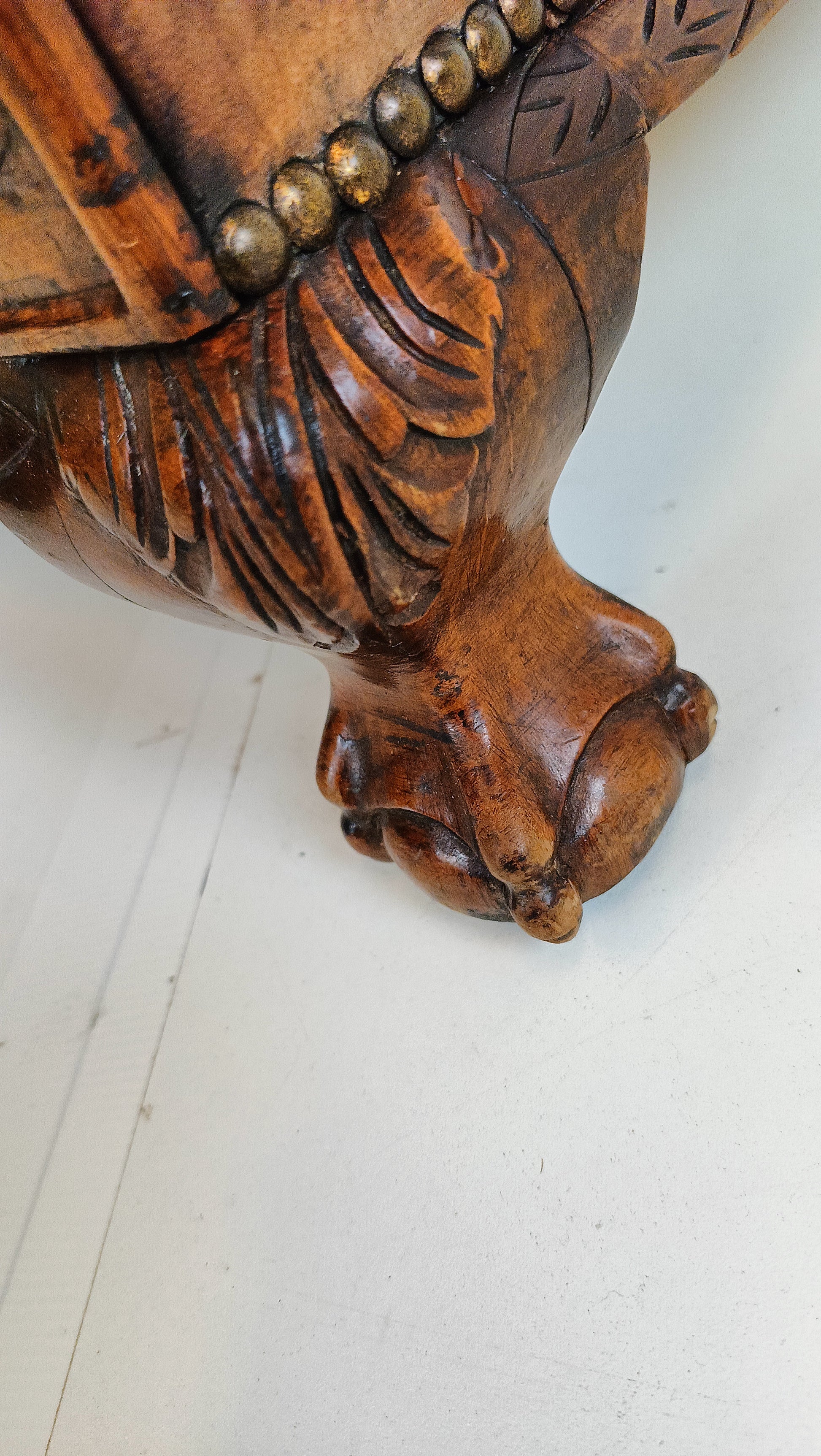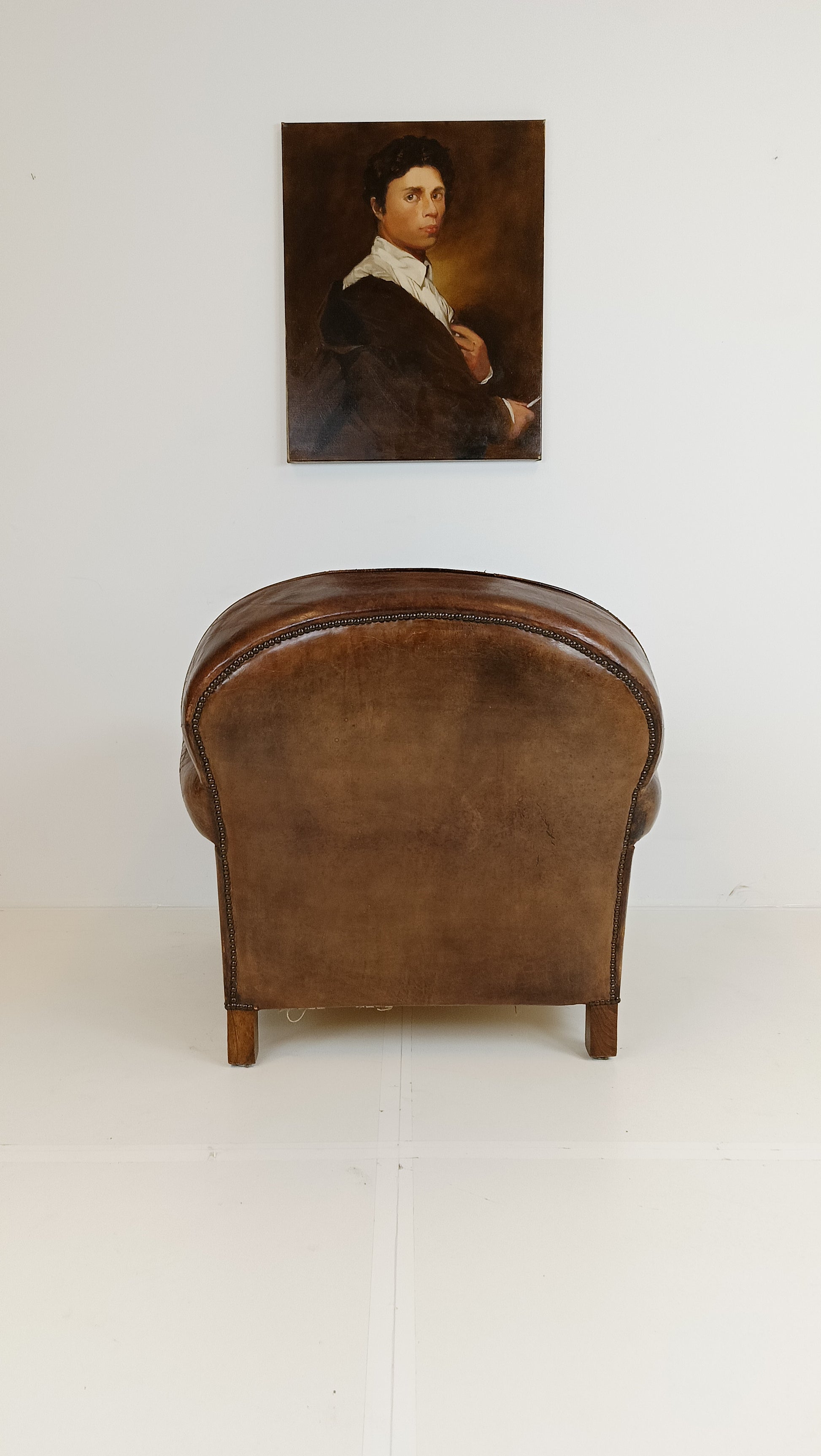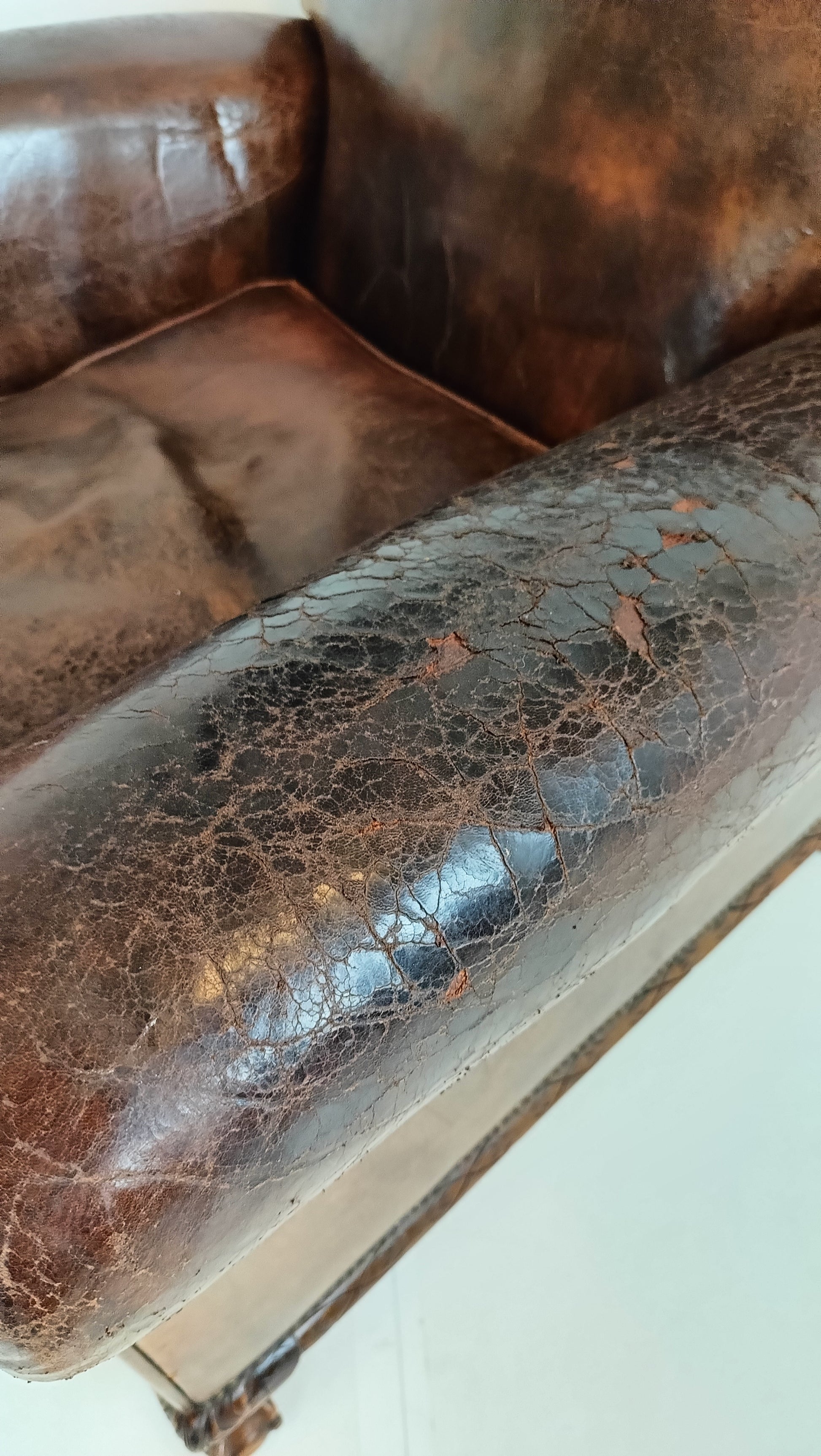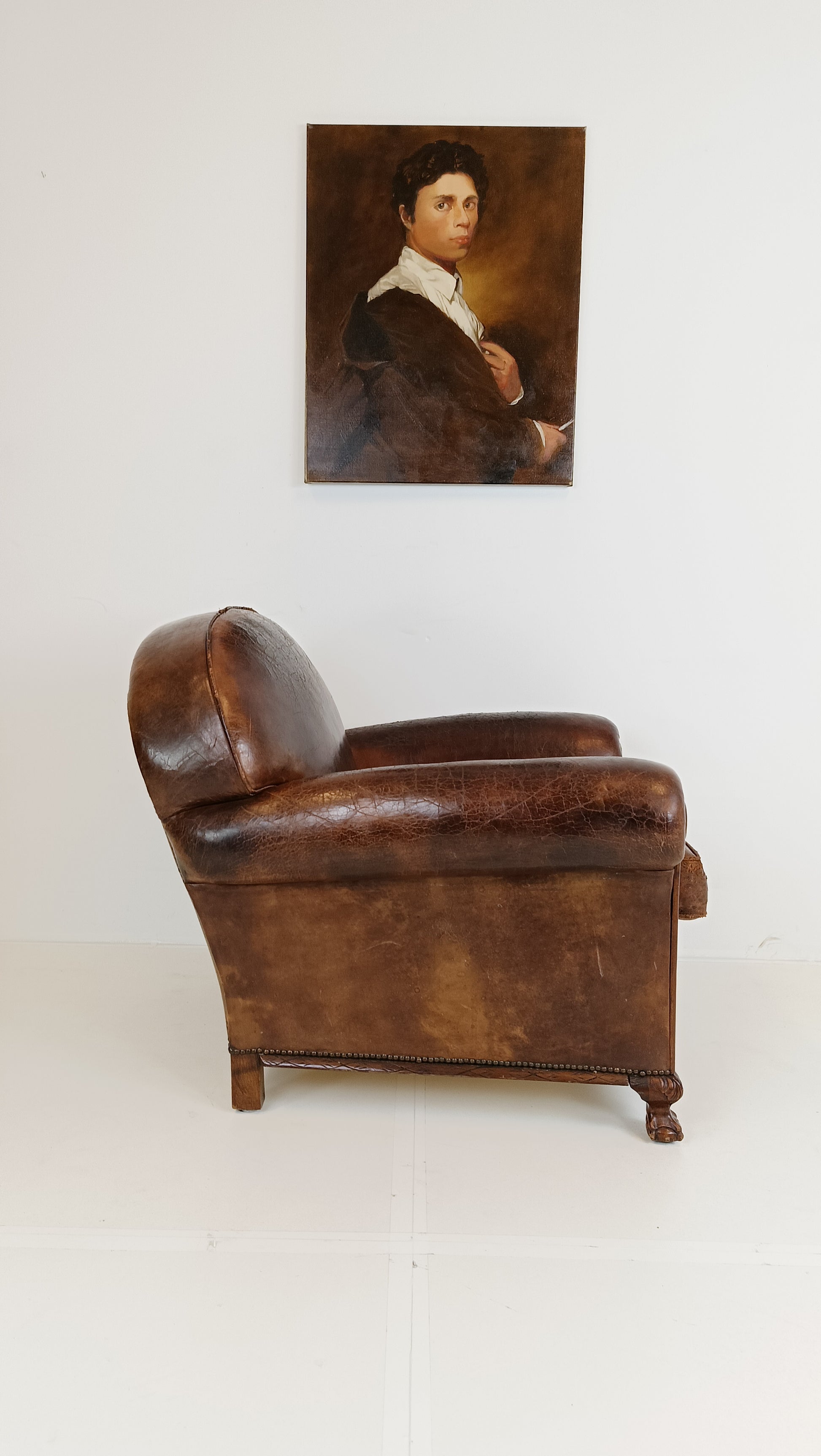 Not much words needed for this stunning piece. Classic sheep leather club chair. Has amazing carved wooden details. Signs of patina and wear constant with age and usage, shown on pictures. Made around 1920's, unique find.