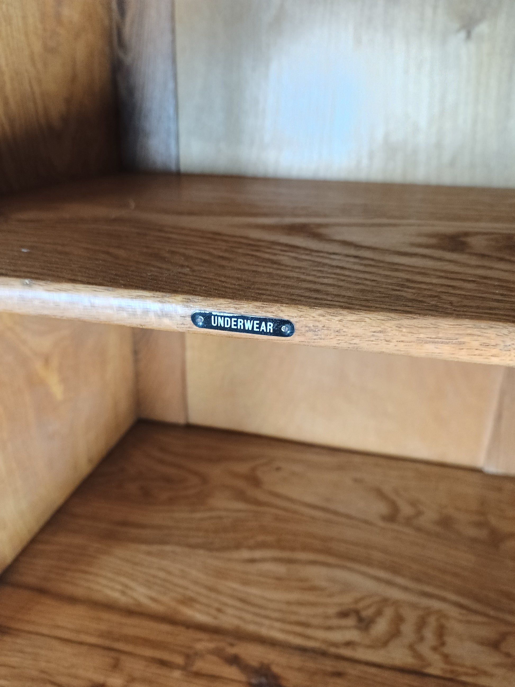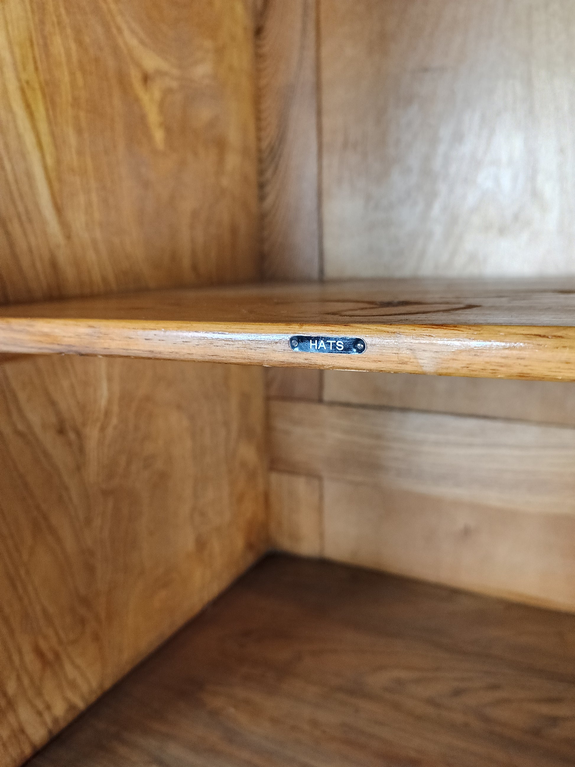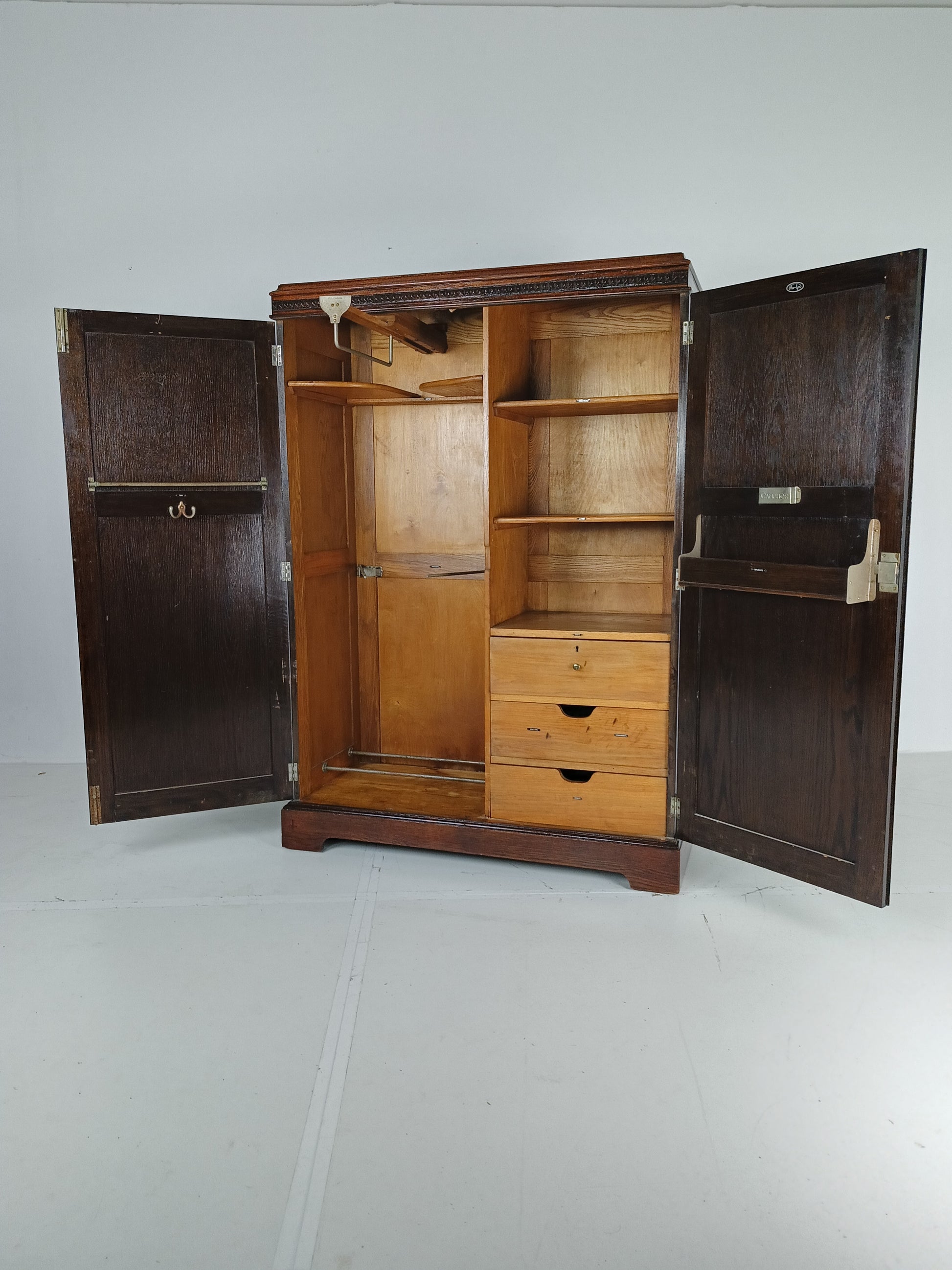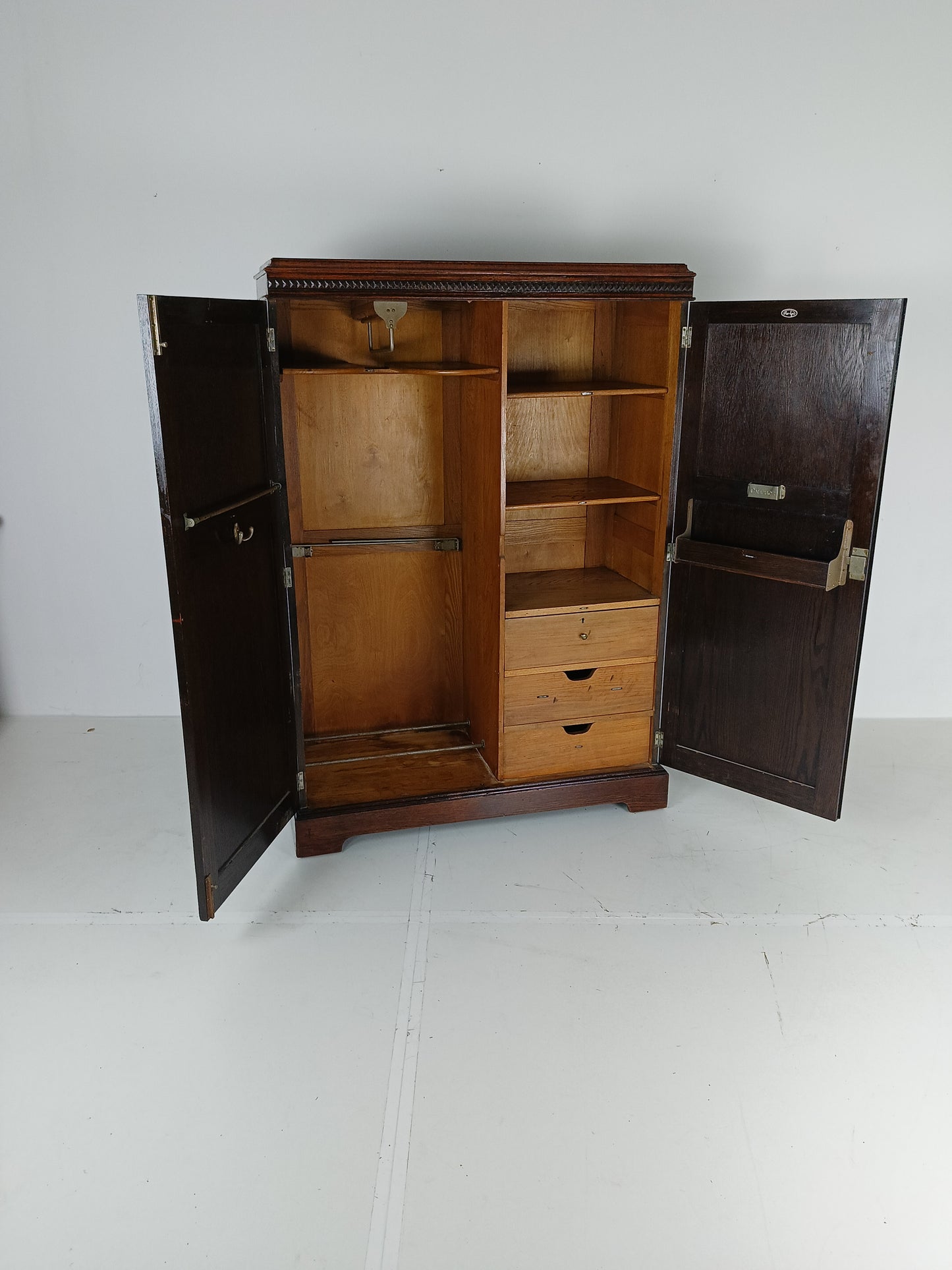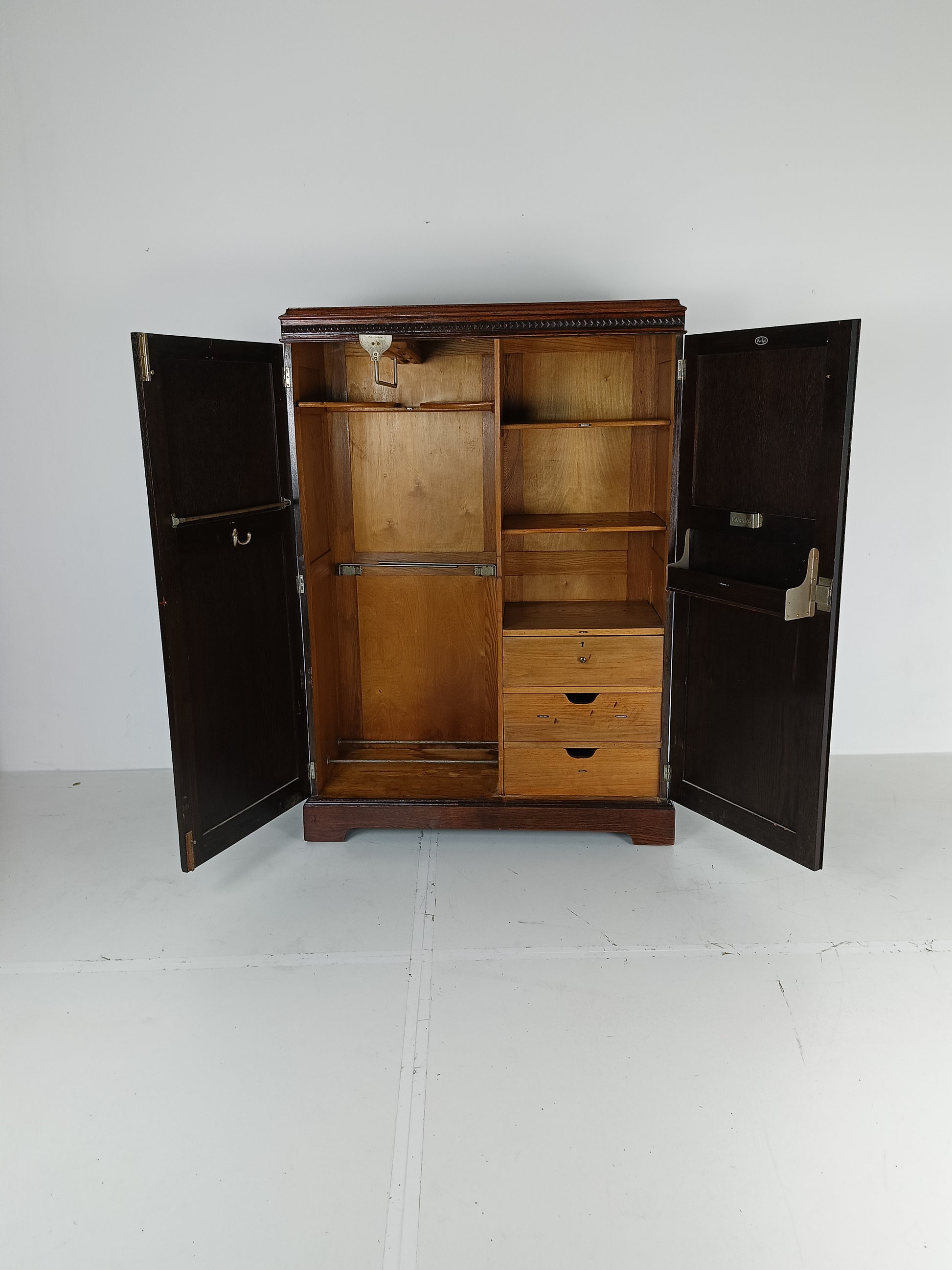 The cabinet has a sleek design but is at the same time elegantly finished with burl walnut veneer. With a handy, compact interior layout with compartments on the right side and an extendable rod on the left. With labels including hats, hankerchiefs, socks, underwear, shirts, studs, ties/scarves, shoes etc.