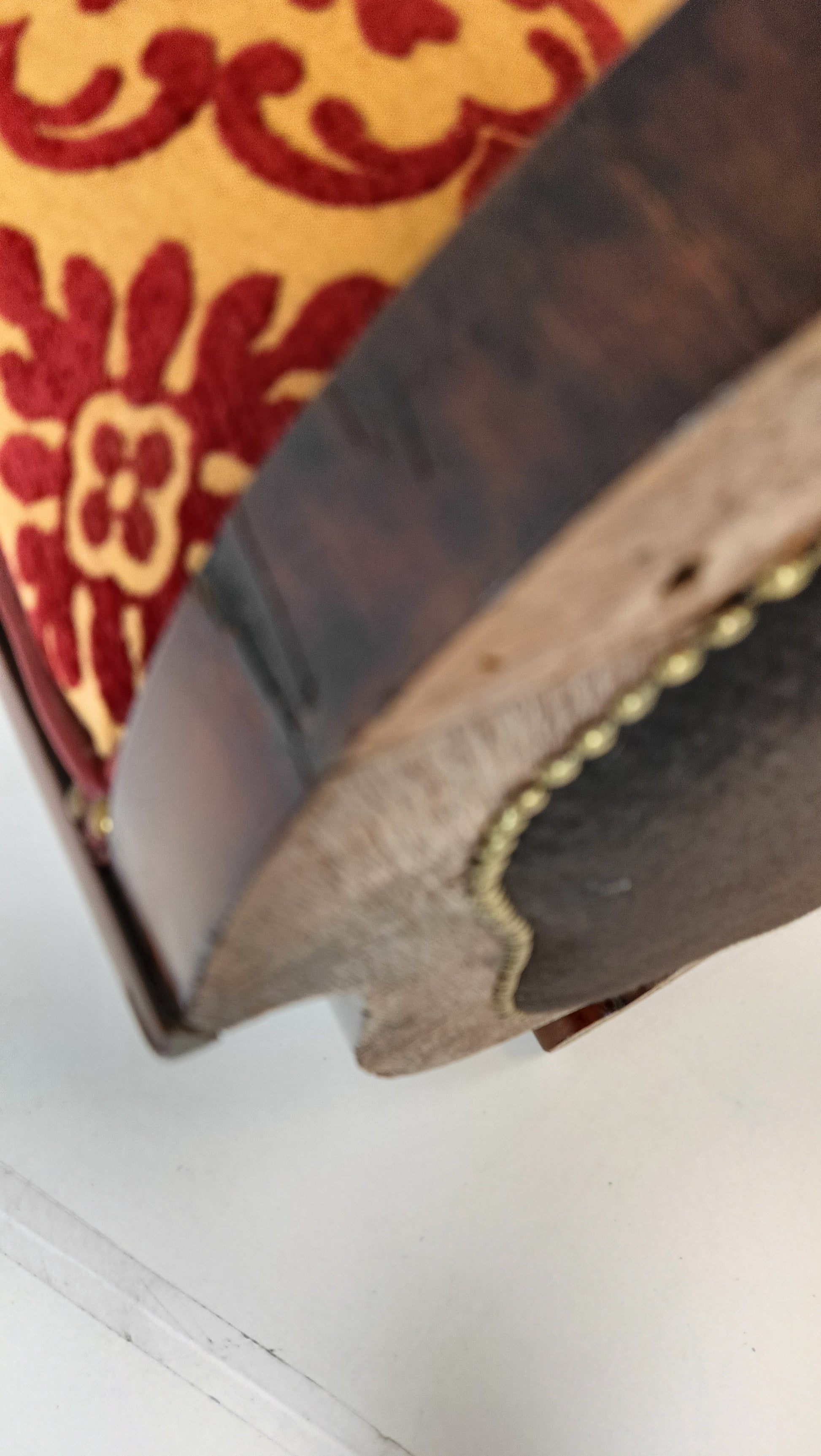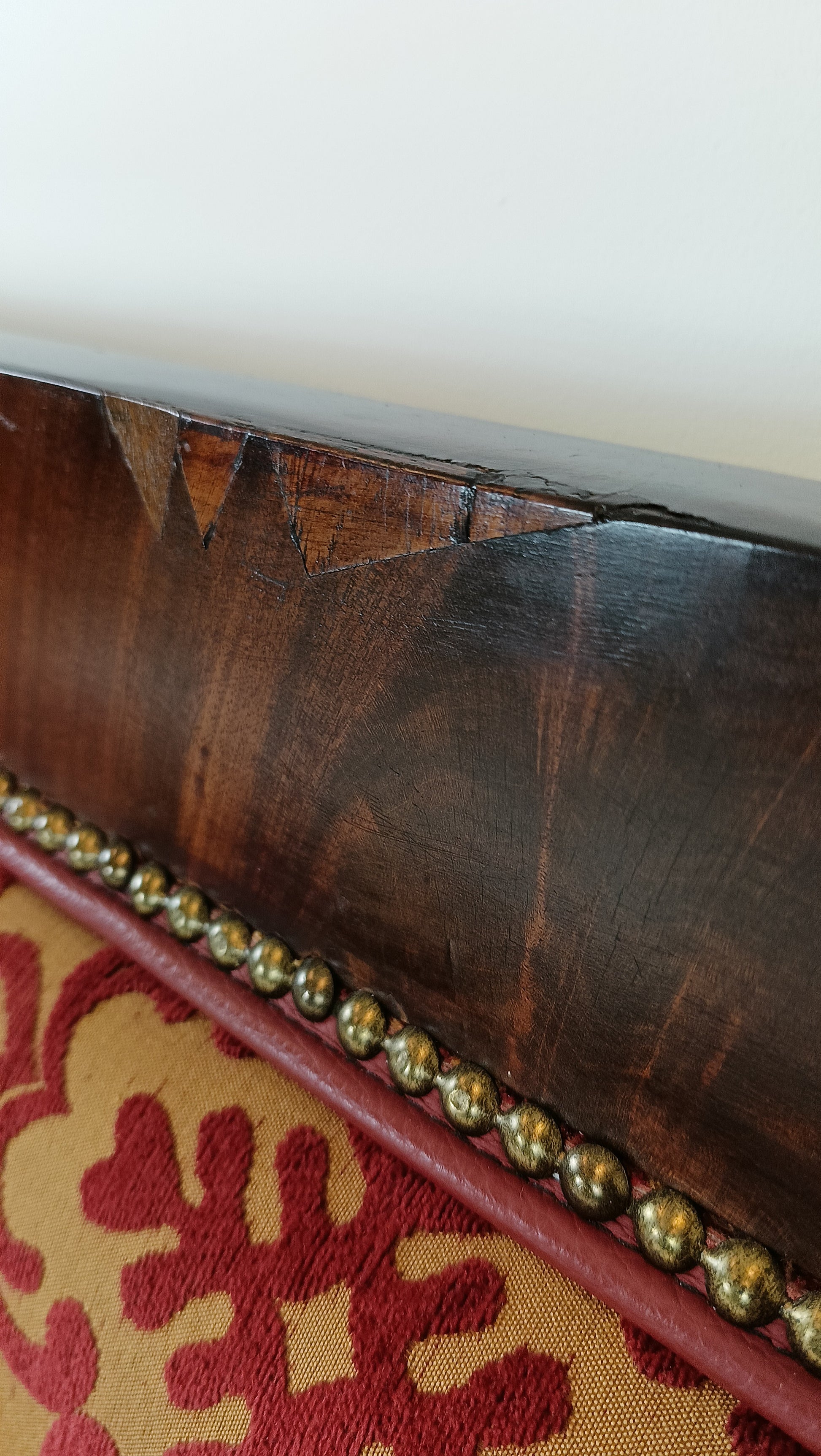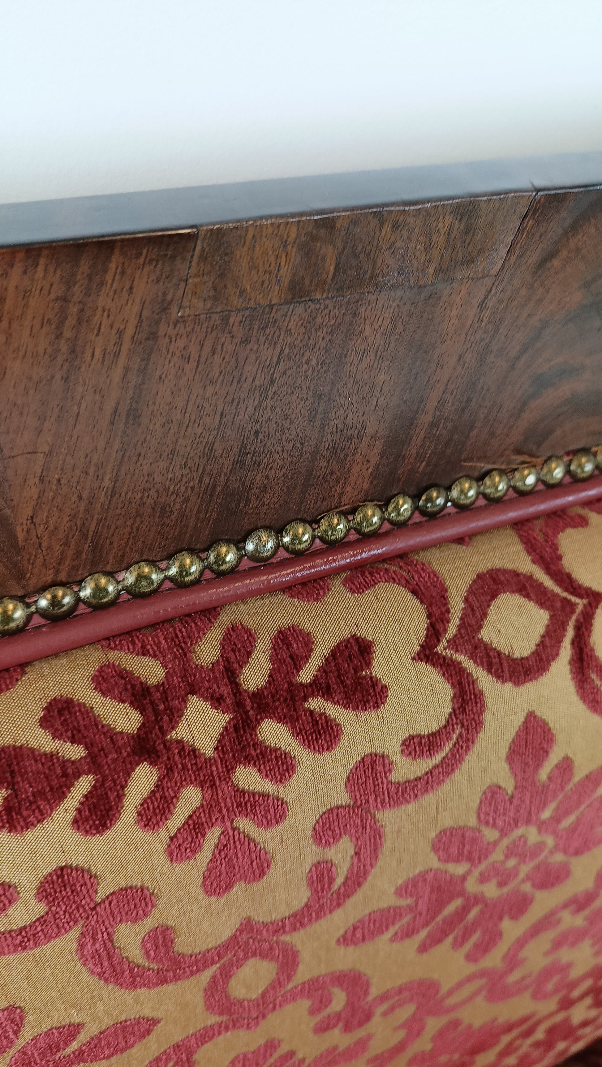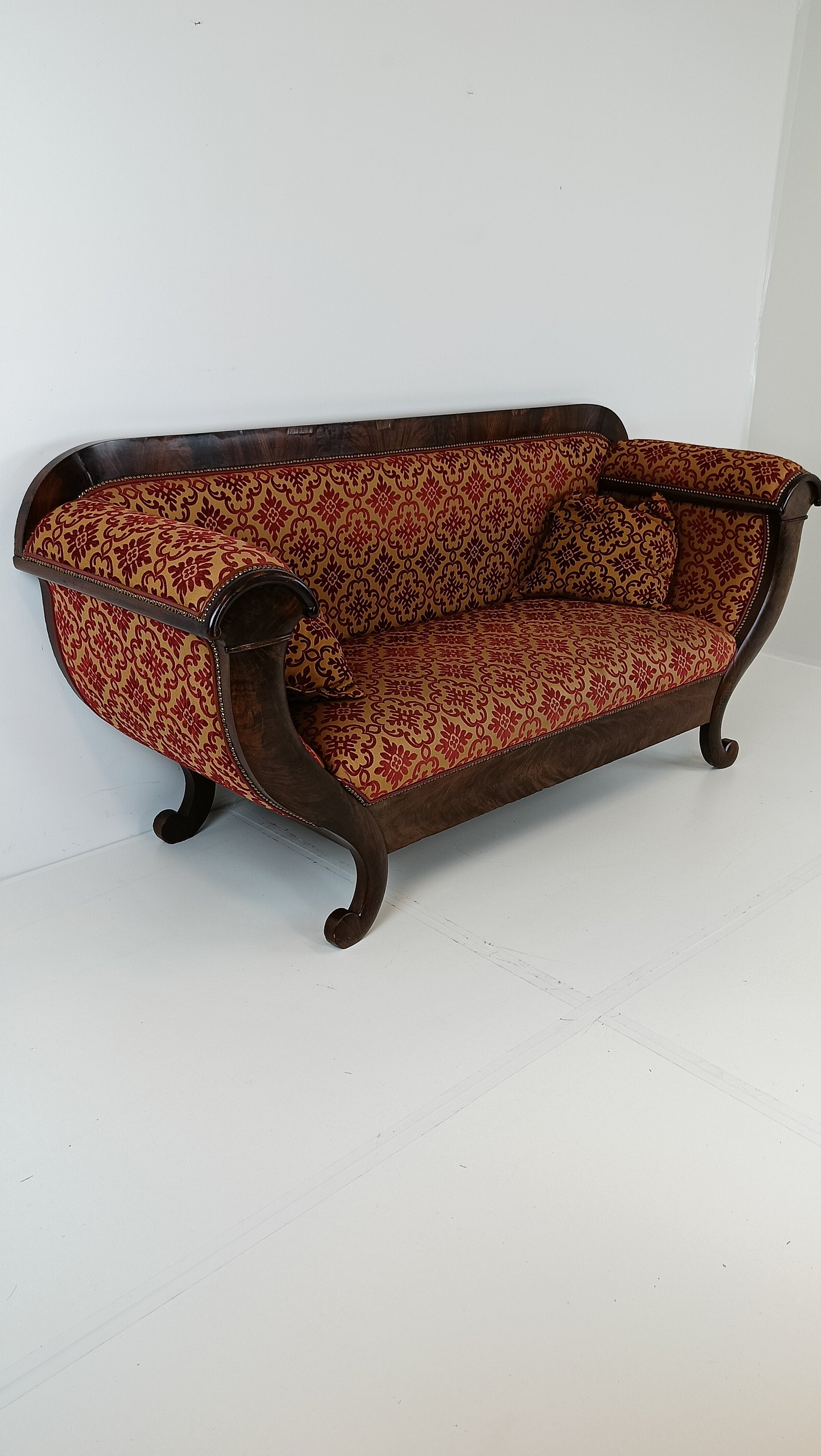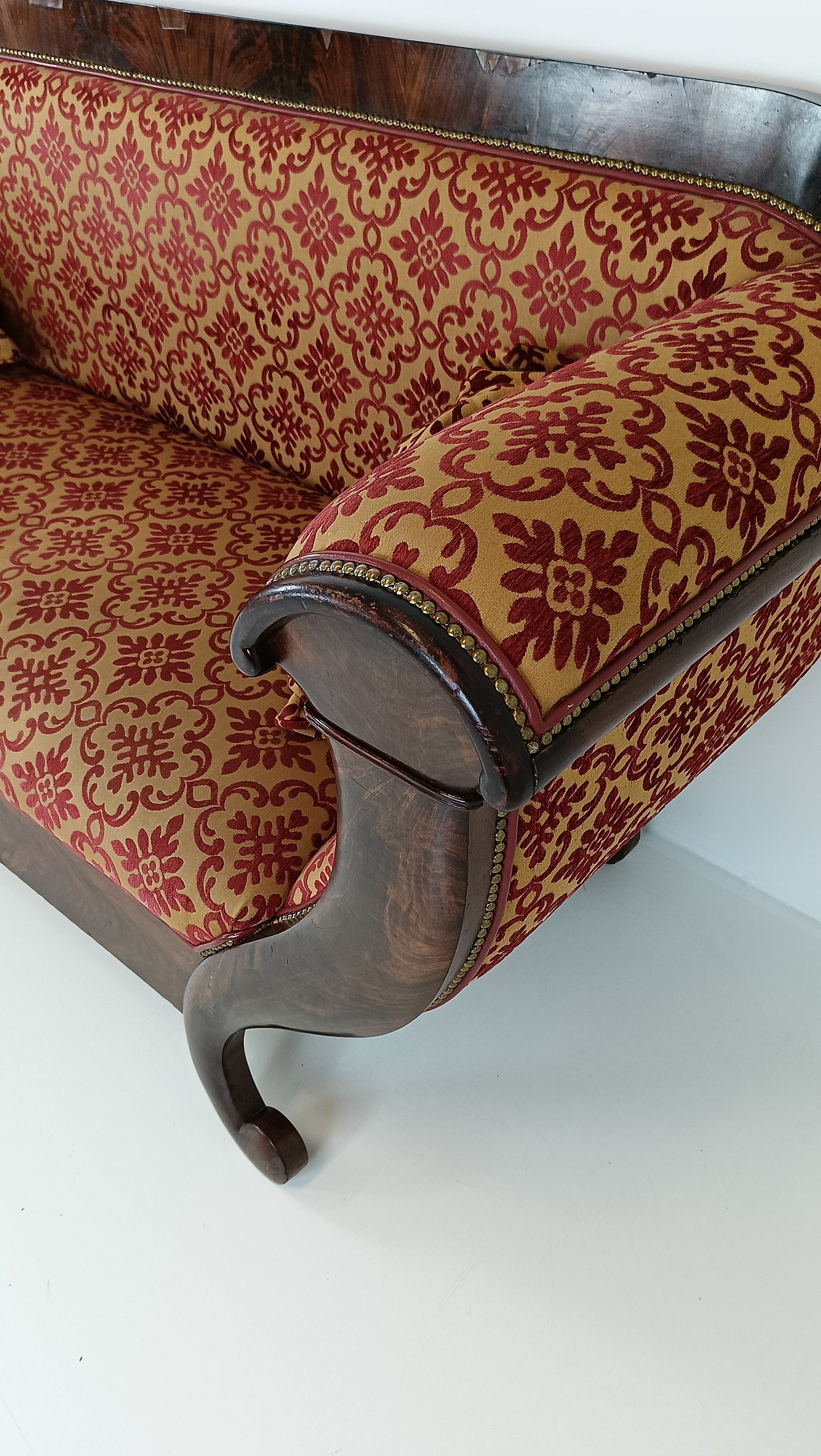 Nestled in sunlight, the Biedermeier style sofa boasts timeless elegance with its wooden details. Its slender frame, delicately carved and polished. Wrapped in plush velvet and silk upholstery, it invites comfort and luxury. A masterpiece restored, it whispers tales of history and beauty, a treasure for generations.