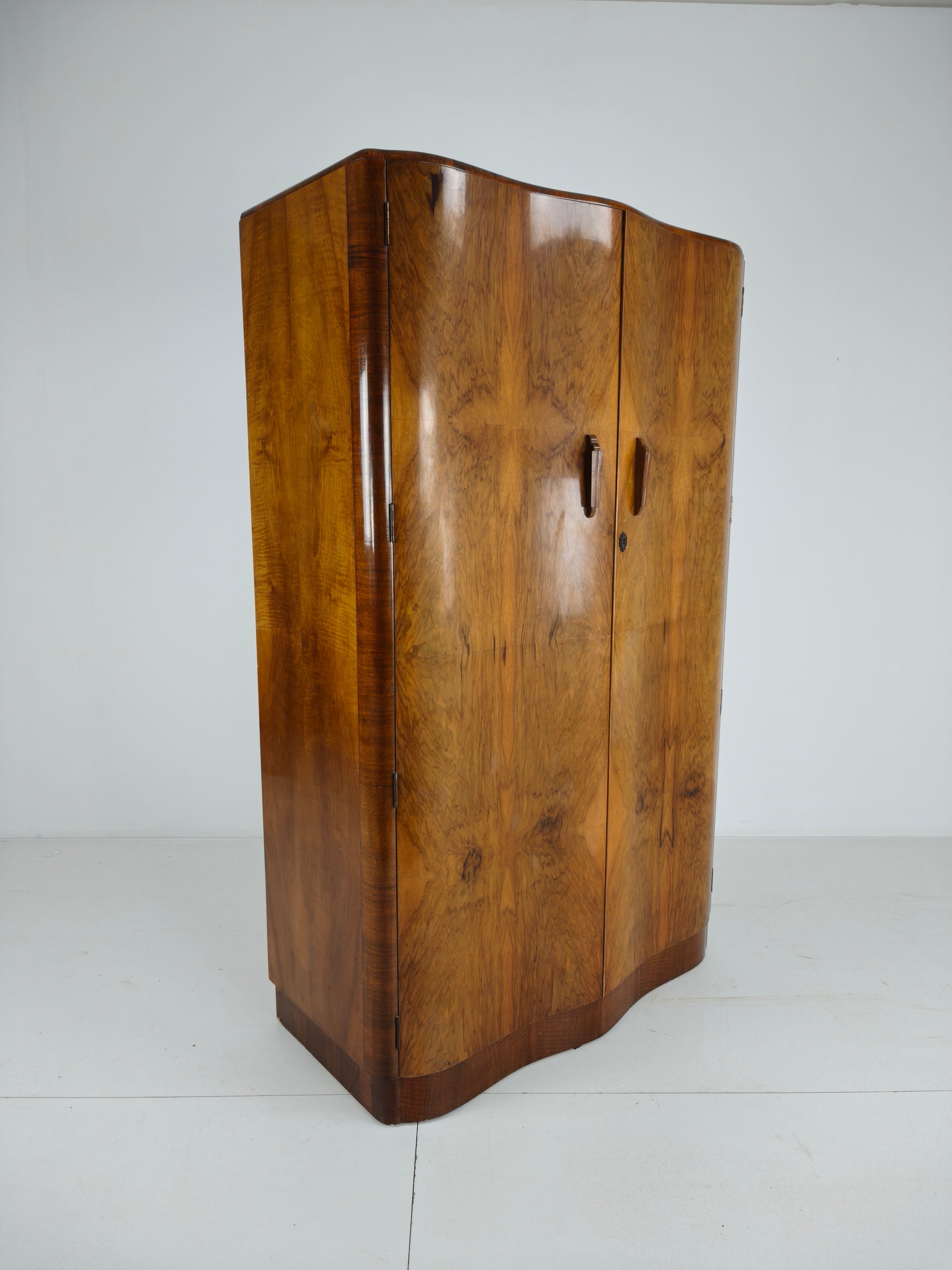 A beautiful original 1930s English Art Deco wardrobe, crafted from striking burr walnut veneer. Featuring curved edges and elegant rounded doors, this piece embodies classic Art Deco design.
