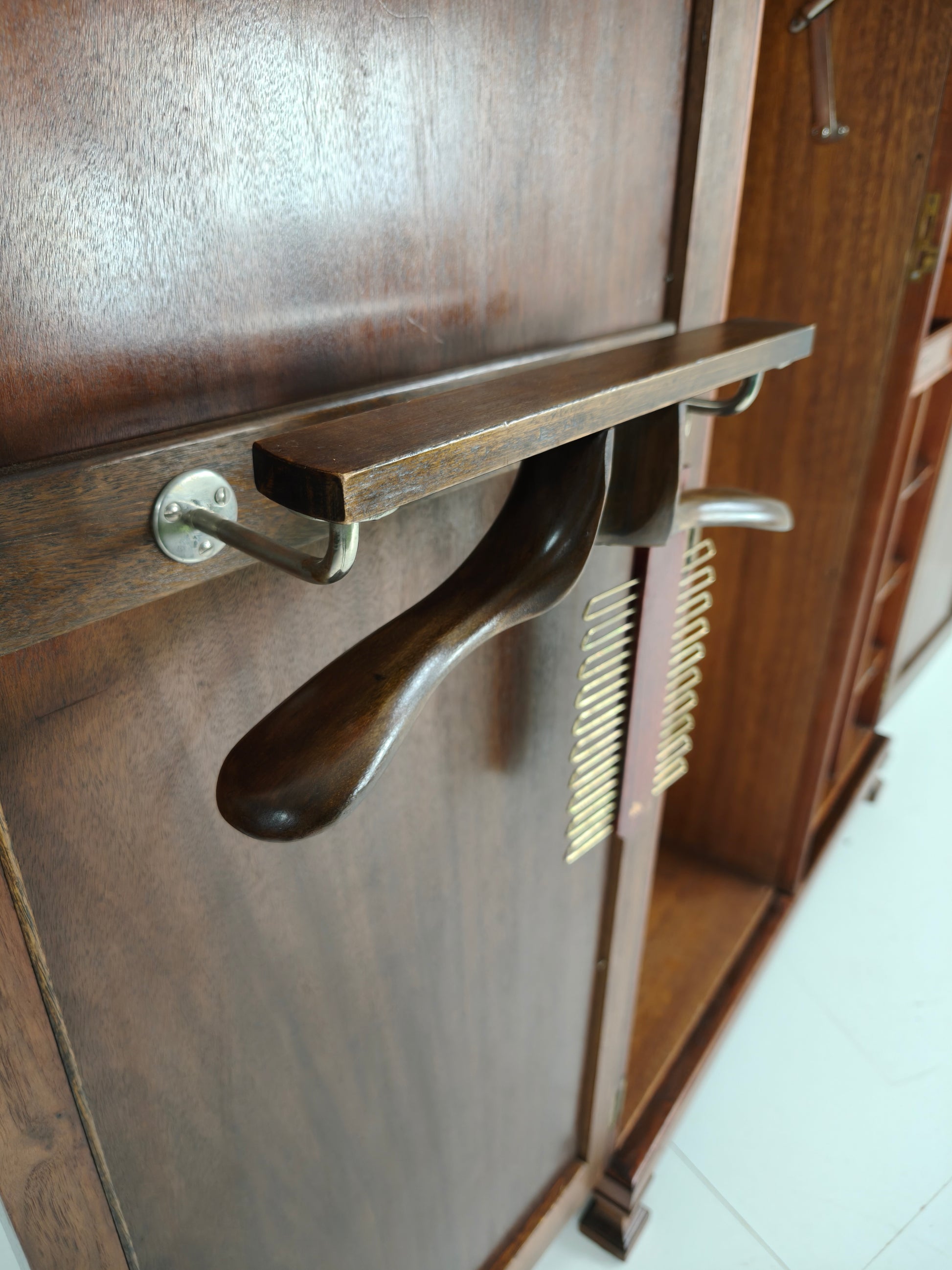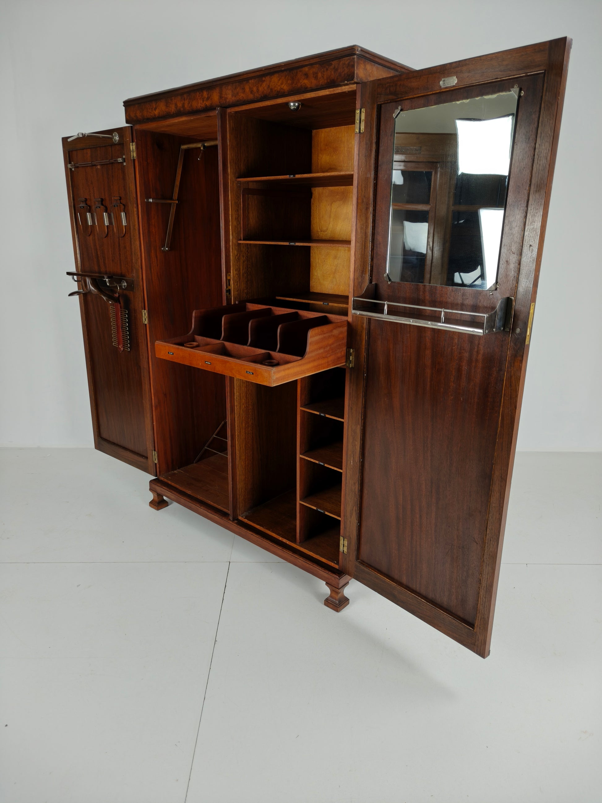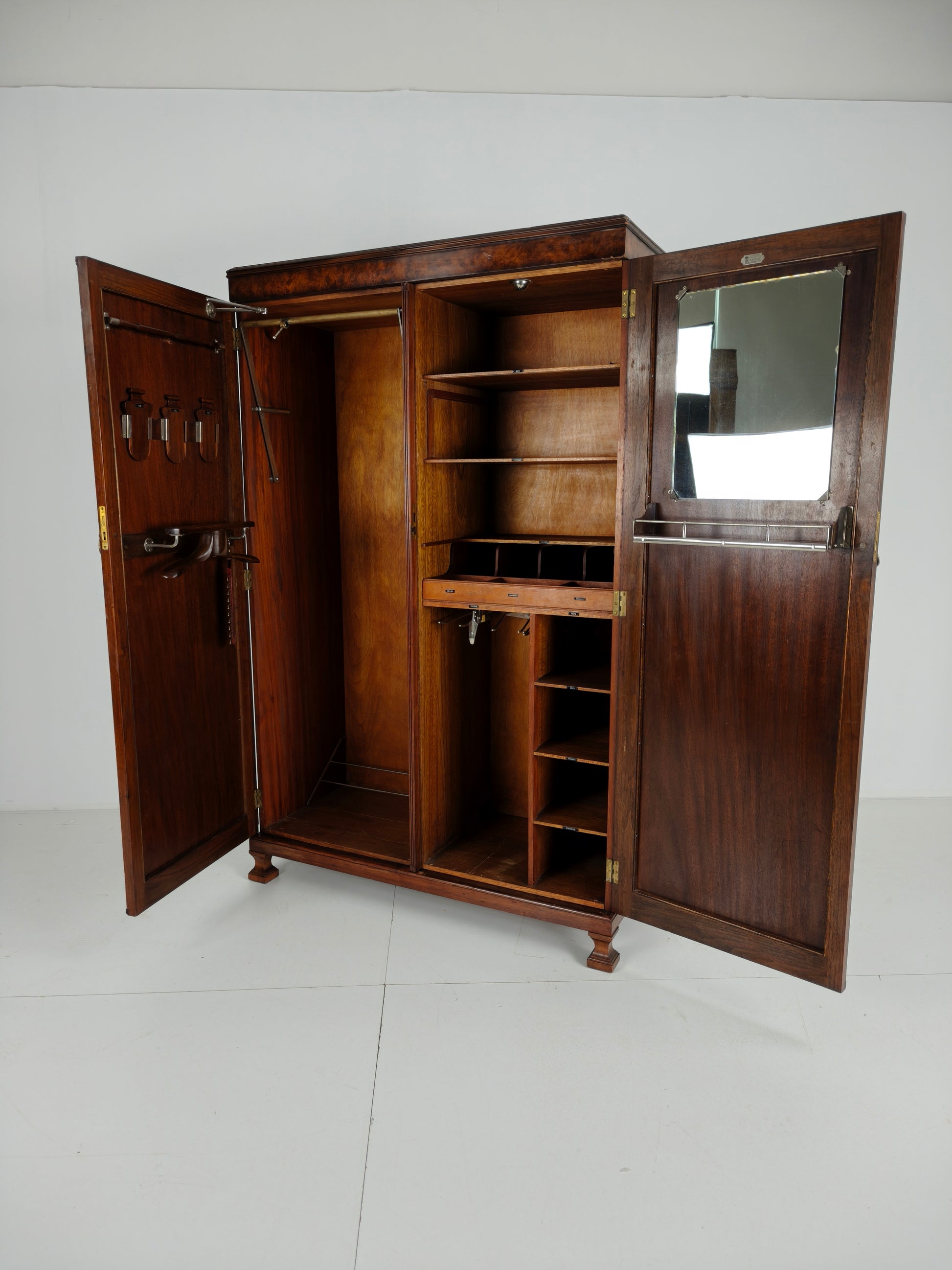 Dating from circa 1900–1932, the wardrobe features a beautifully figured walnut exterior and a well-organized interior with the following compartments: