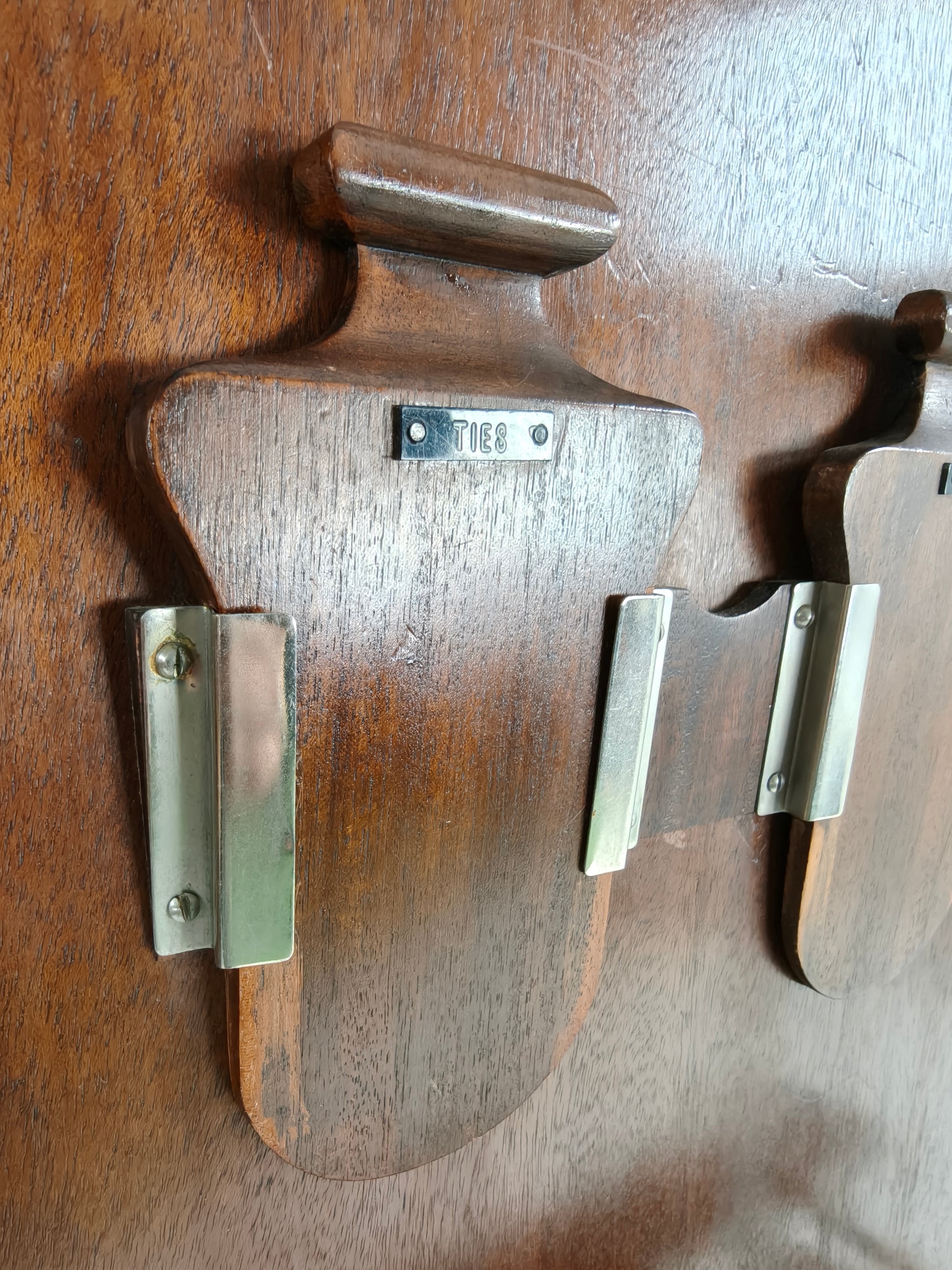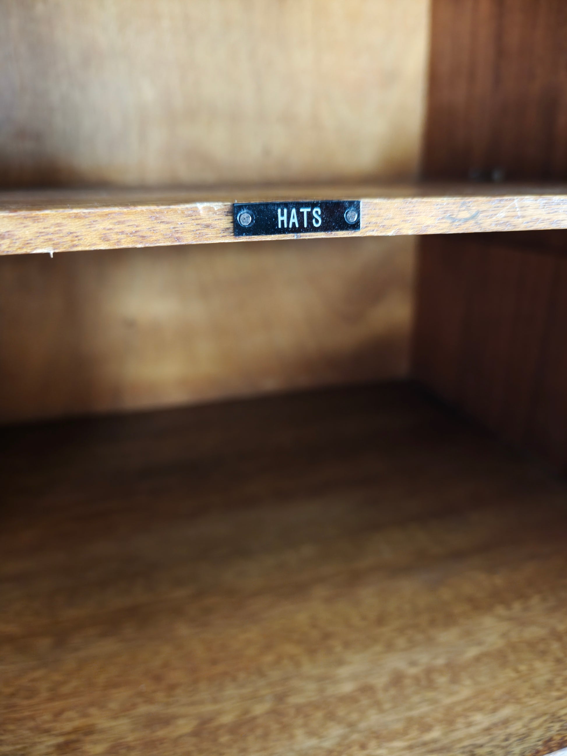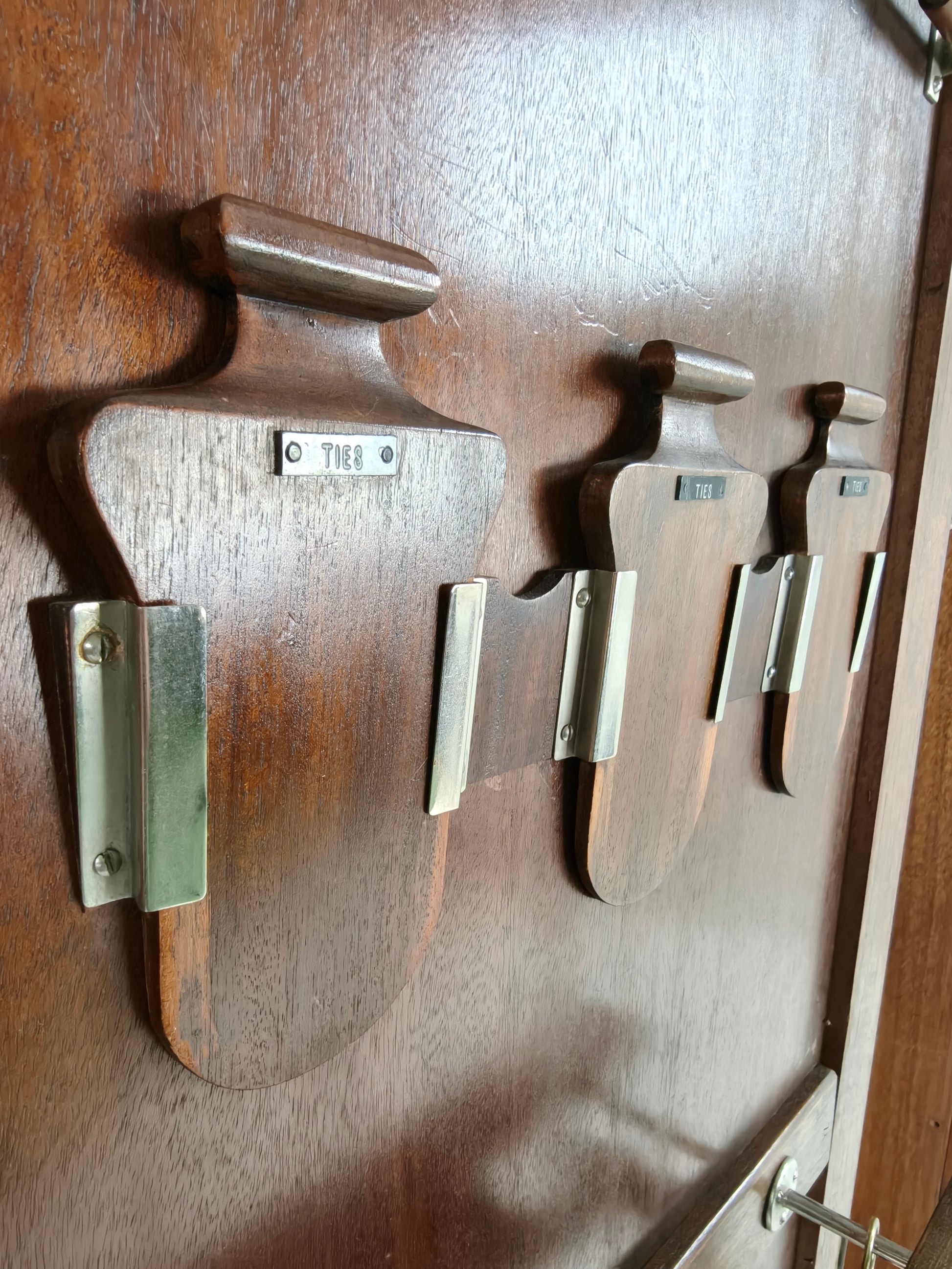 Dating from circa 1900–1932, the wardrobe features a beautifully figured walnut exterior and a well-organized interior with the following compartments: