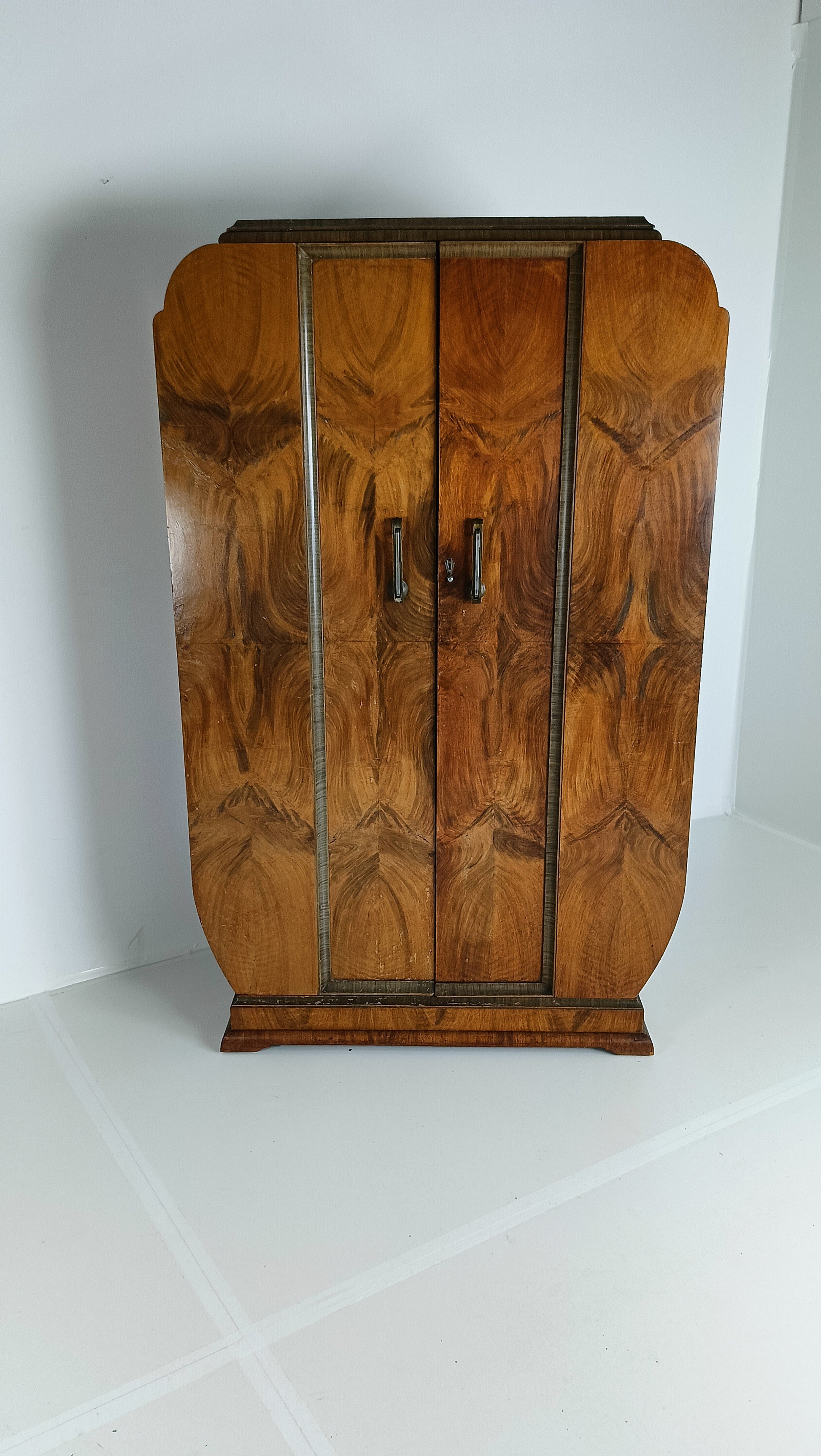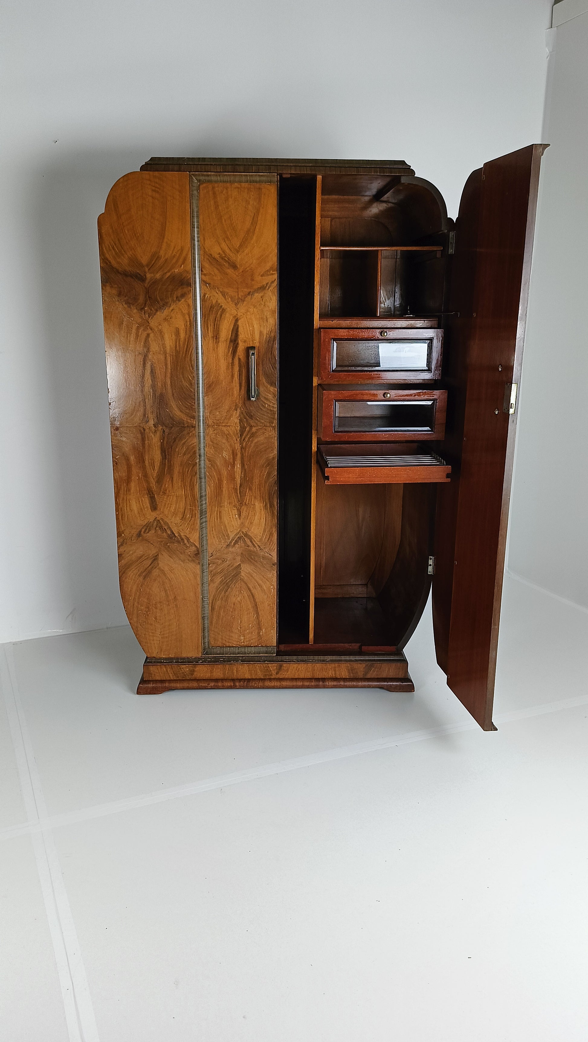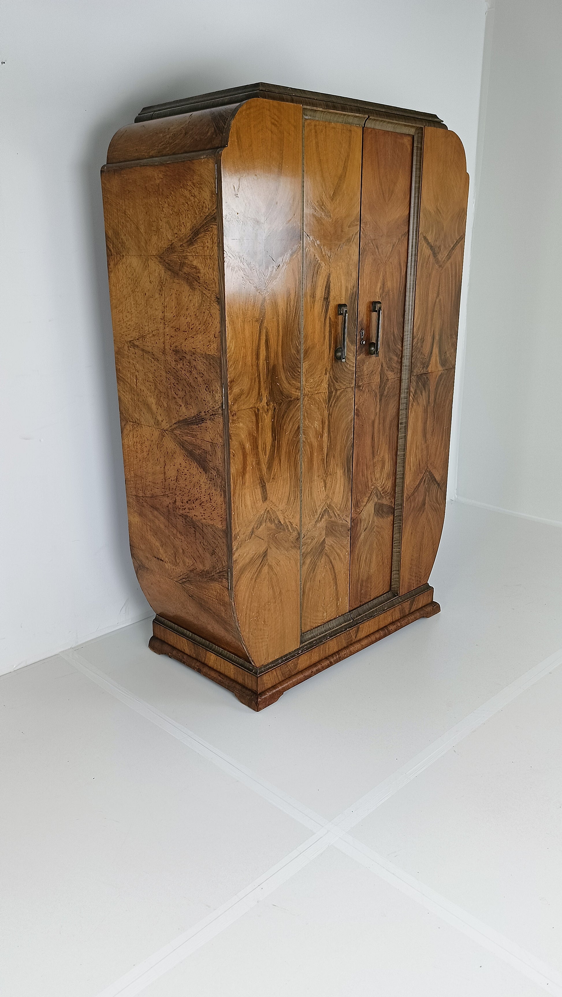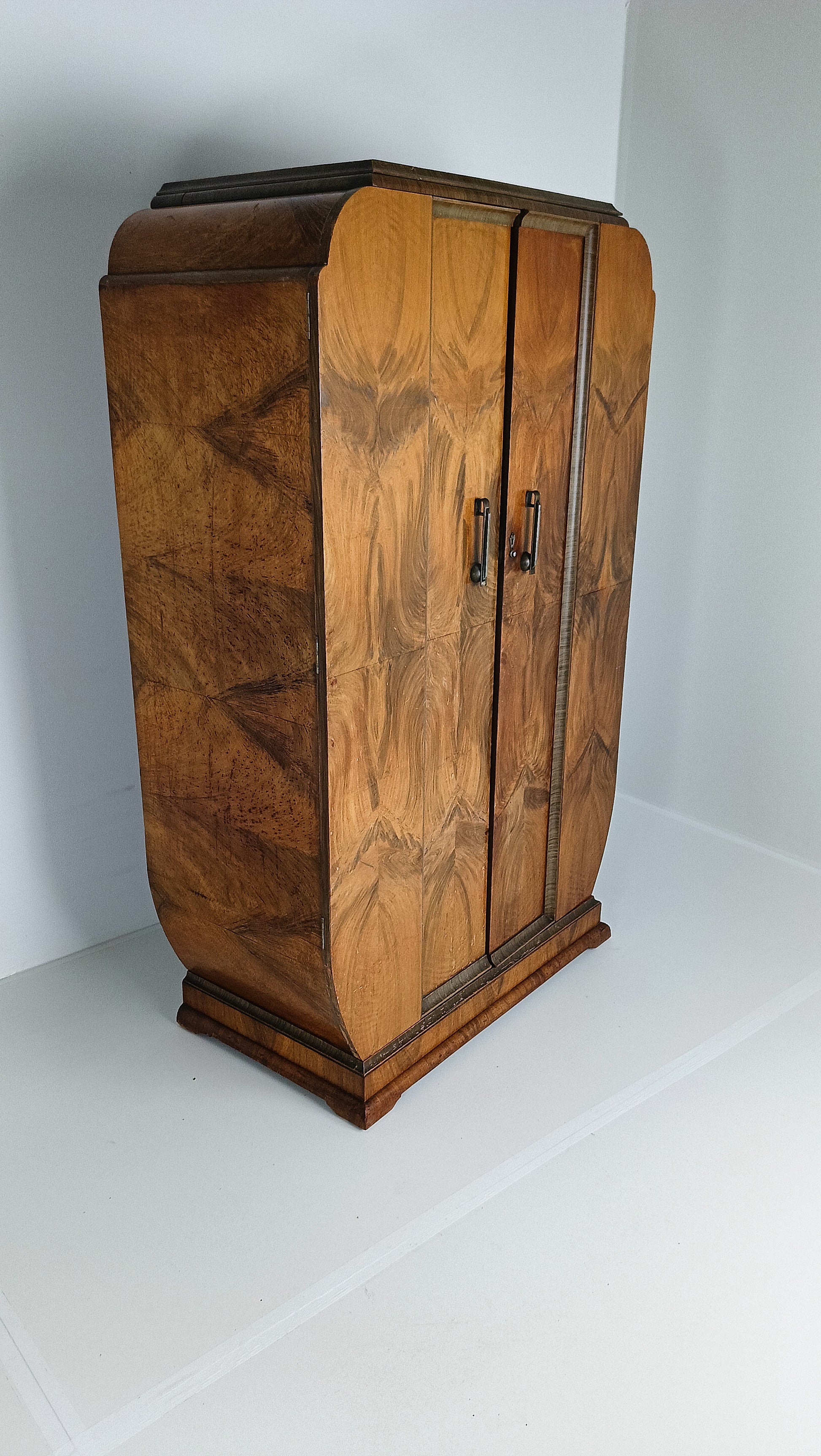 Small size English Art Deco wardrobe. The cabinet has a sleek design but is at the same time elegantly finished with burl walnut veneer. With a handy, compact interior layout with compartments on the right side and an extendable rod on the left. Contains of two drawers, on slide out for hanging pants and two more shelfs.