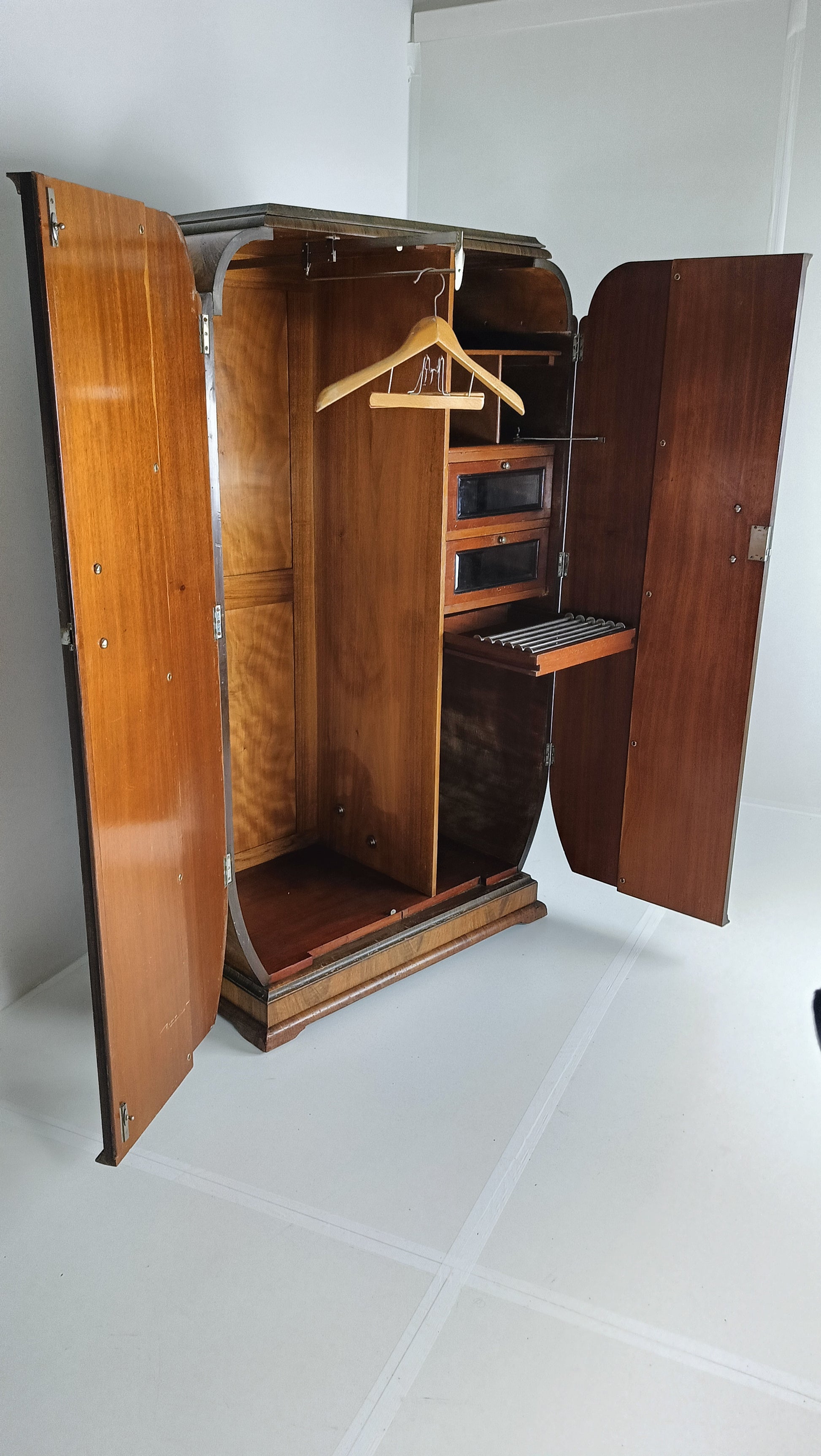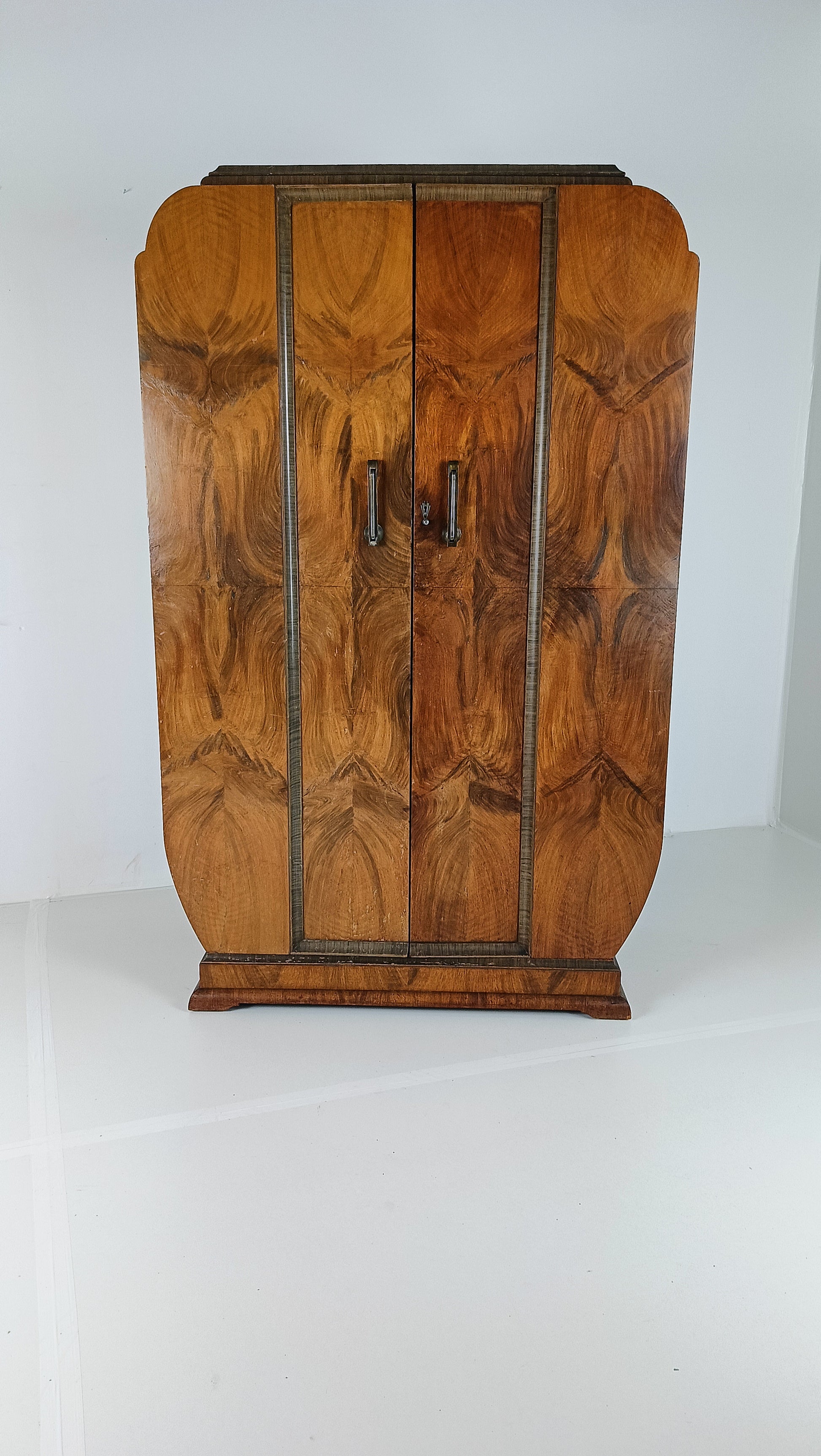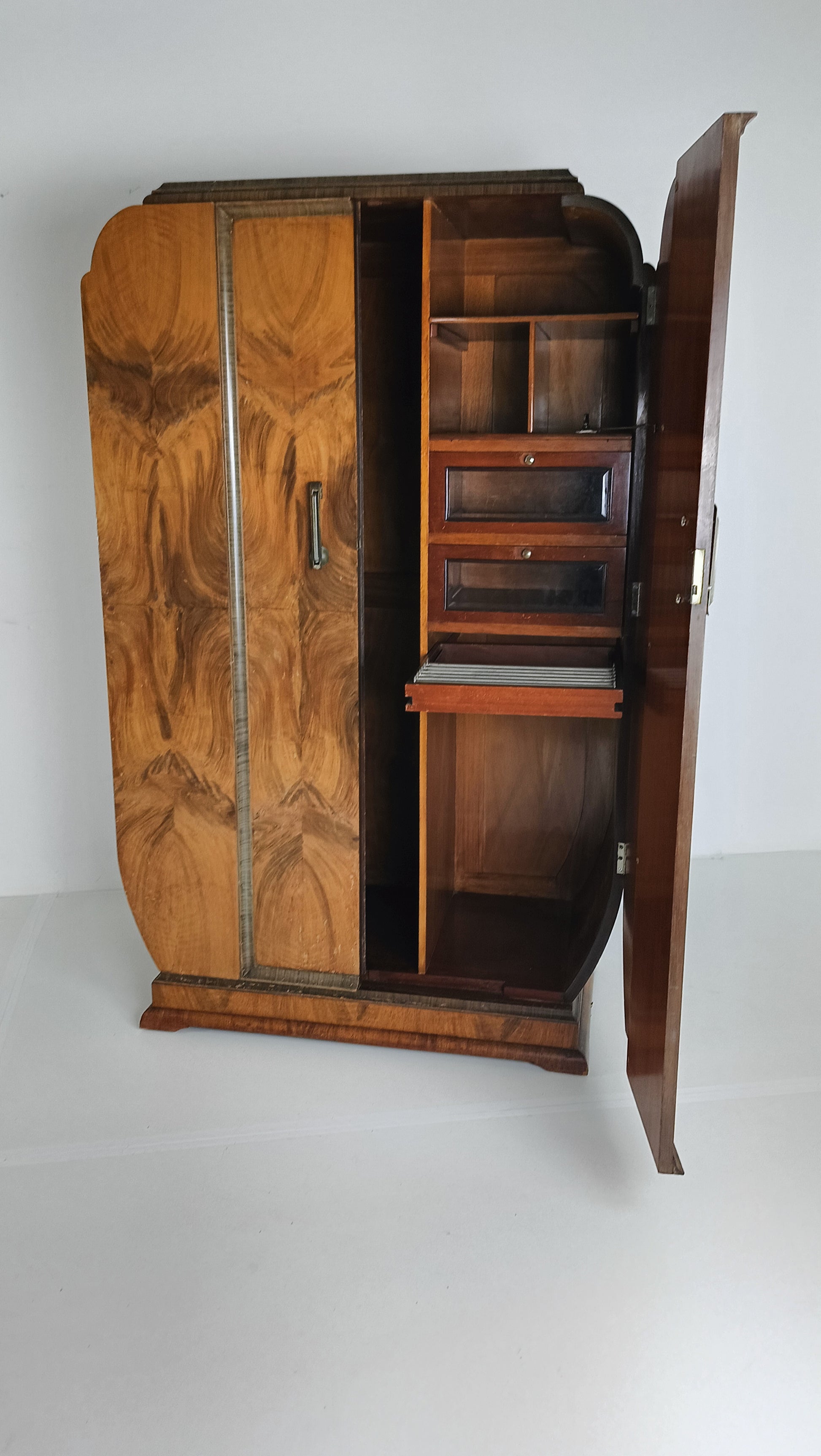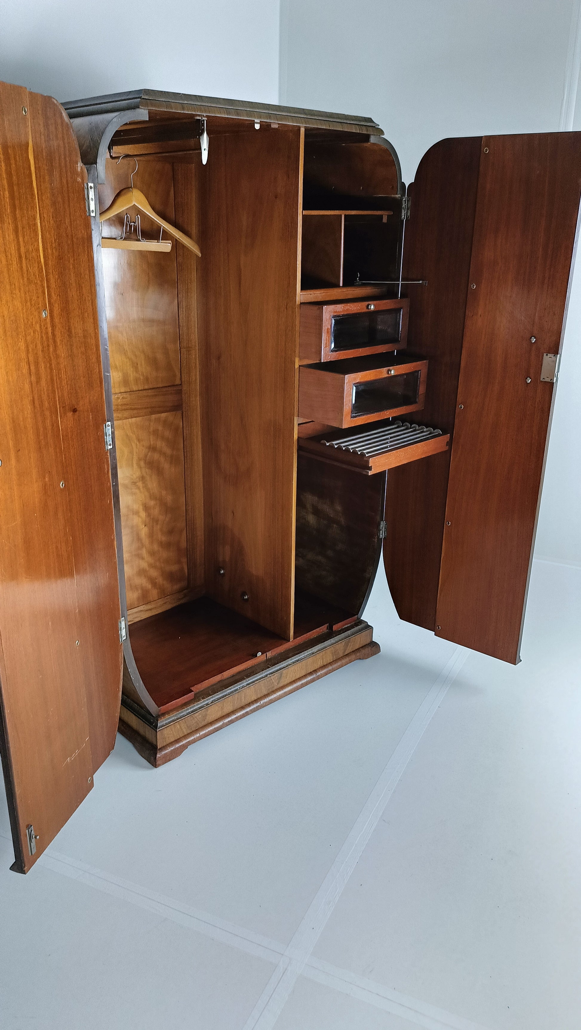 Small size English Art Deco wardrobe. The cabinet has a sleek design but is at the same time elegantly finished with burl walnut veneer. With a handy, compact interior layout with compartments on the right side and an extendable rod on the left. Contains of two drawers, on slide out for hanging pants and two more shelfs.