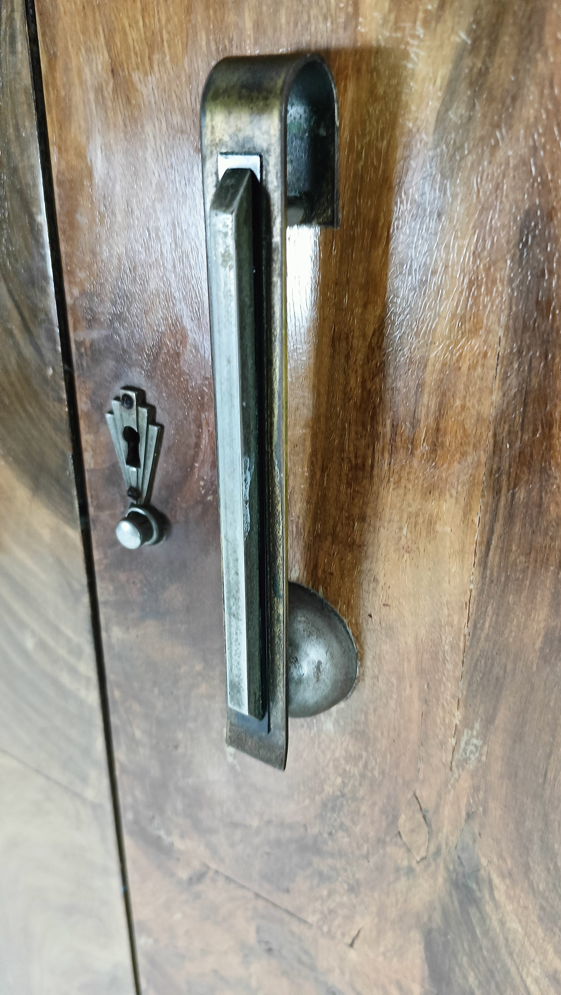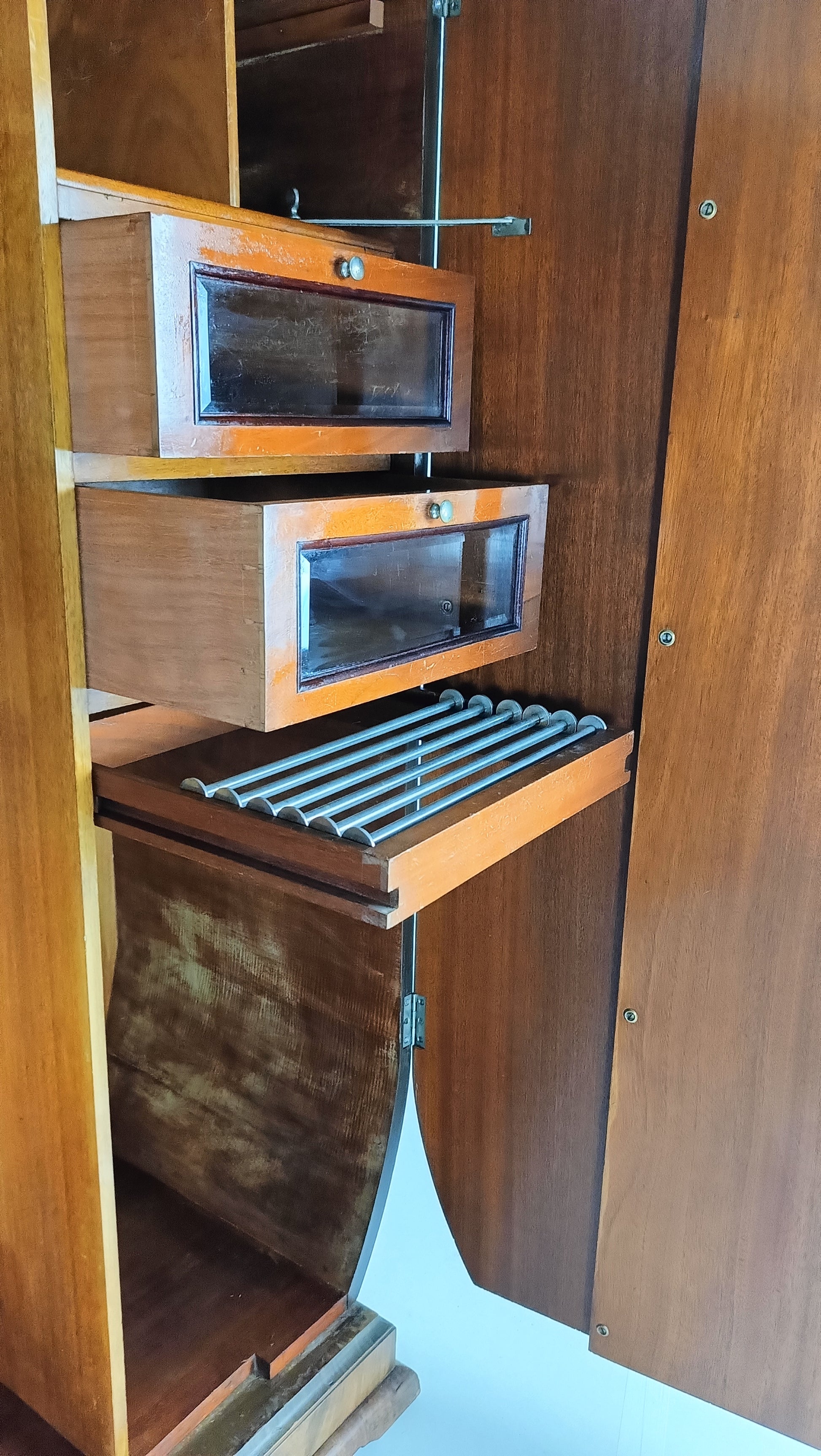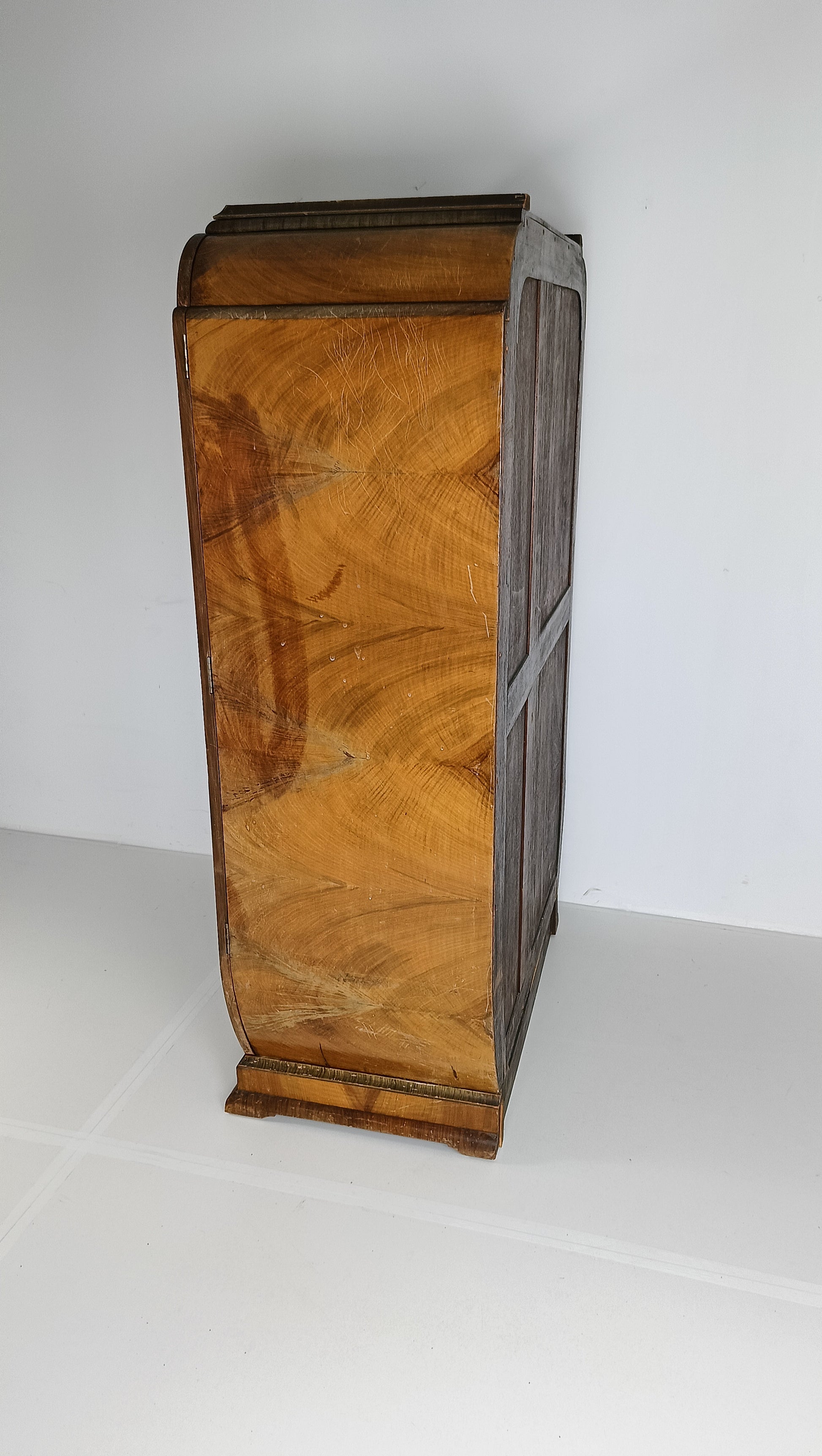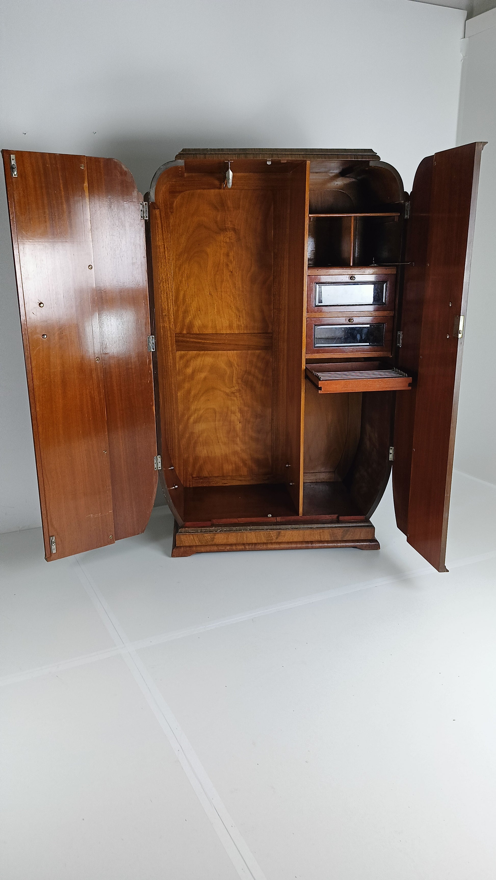 Small size English Art Deco wardrobe. The cabinet has a sleek design but is at the same time elegantly finished with burl walnut veneer. With a handy, compact interior layout with compartments on the right side and an extendable rod on the left. Contains of two drawers, on slide out for hanging pants and two more shelfs.