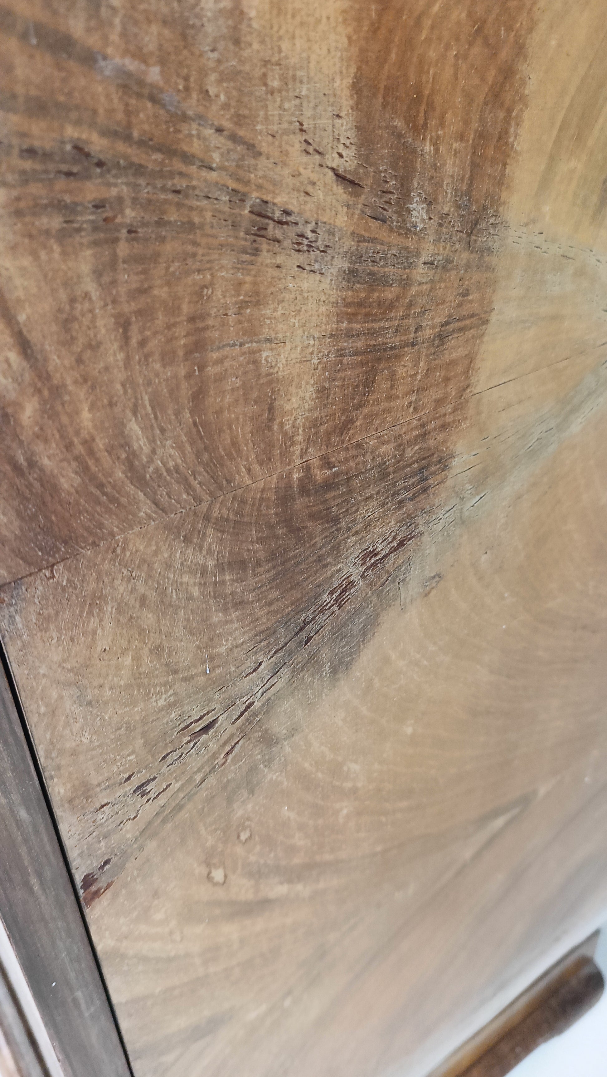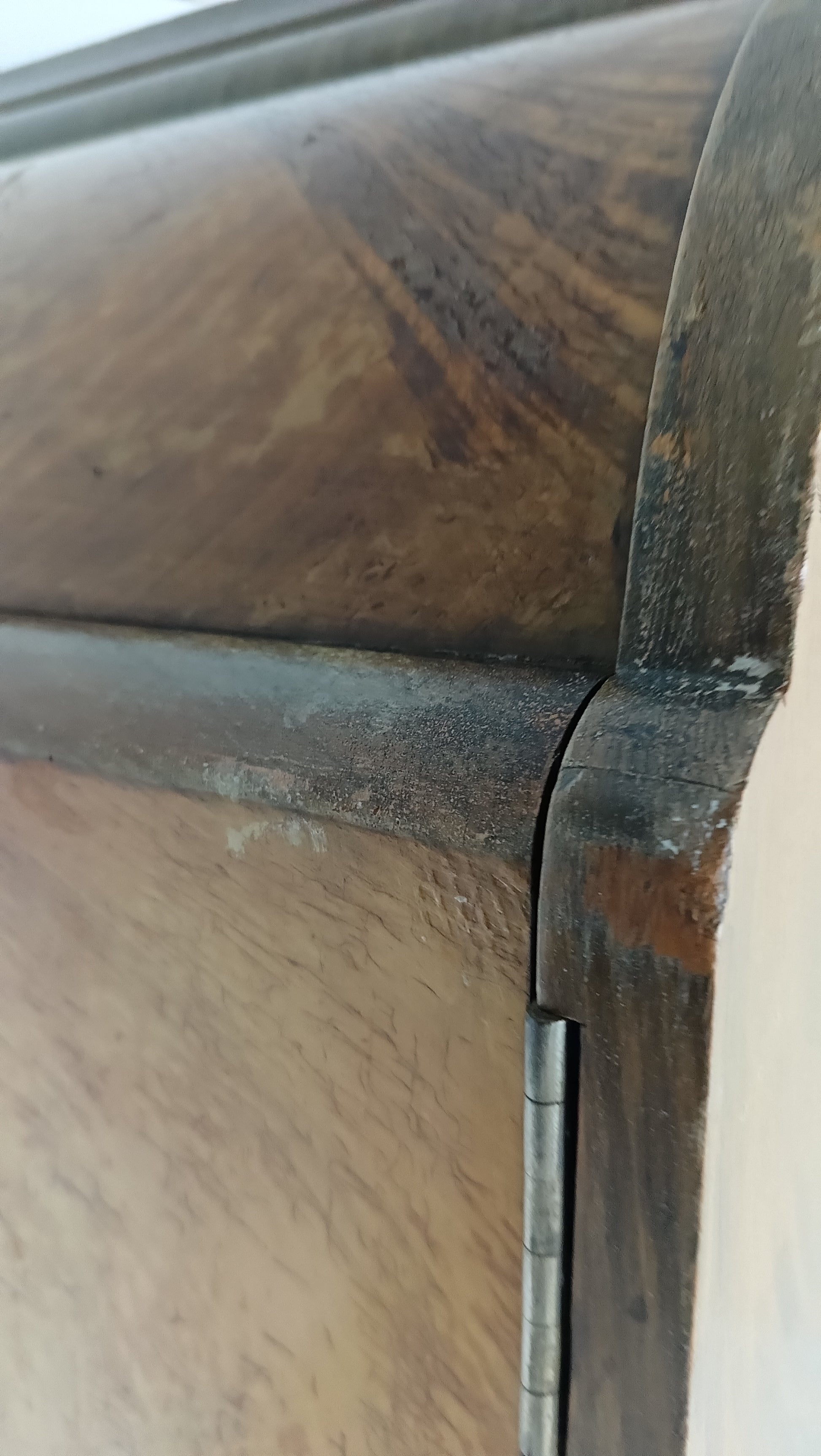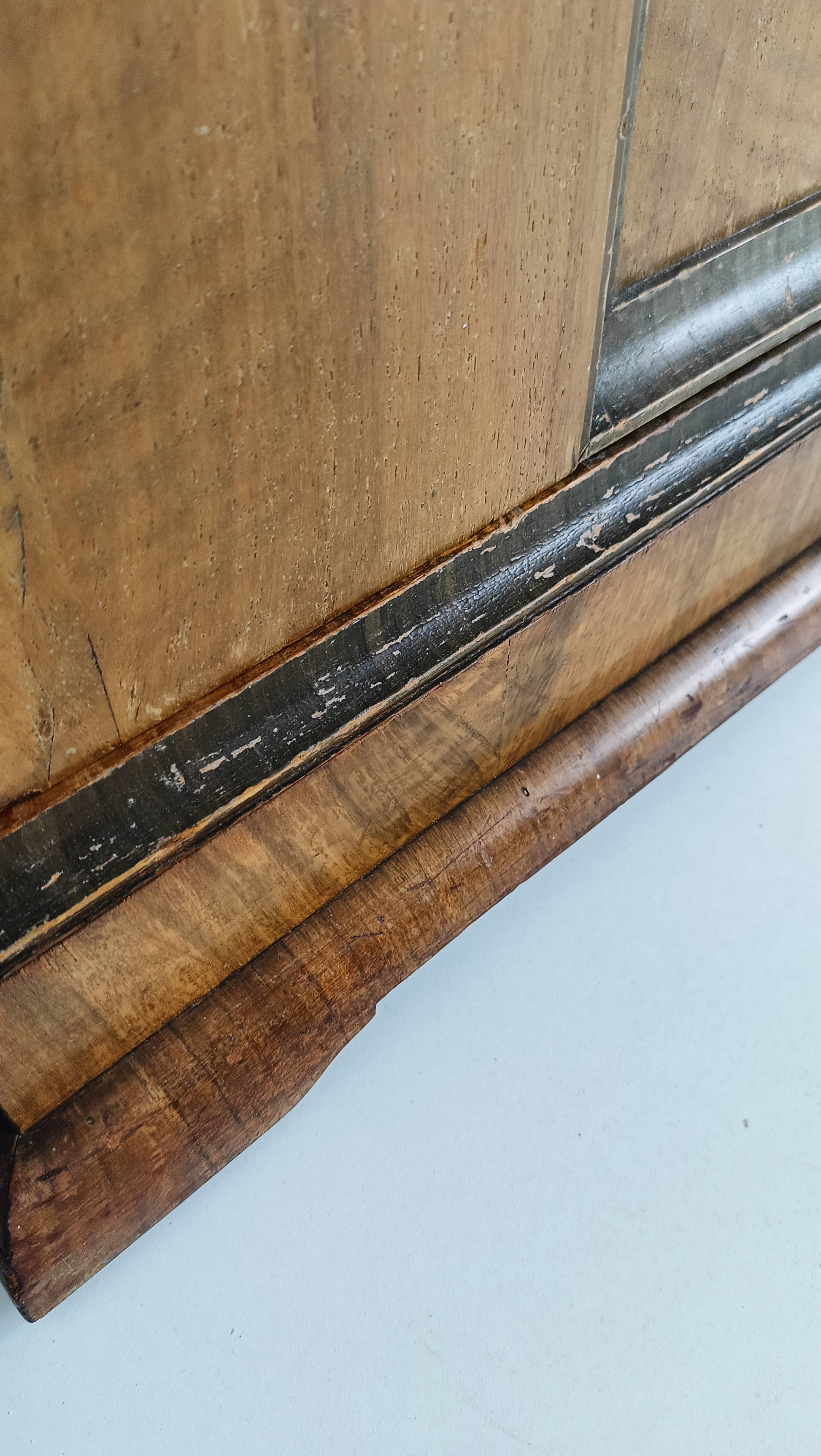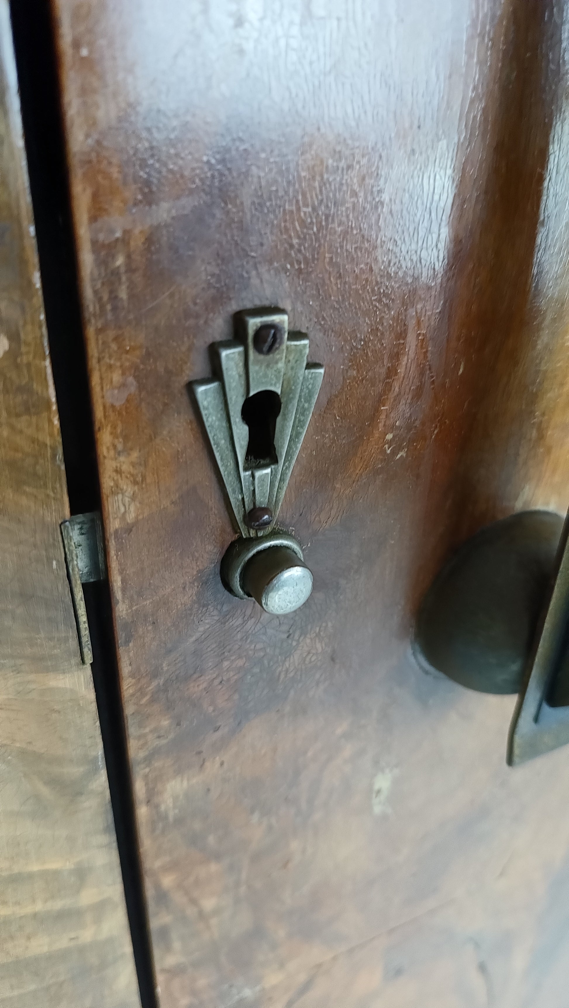 Small size English Art Deco wardrobe. The cabinet has a sleek design but is at the same time elegantly finished with burl walnut veneer. With a handy, compact interior layout with compartments on the right side and an extendable rod on the left. Contains of two drawers, on slide out for hanging pants and two more shelfs.