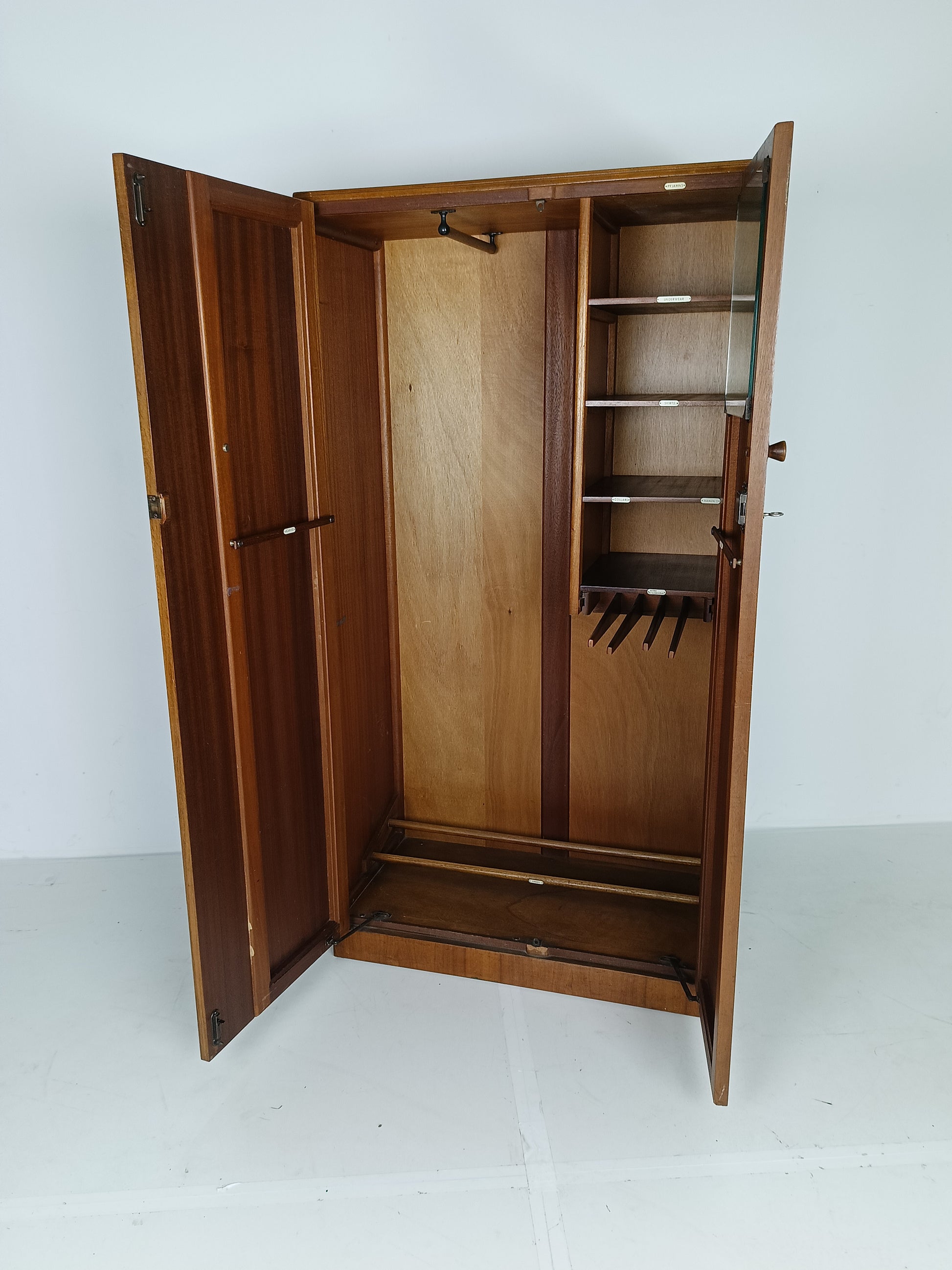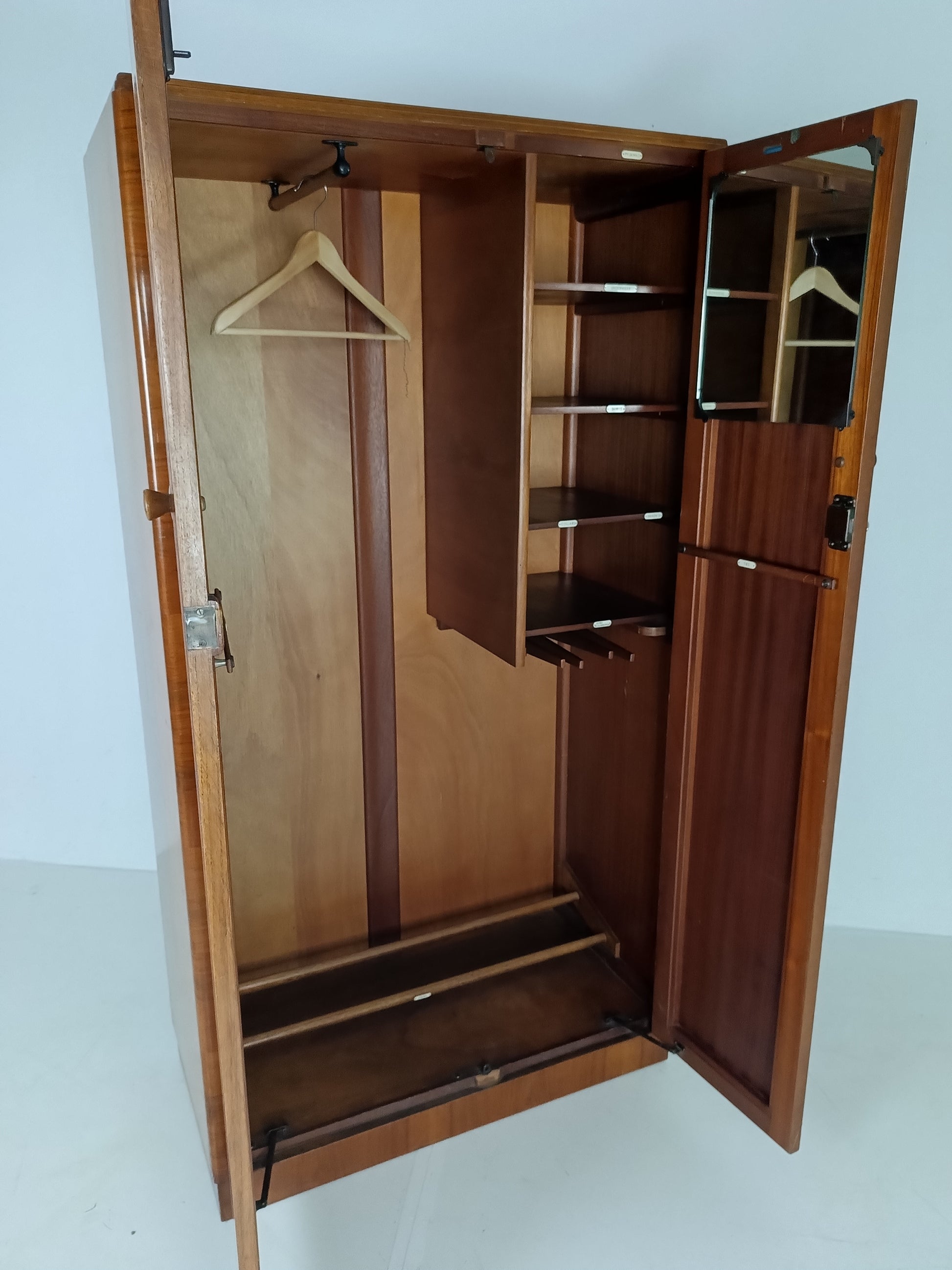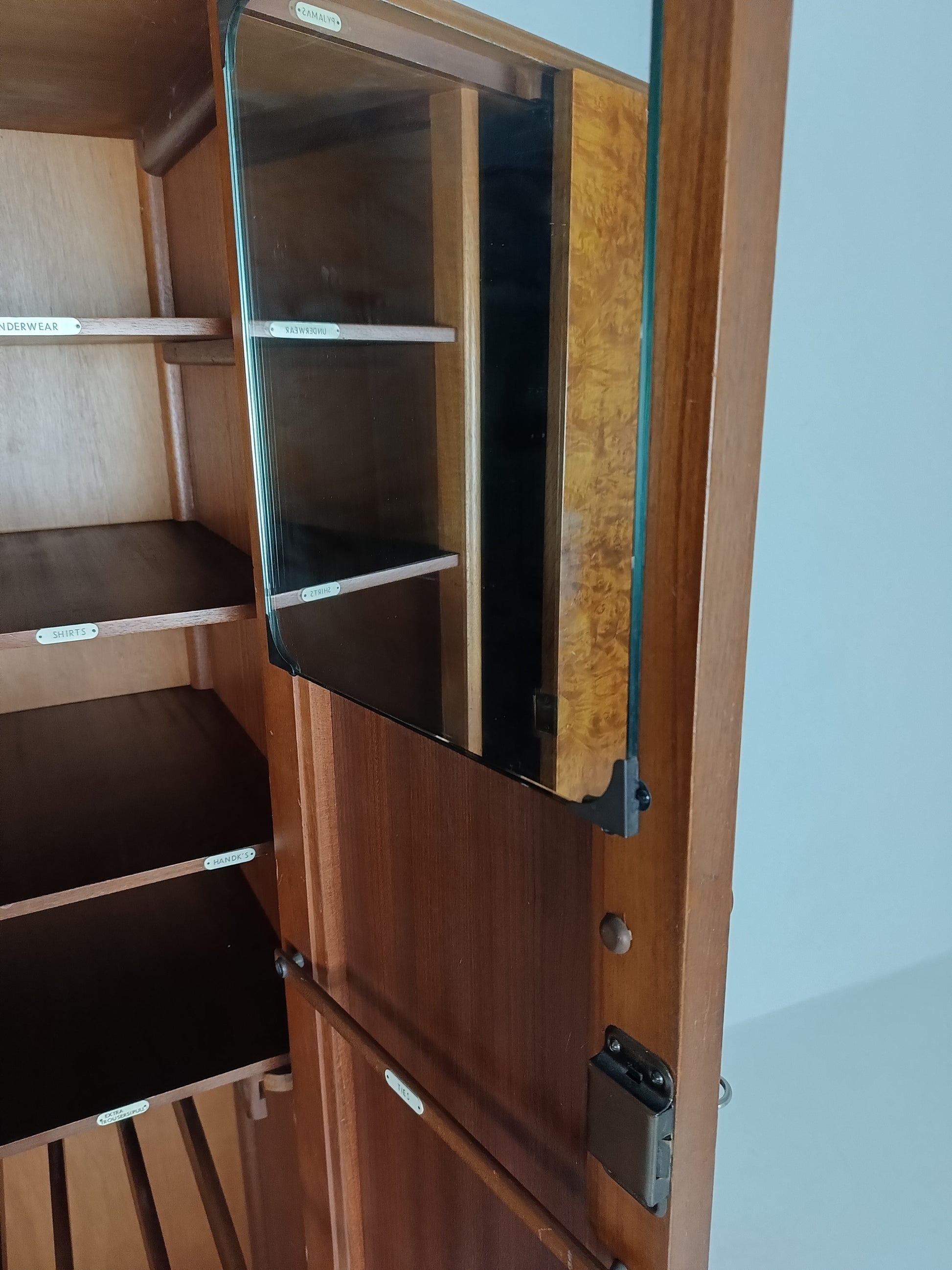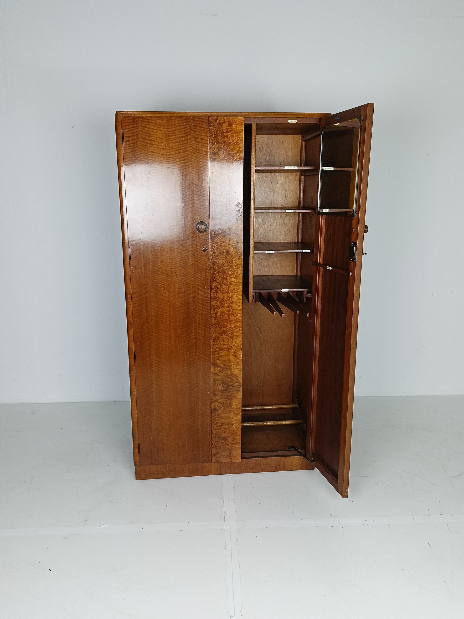 The cabinet has a sleek design but is at the same time elegantly finished with burl walnut veneer. With a handy, compact interior layout with compartments on the left side and an extendable rod on the right. With labels including hats, hankerchiefs, socks, underwear, shirts, studs, ties/scarves, shoes etc.