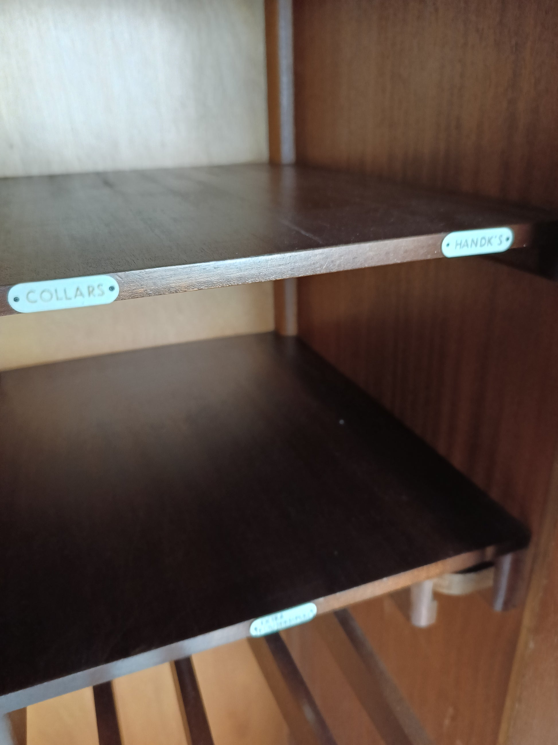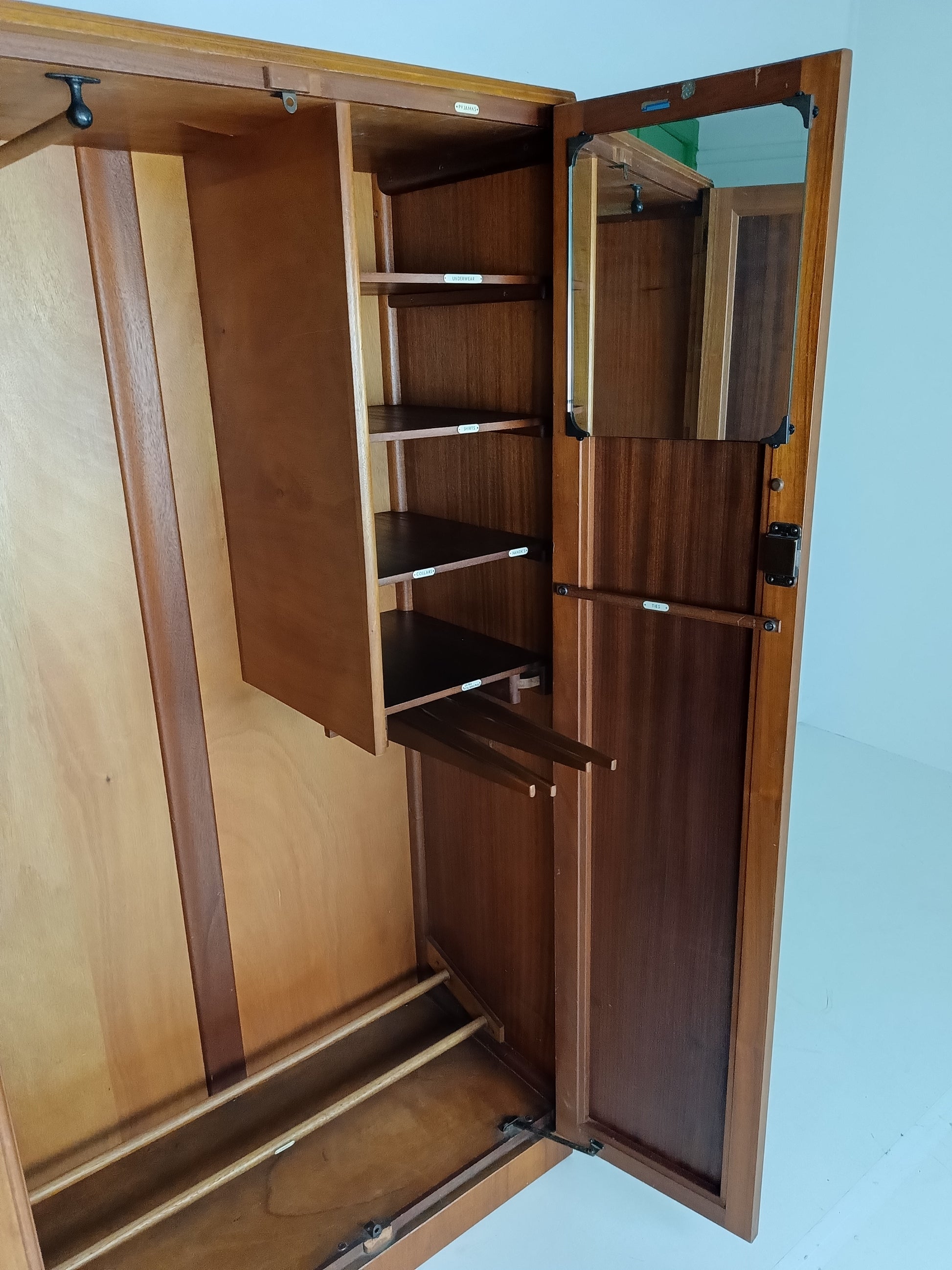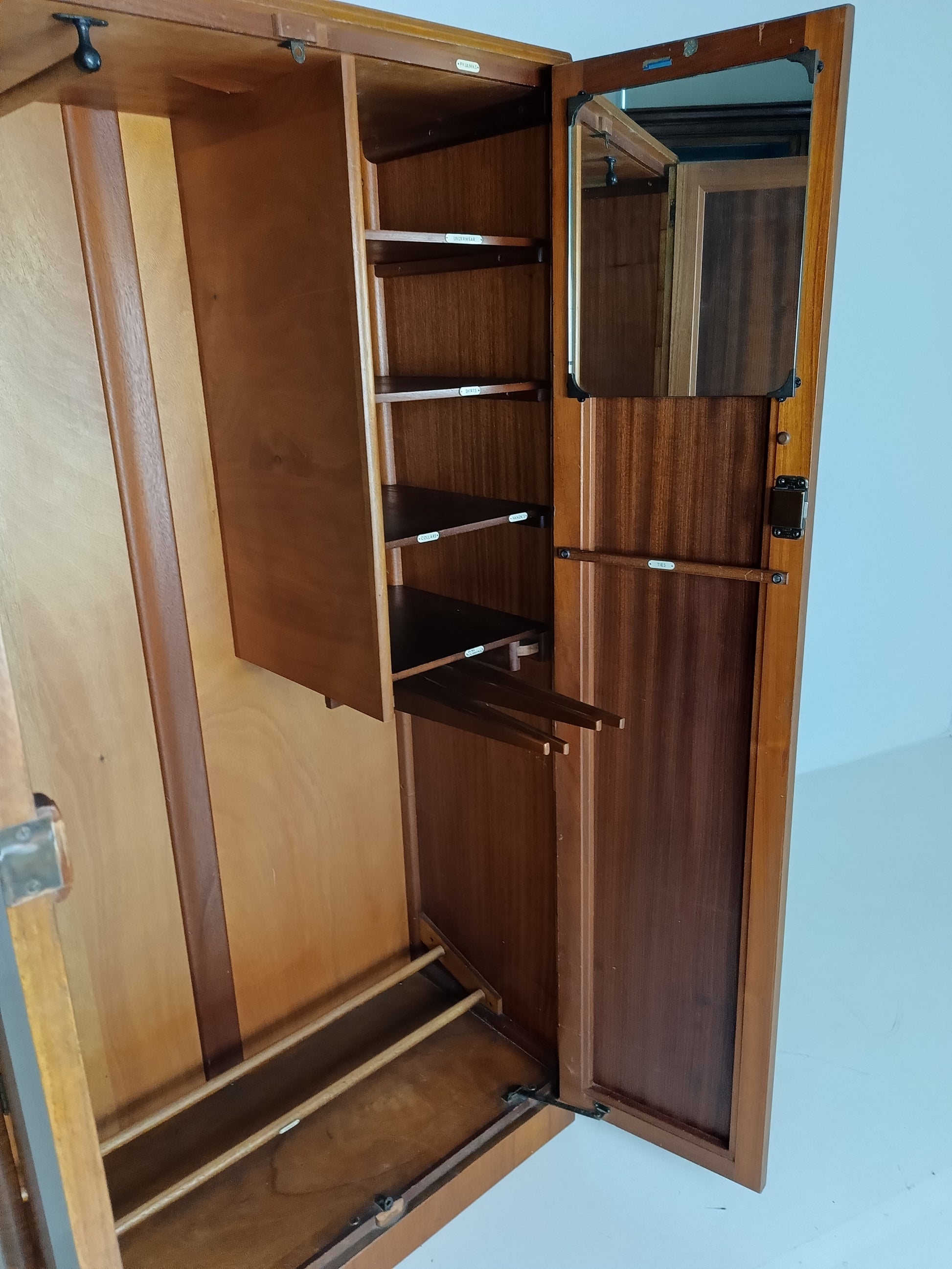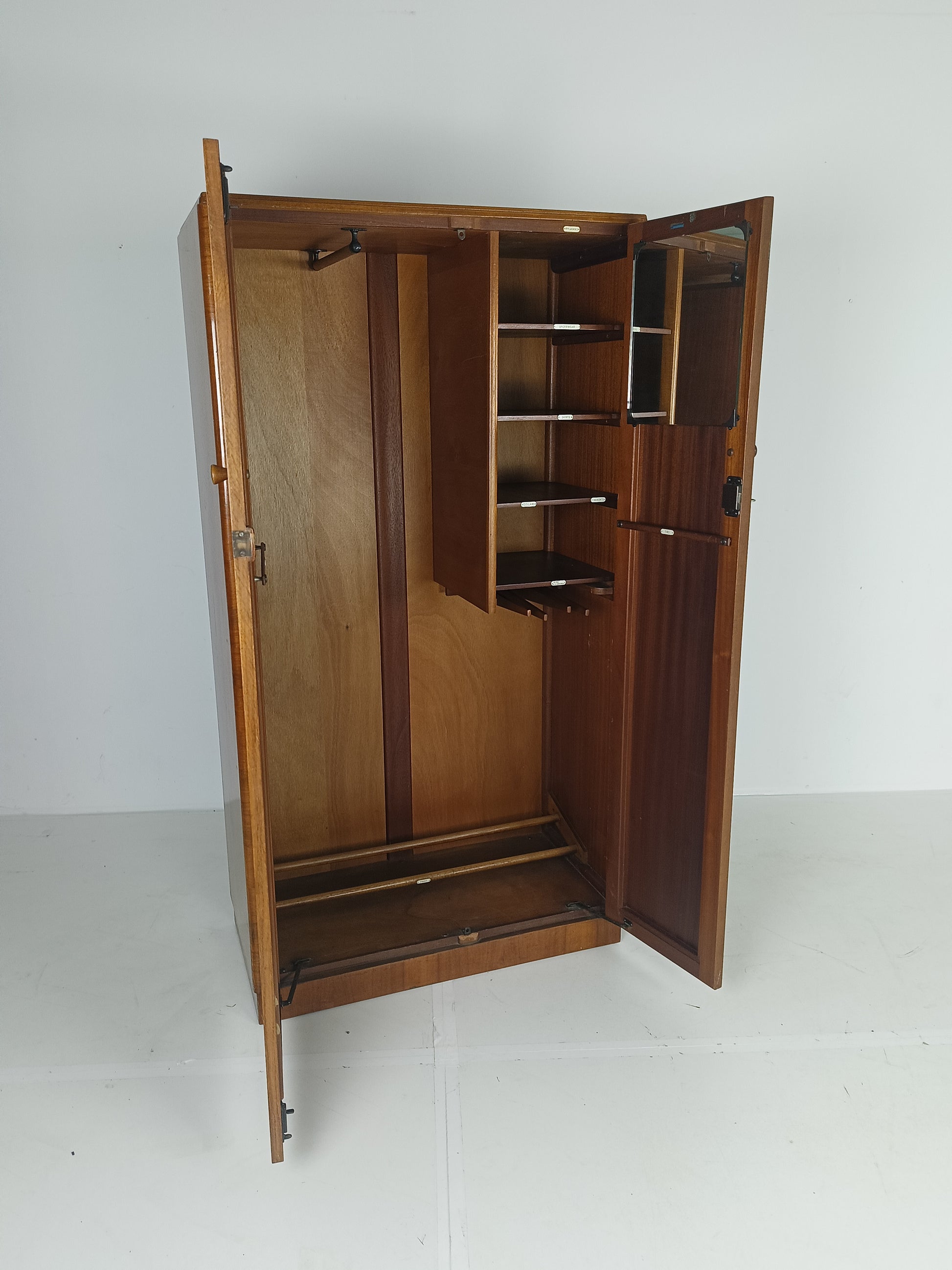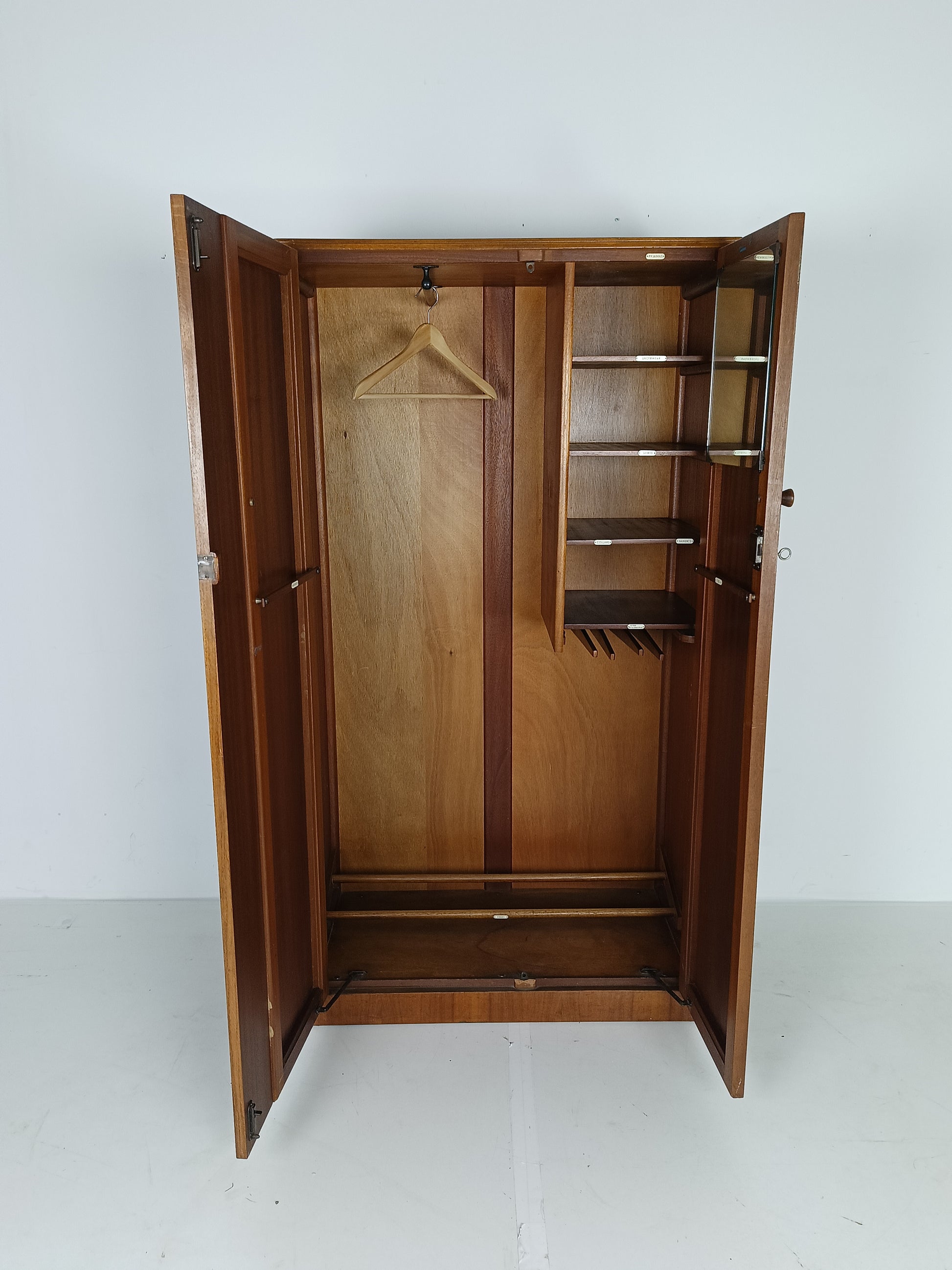 The cabinet has a sleek design but is at the same time elegantly finished with burl walnut veneer. With a handy, compact interior layout with compartments on the left side and an extendable rod on the right. With labels including hats, hankerchiefs, socks, underwear, shirts, studs, ties/scarves, shoes etc.
