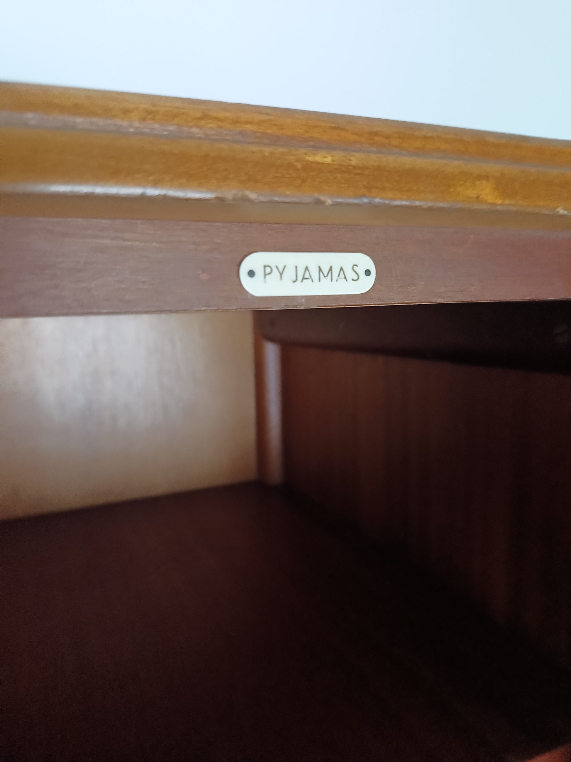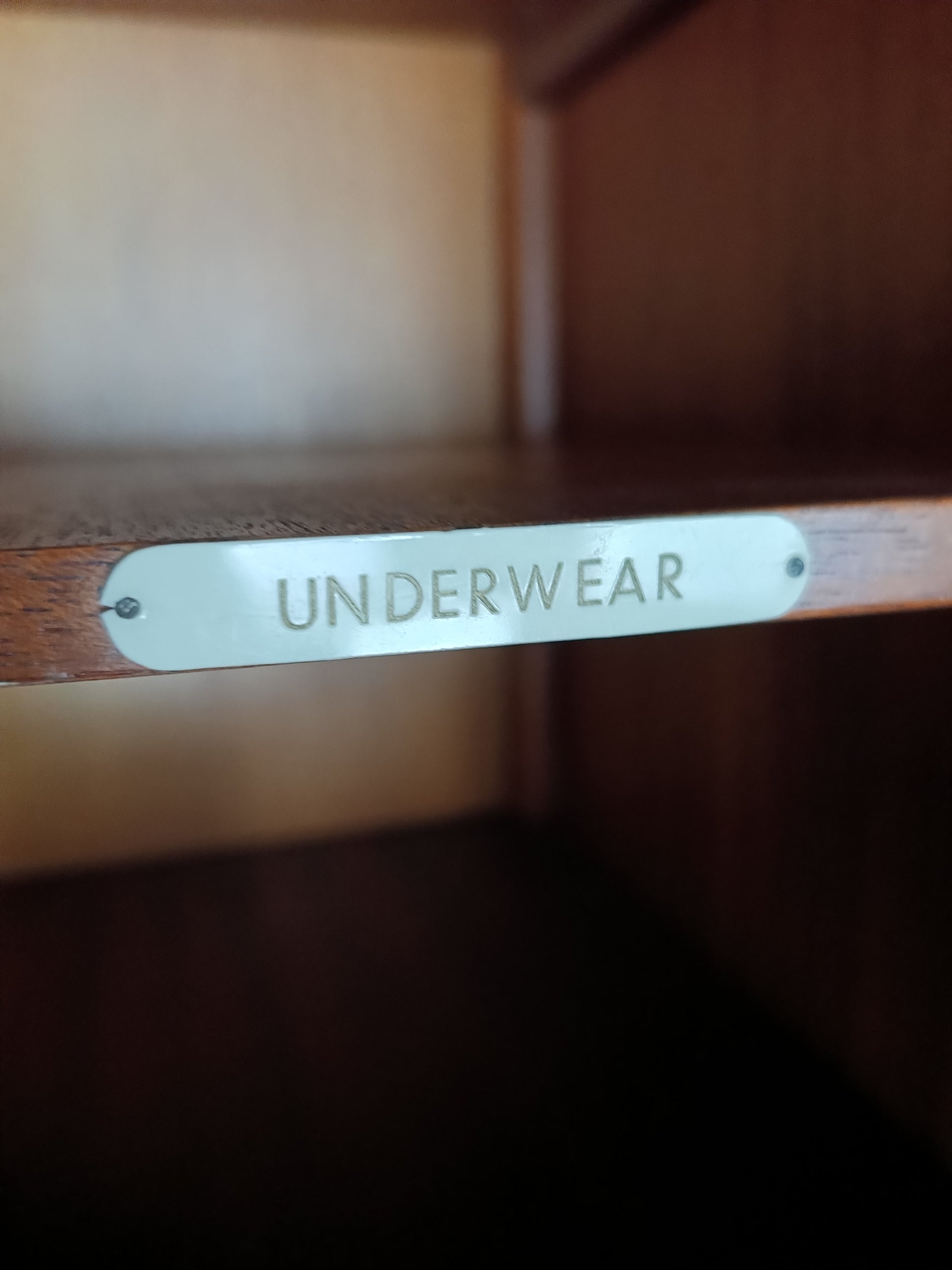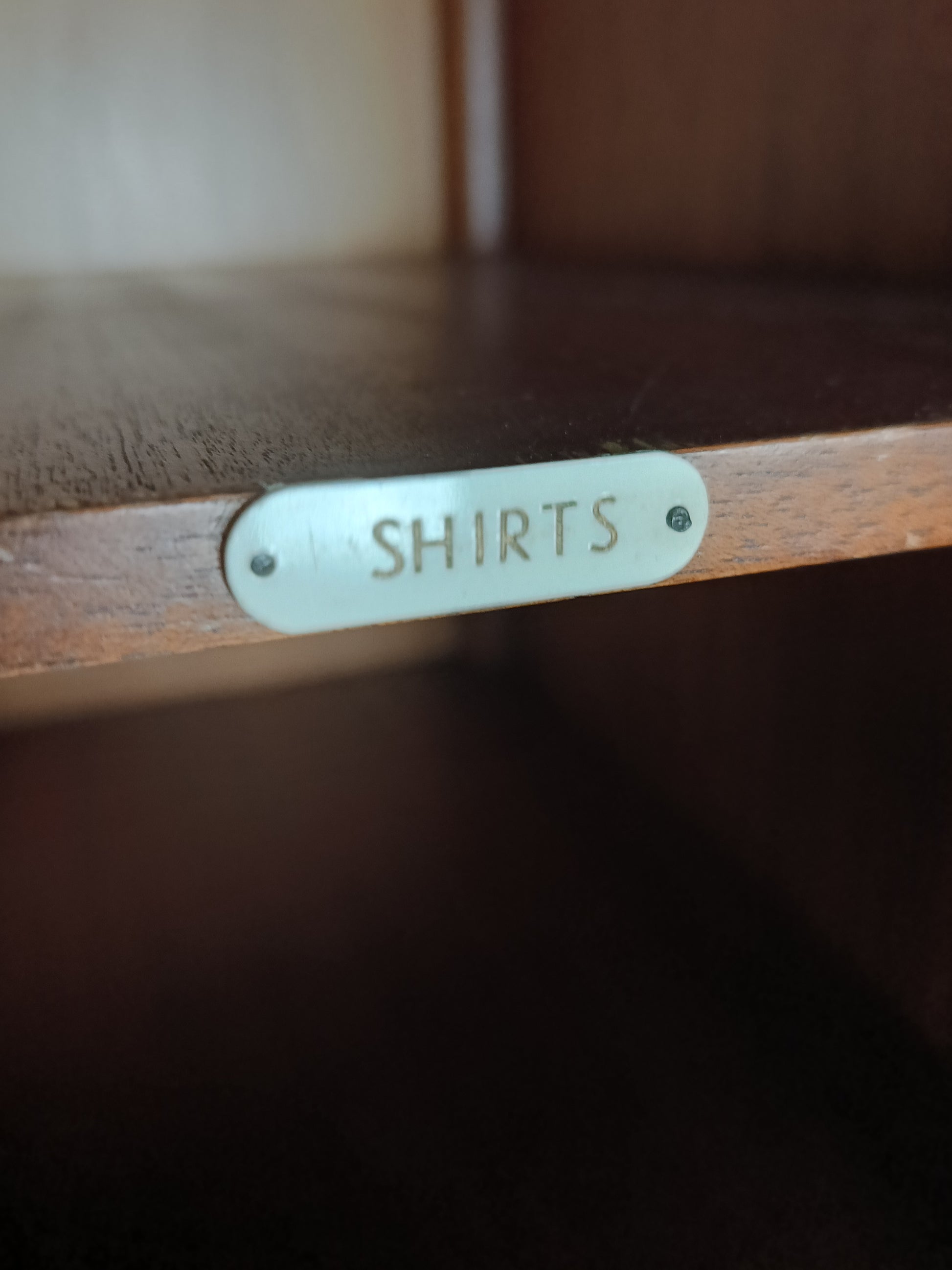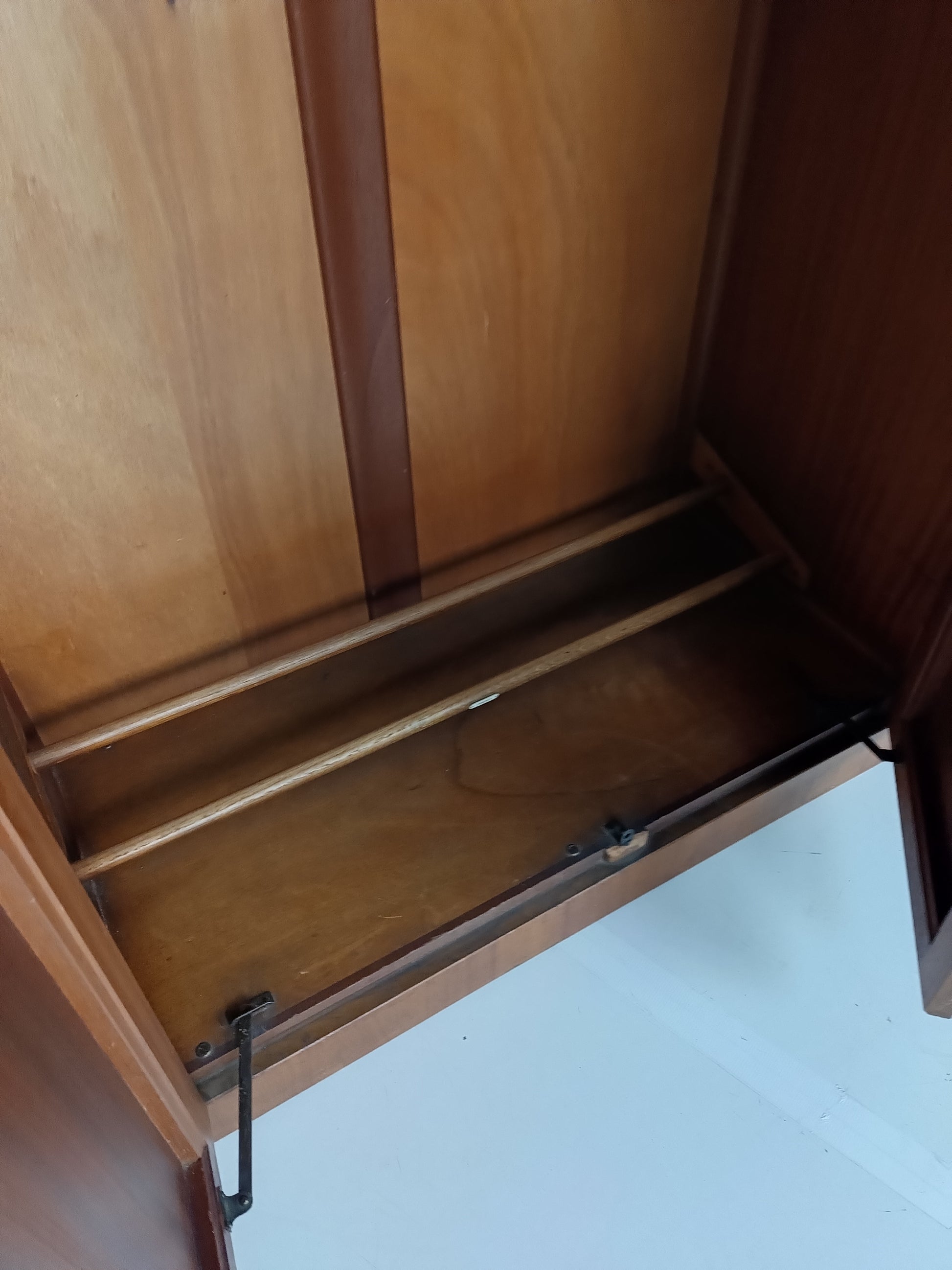 The cabinet has a sleek design but is at the same time elegantly finished with burl walnut veneer. With a handy, compact interior layout with compartments on the left side and an extendable rod on the right. With labels including hats, hankerchiefs, socks, underwear, shirts, studs, ties/scarves, shoes etc.