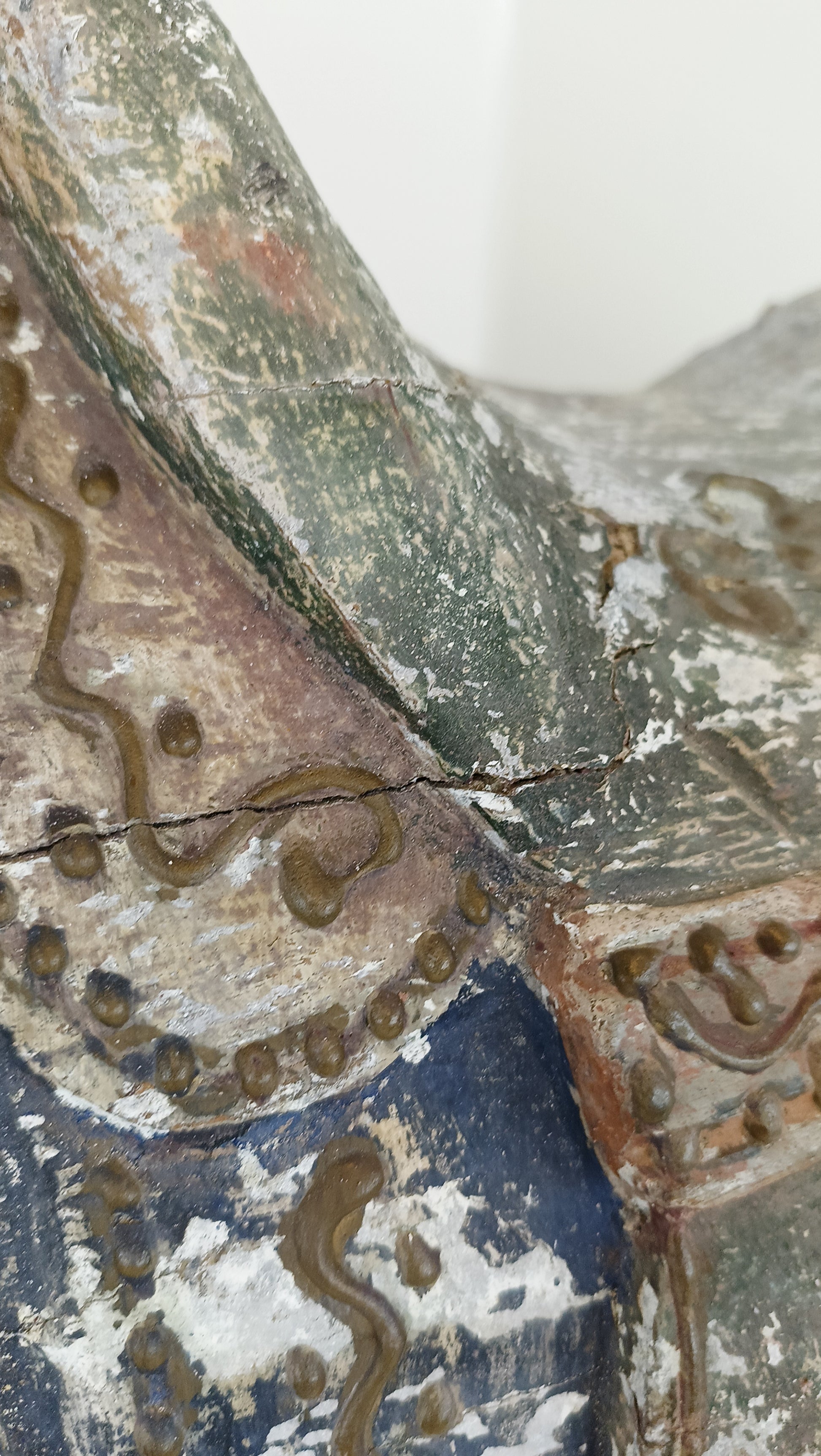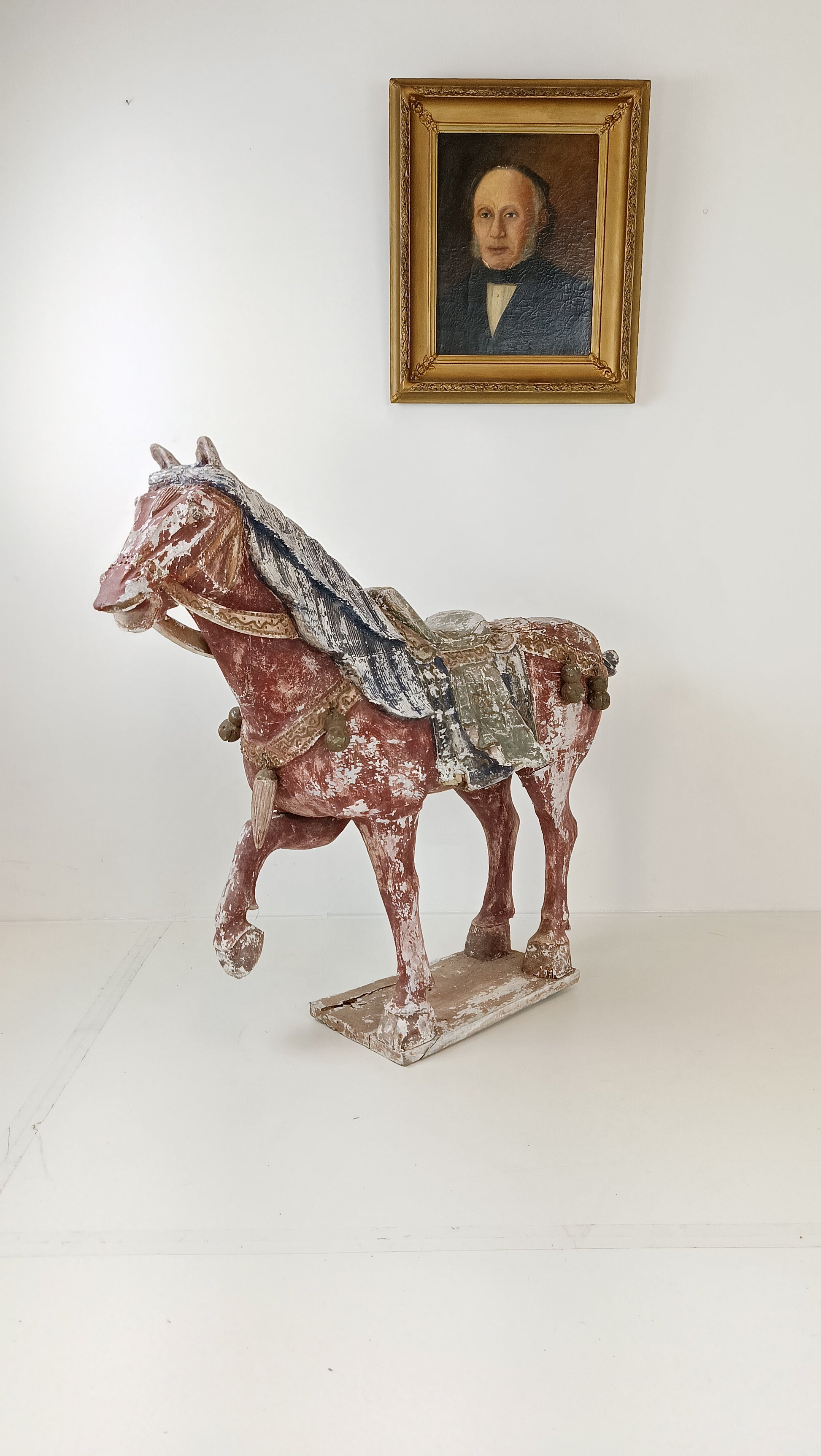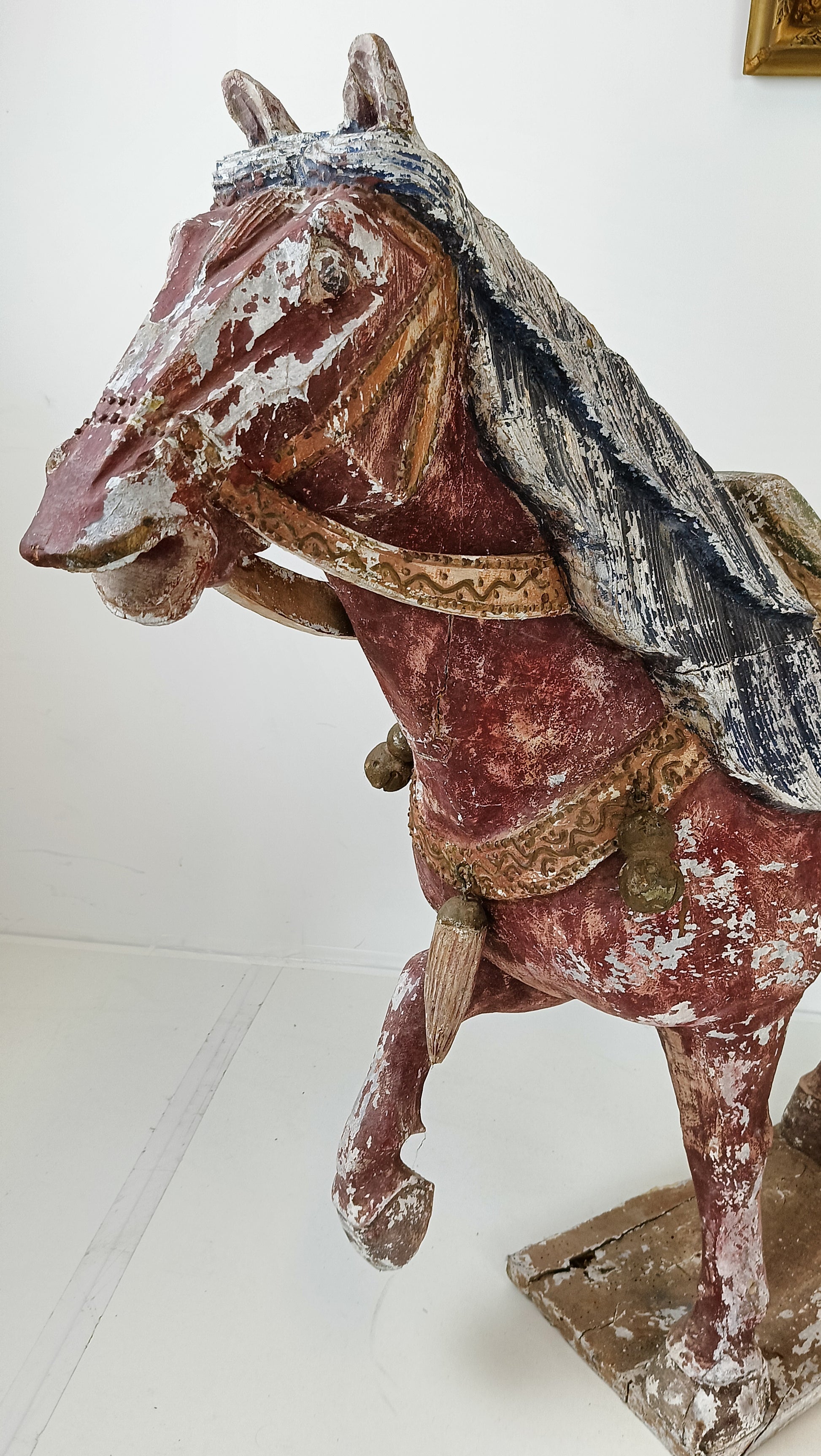 Polychrome horse made out of carved wood in Chinese style from the middle of the 20th century. This sculpture has some wear such as scratches and other signs of aging.