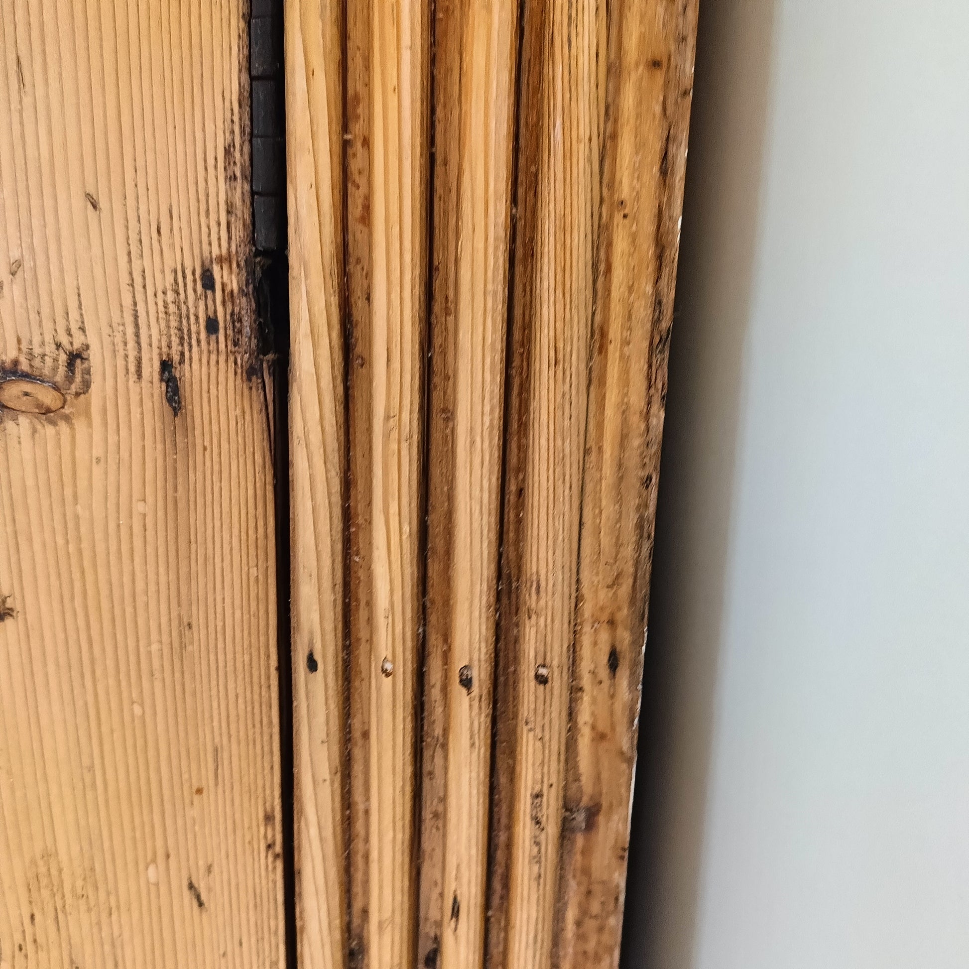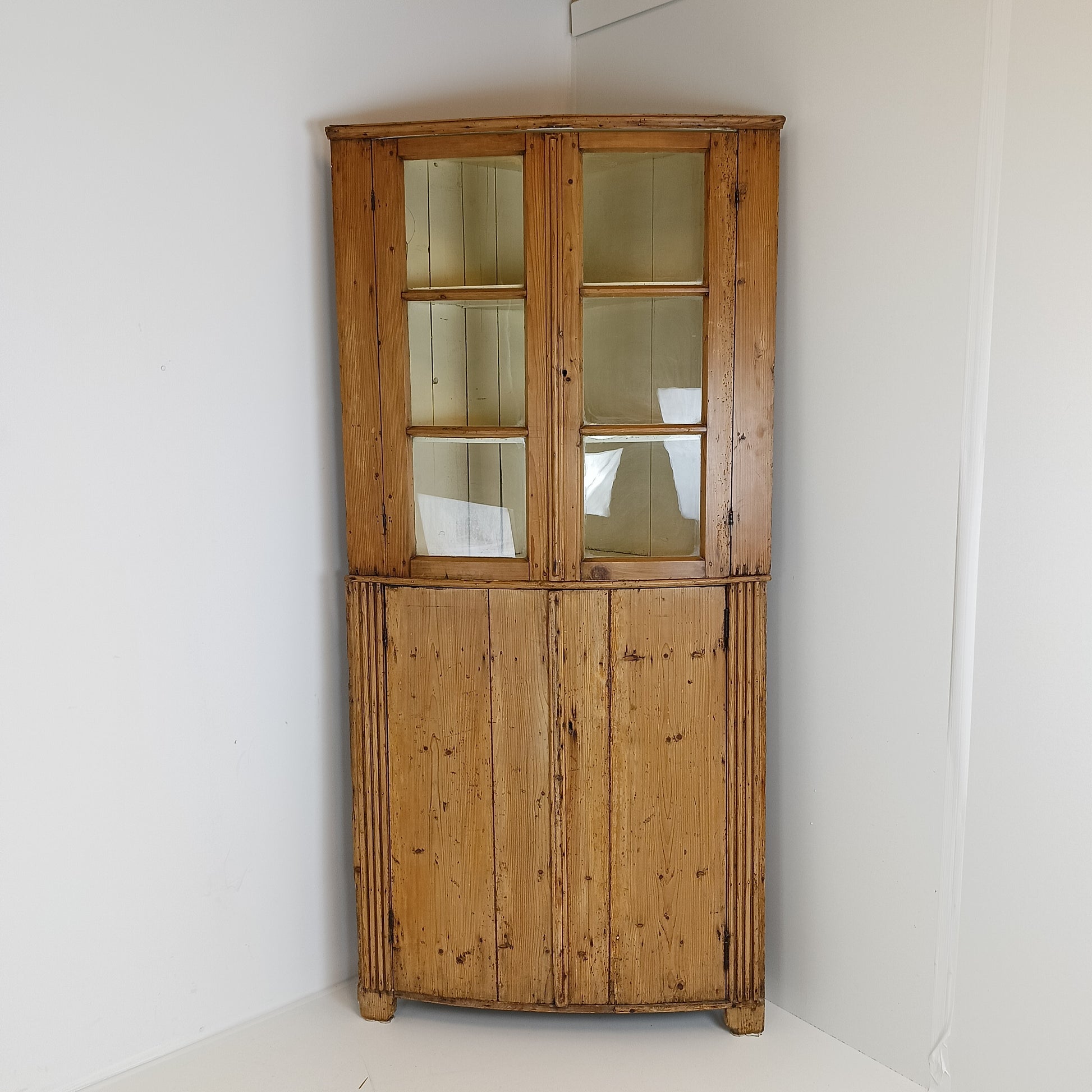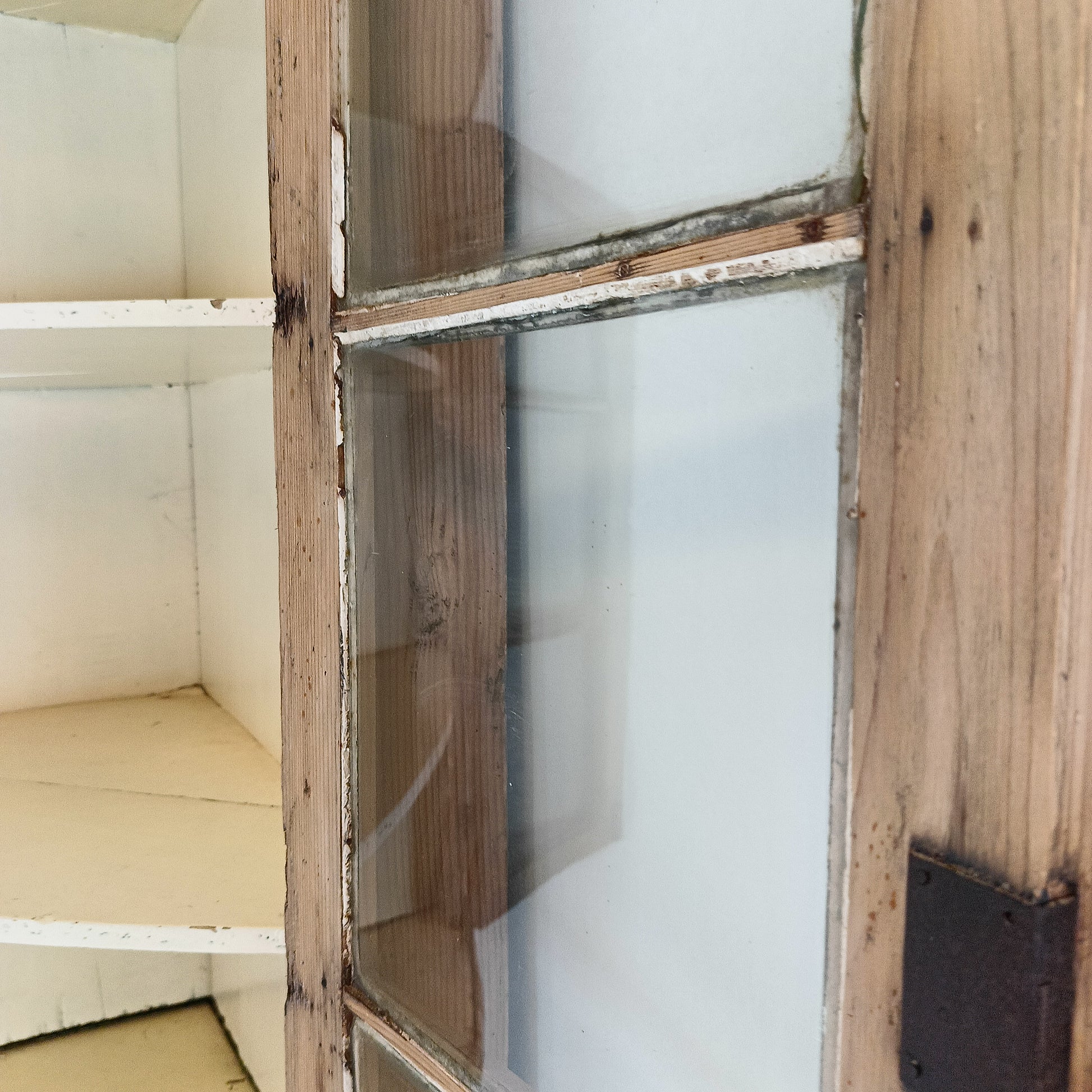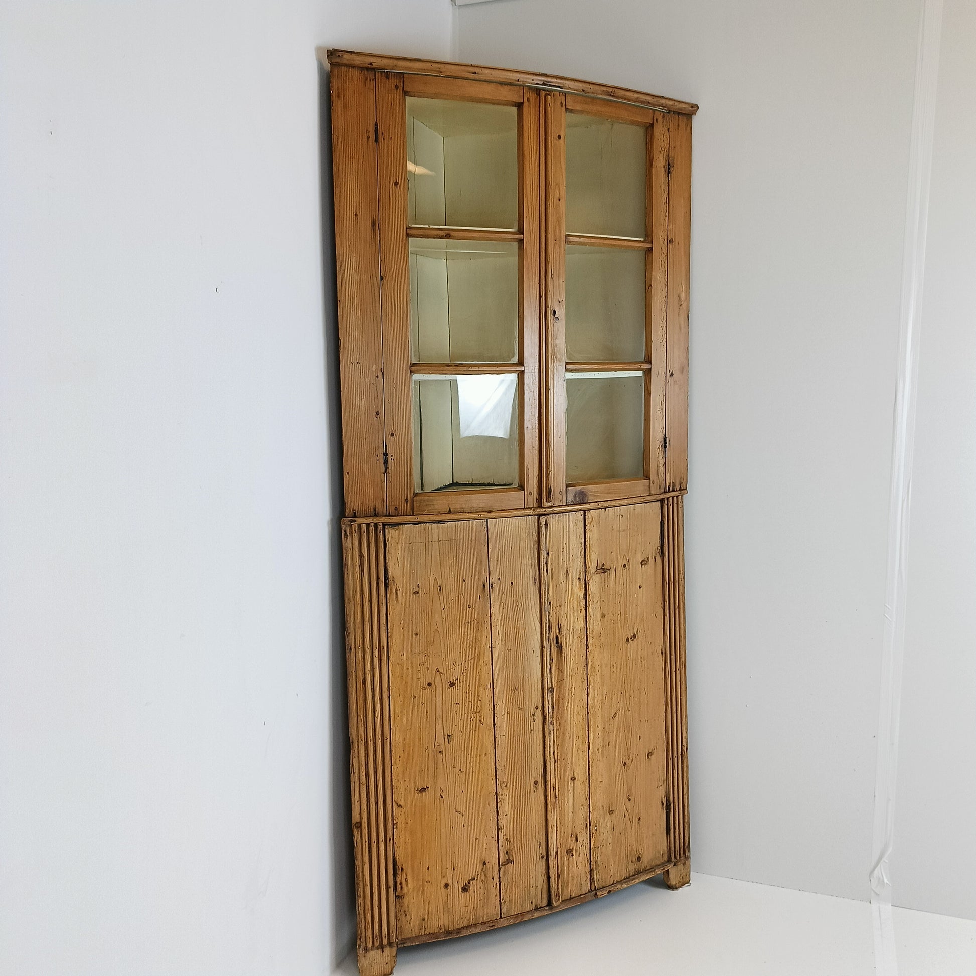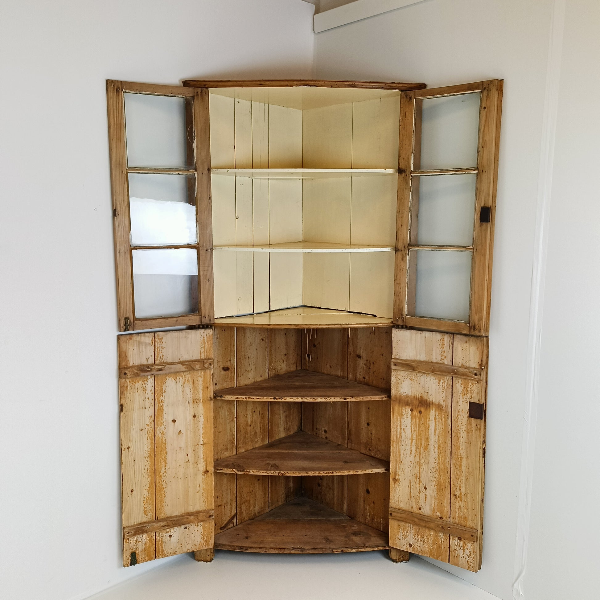 This charming pine corner cabinet features old glass on the top, adding a antique touch to its rustic design. The beautiful patina highlights its age, giving the wood a warm, aged look. While it shows signs of wear consistent with its age and use, these imperfections add character, making it a unique and timeless piece perfect for any space. There is a small crack in one of the glass doors, shown in pictures.