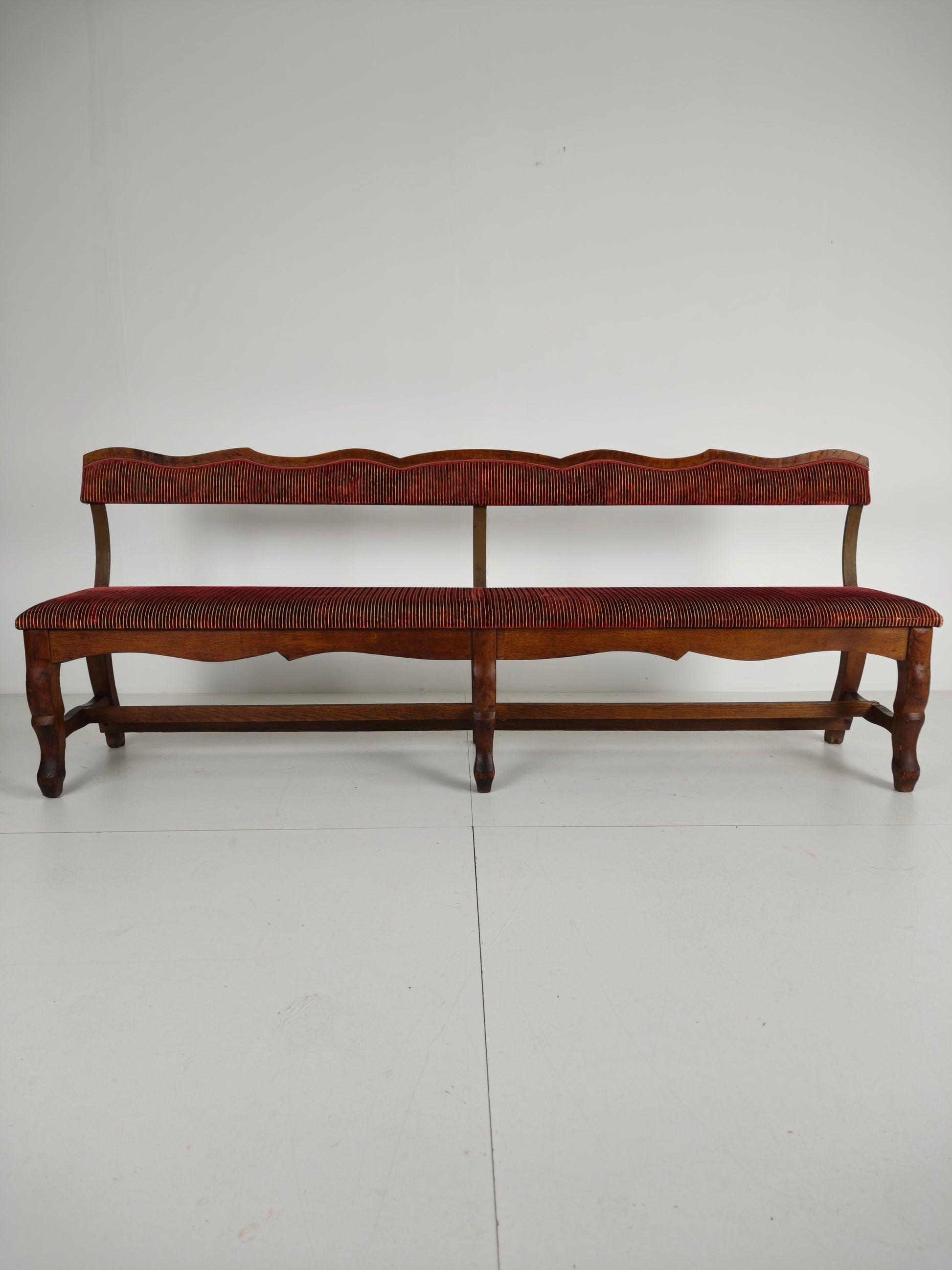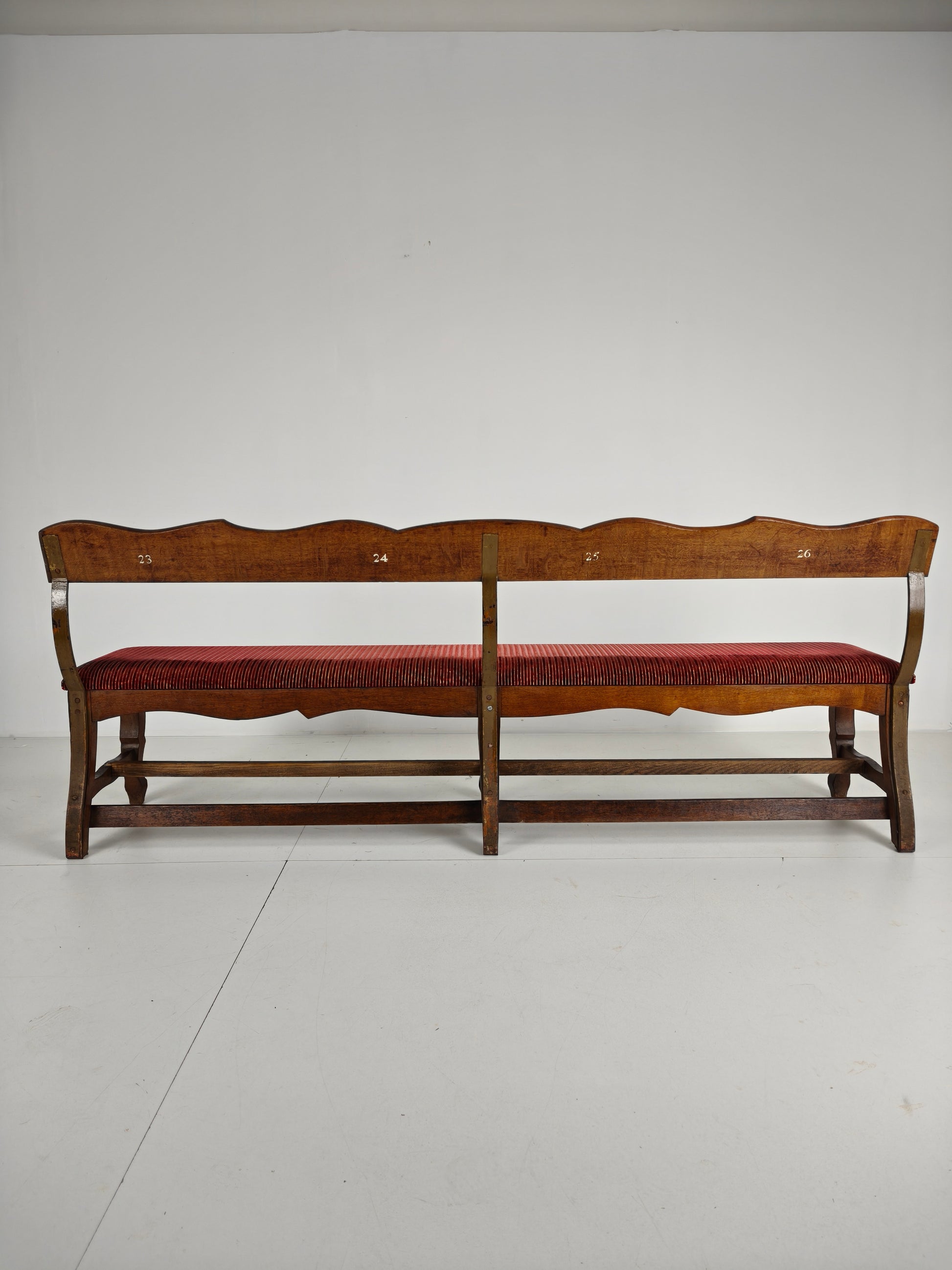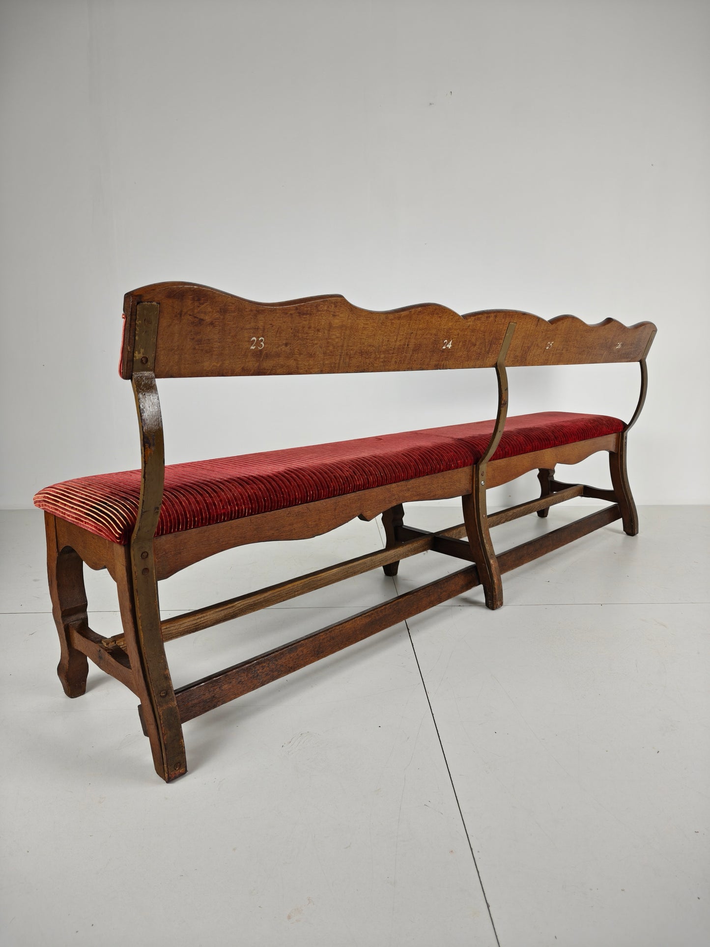 The bench has been professionally upholstered in a rich red ribbed velvet fabric, which is in excellent condition. Numbered on the reverse (23 / 24 / 25 / 26), adding to its authenticity and character.