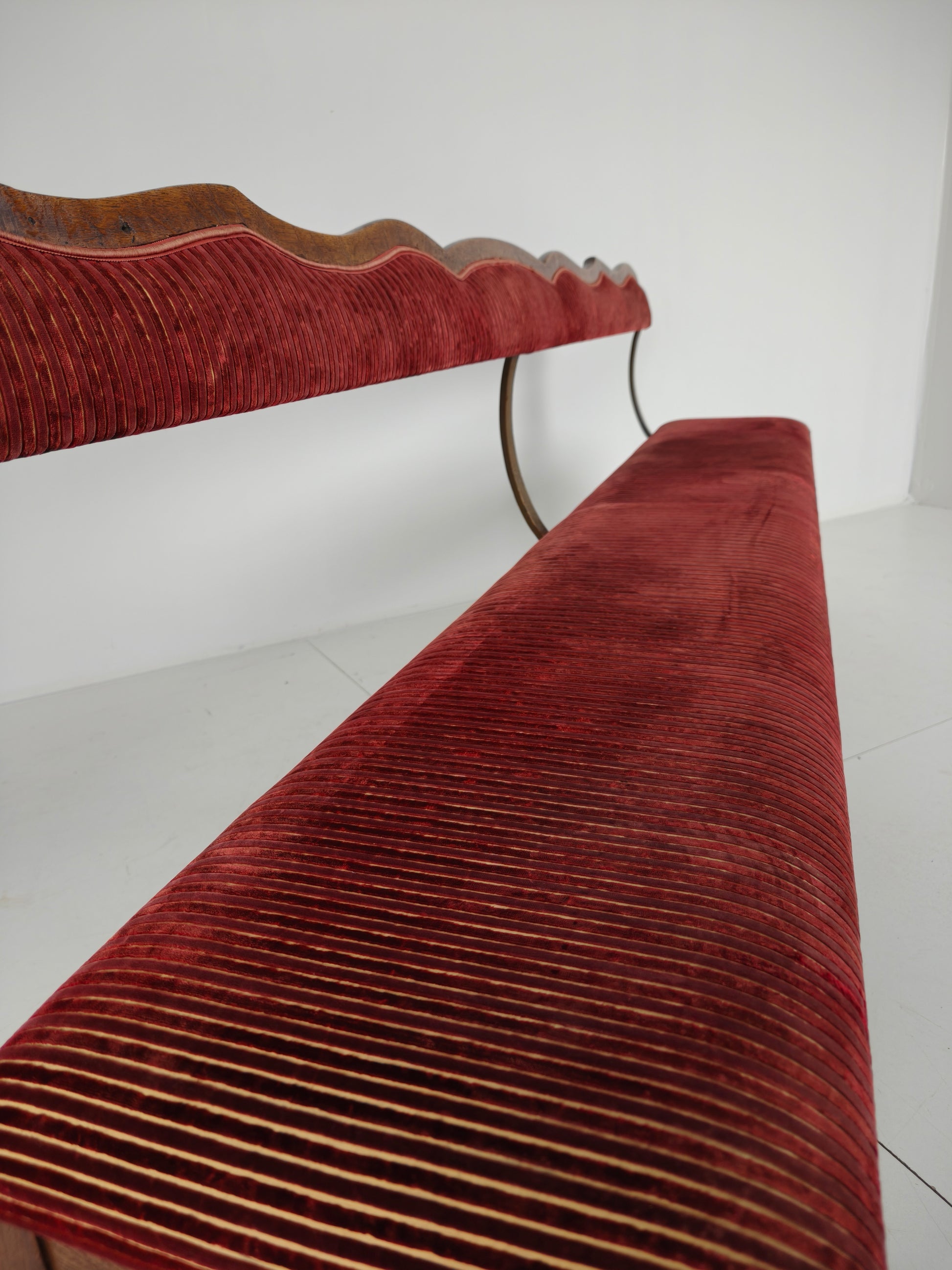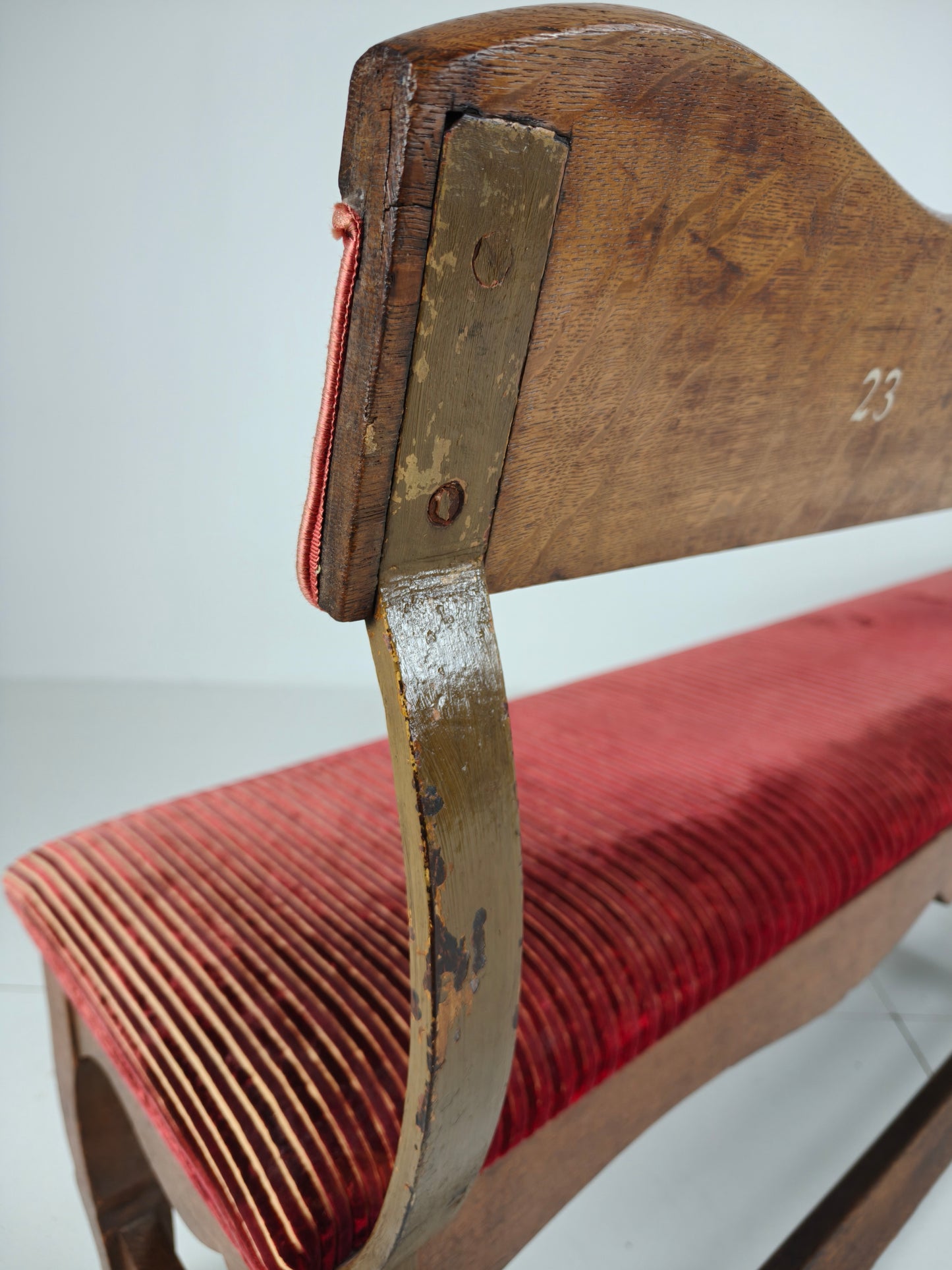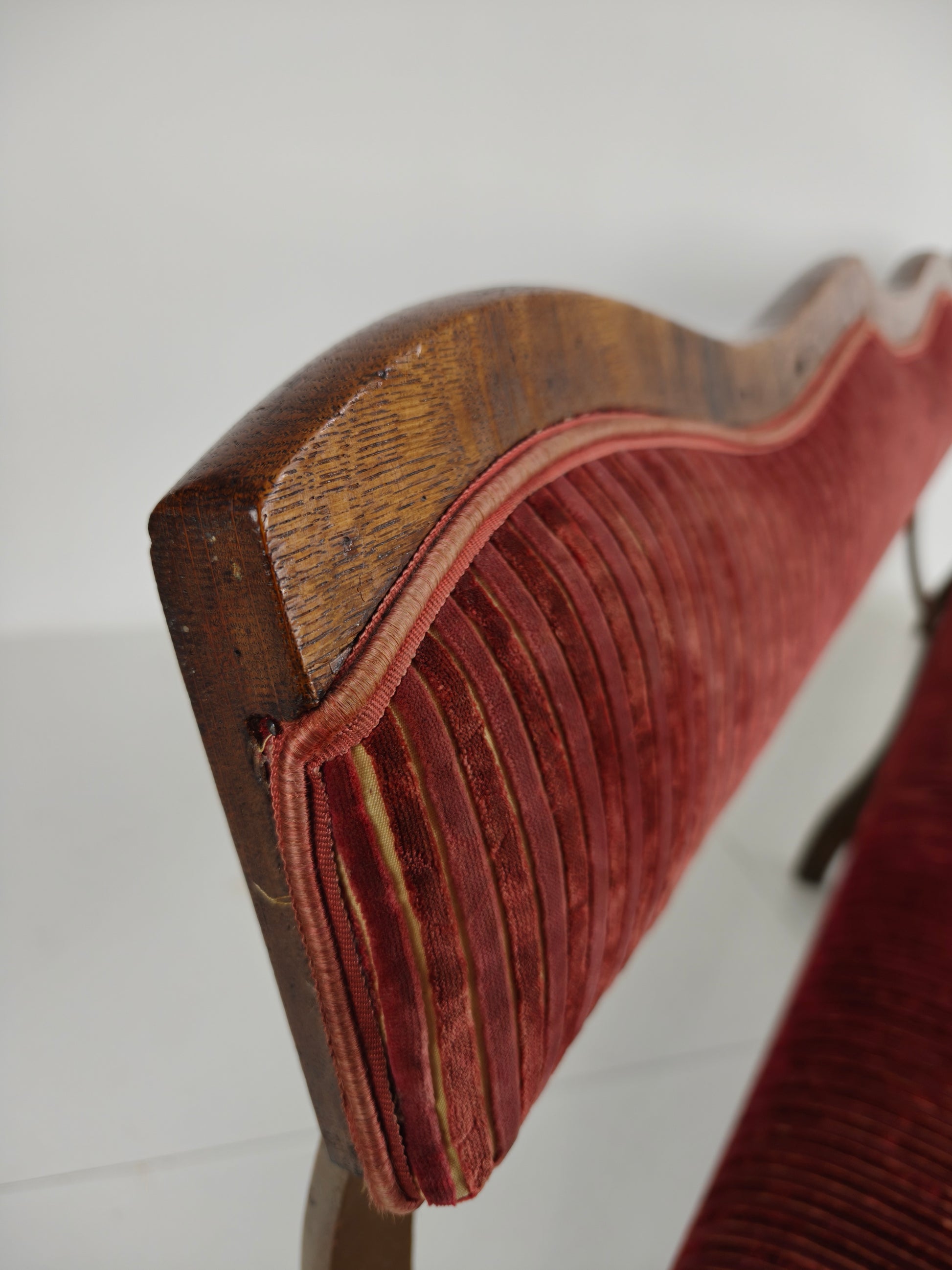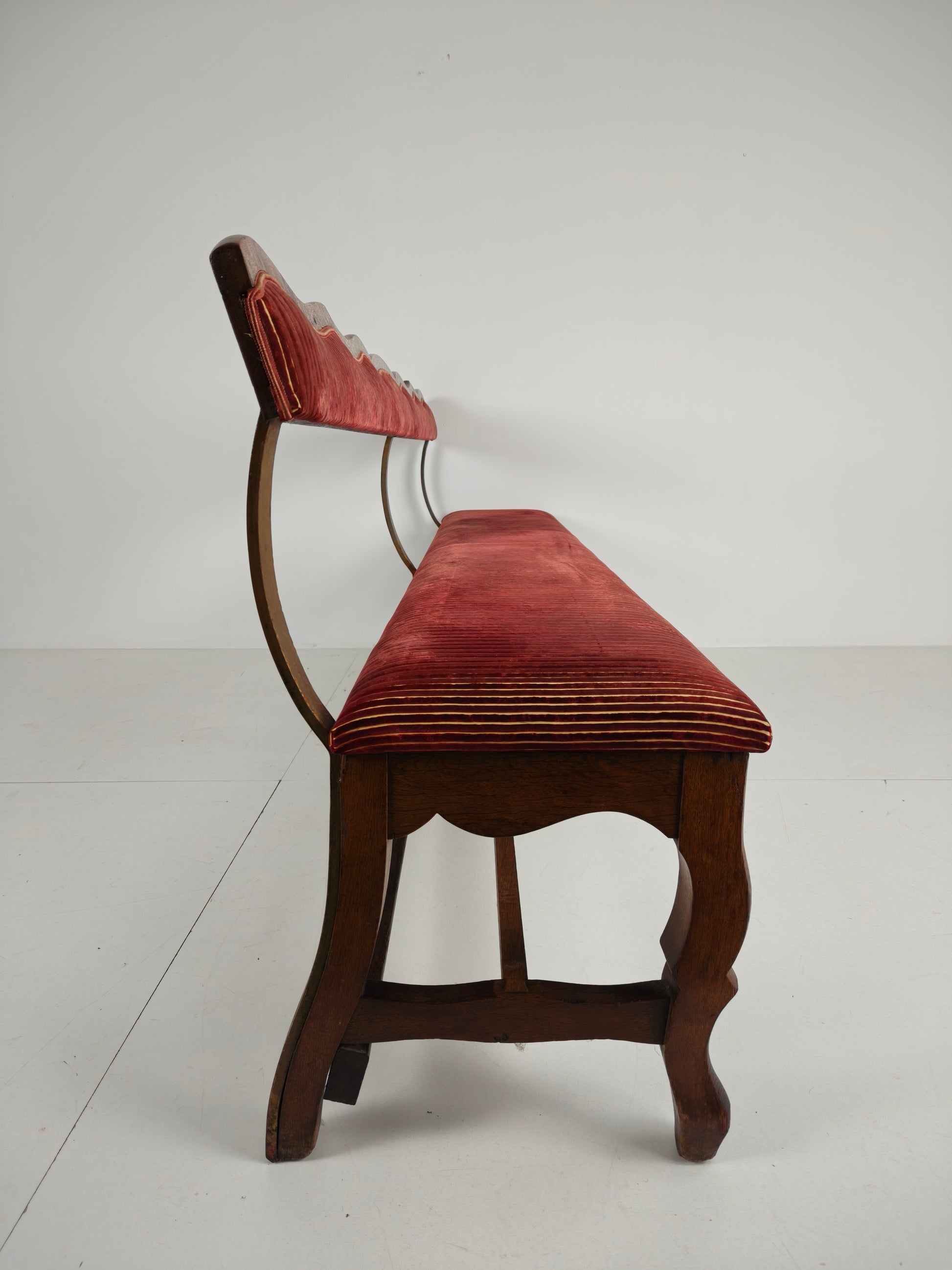 The bench has been professionally upholstered in a rich red ribbed velvet fabric, which is in excellent condition. Numbered on the reverse (23 / 24 / 25 / 26), adding to its authenticity and character.