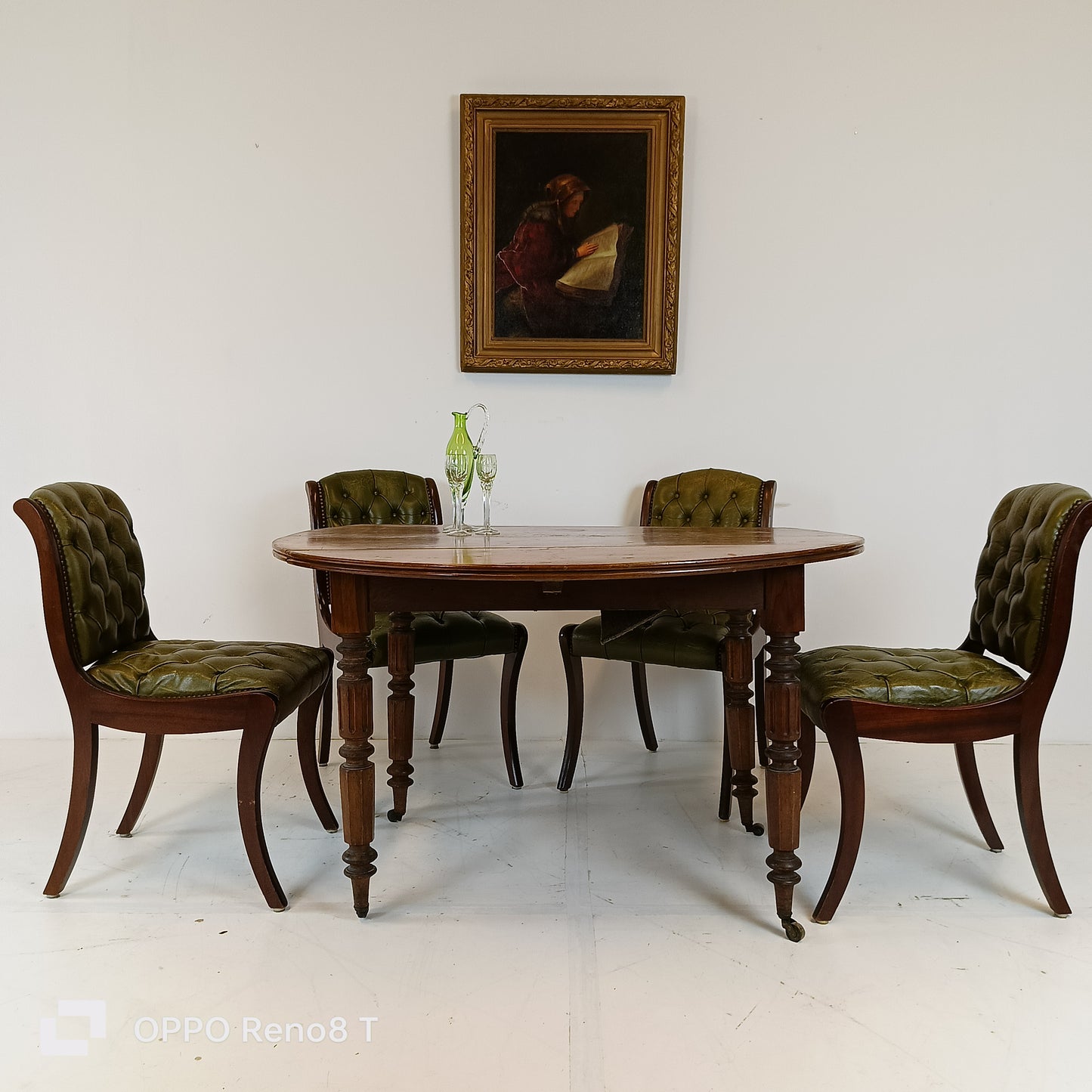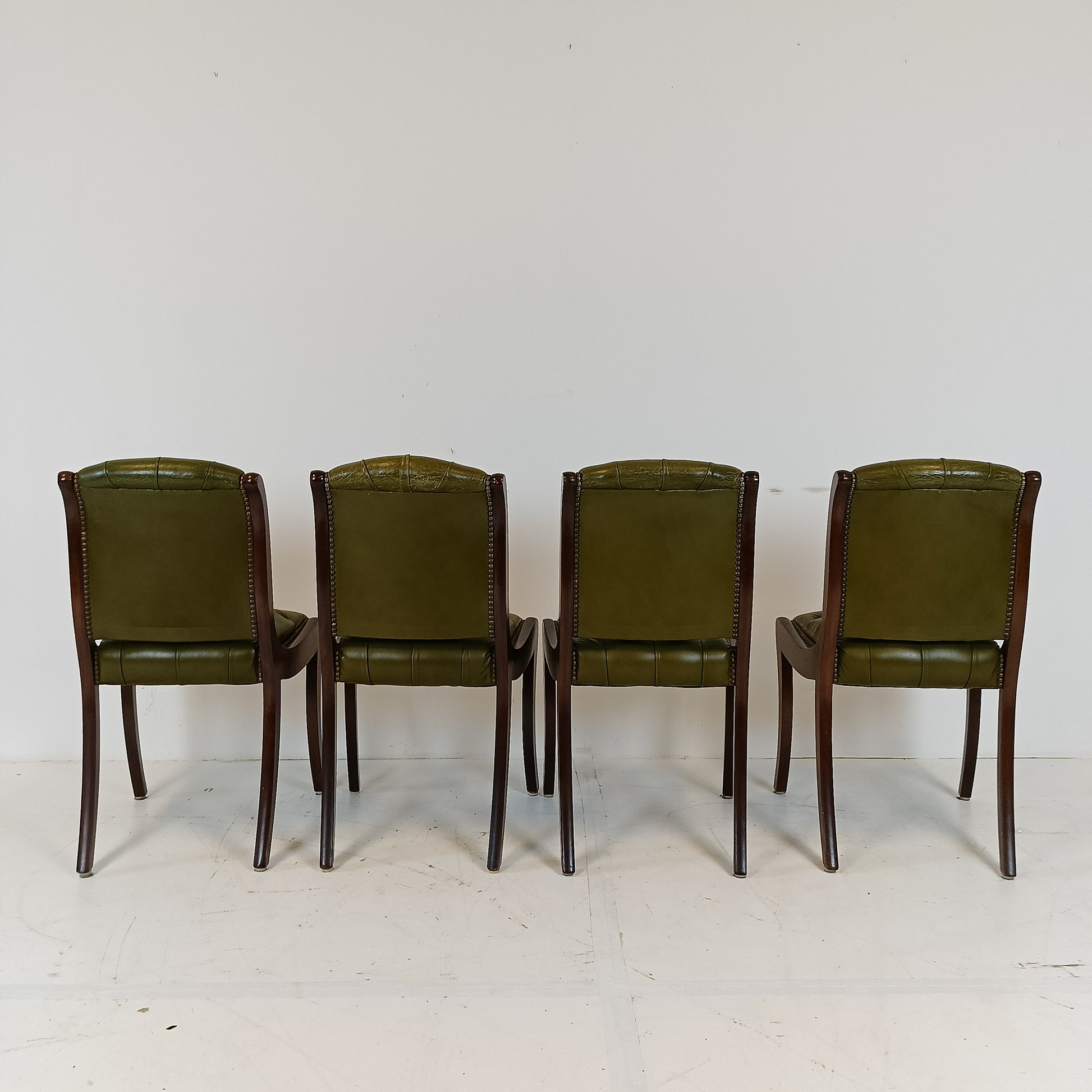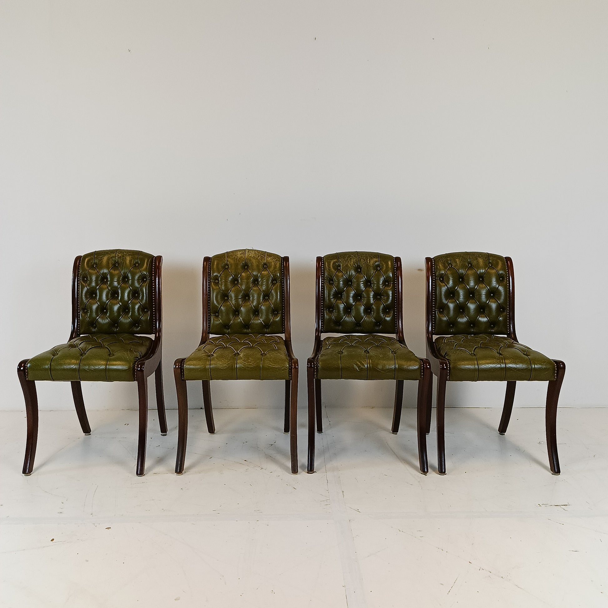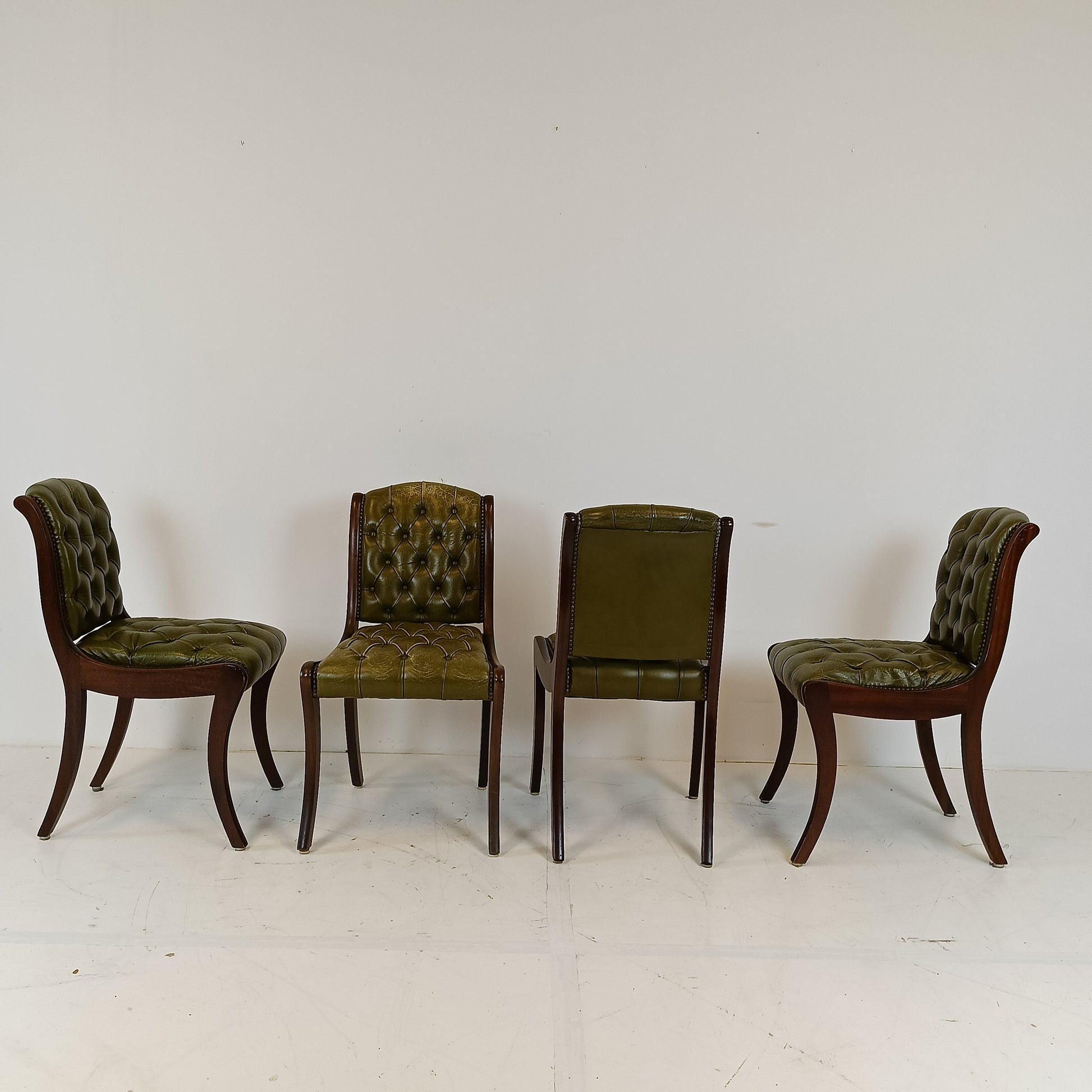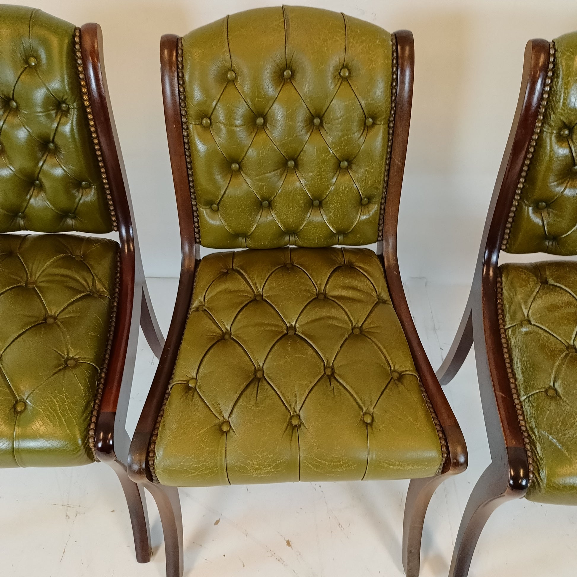 Typical green leather chesterfield lady chairs. Sold as set only.