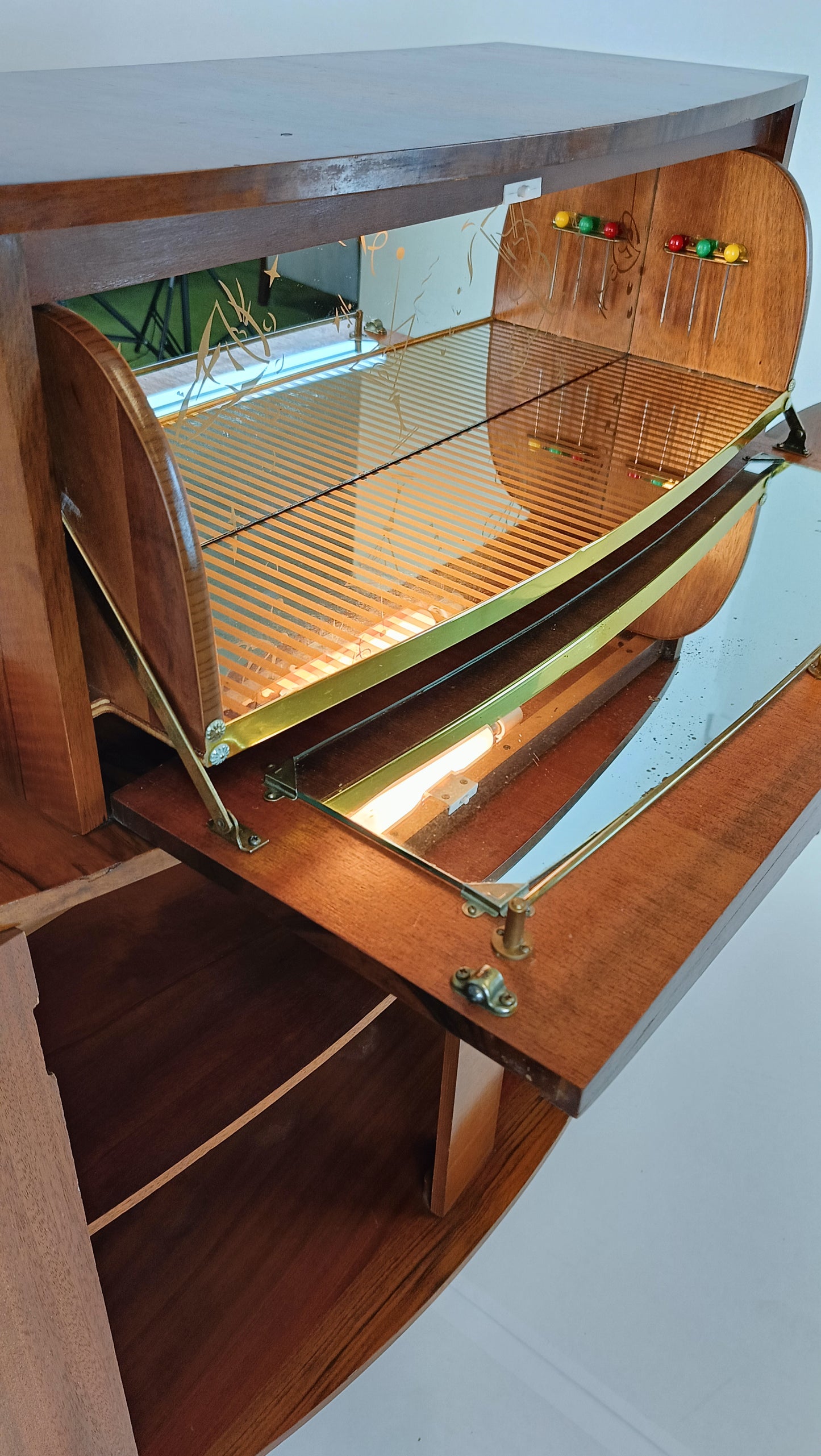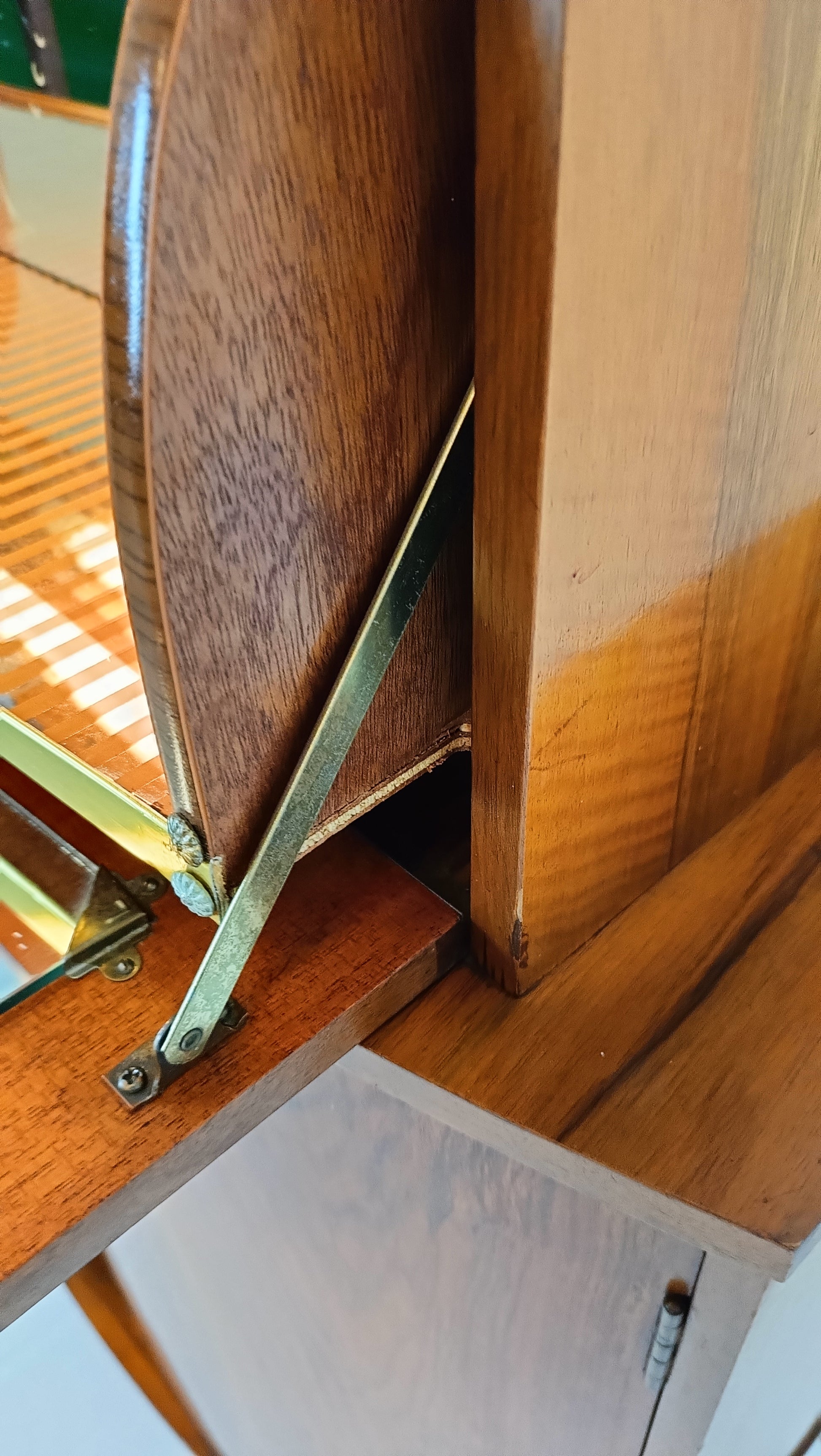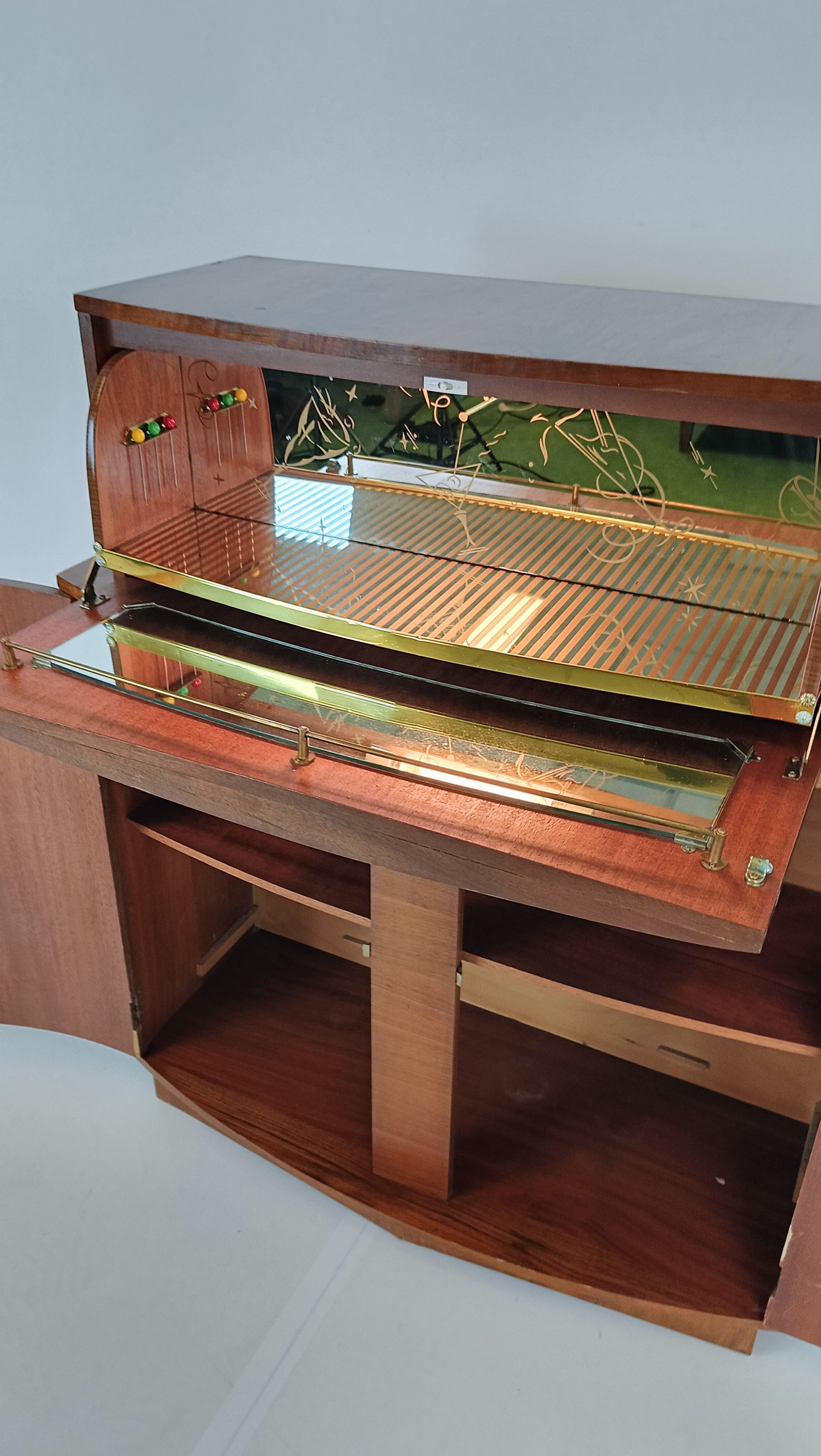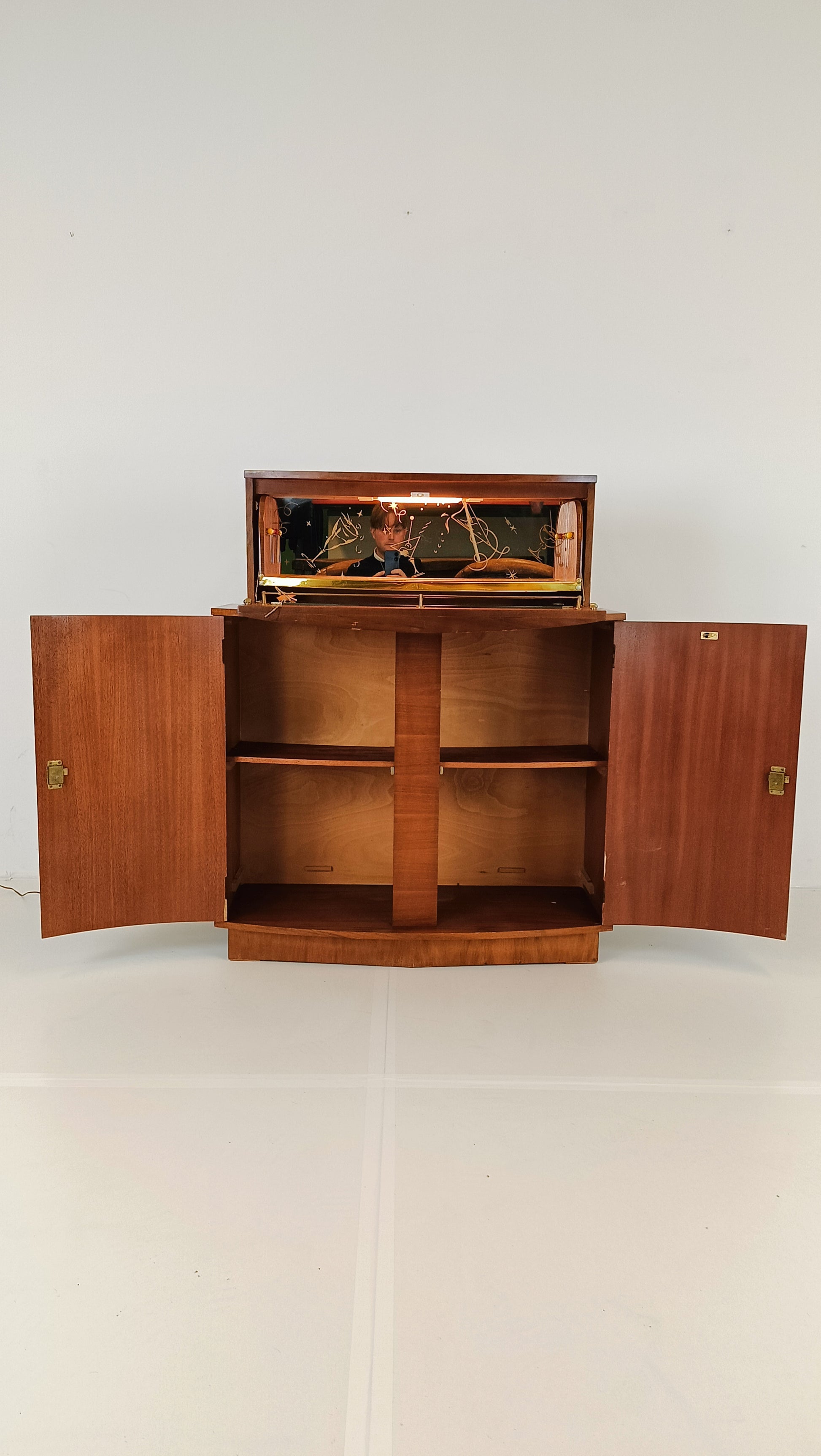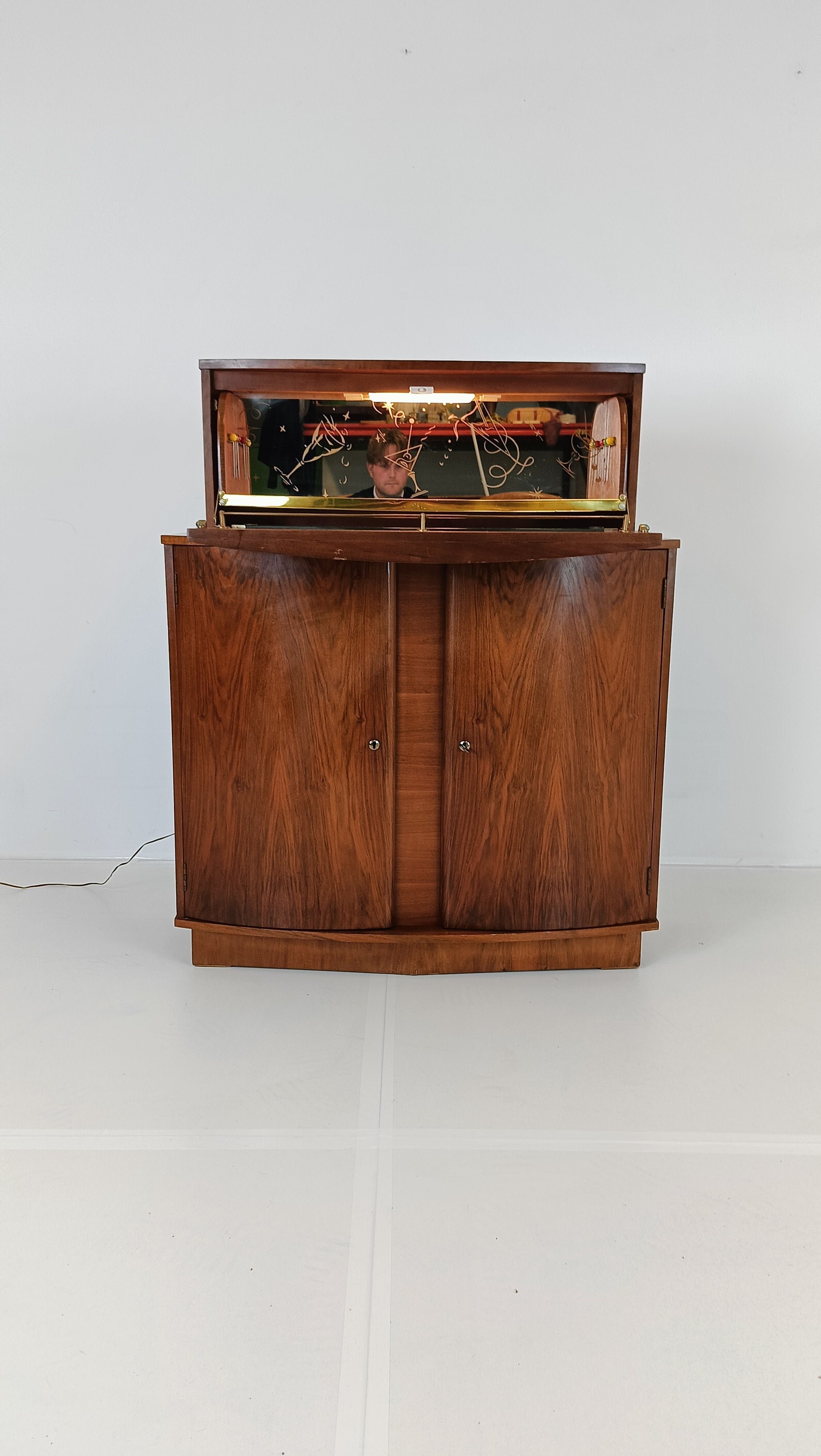 With summer in the air this incredible 1950s ‘Sureline’ George Serlin and Sons cocktail bar is bringing on the Cozy! Drop down front with Spectacular mirrored interior with atomic cocktail motifs to back glass, all original cocktail sticks present. Fab cherry red padded vinyl front on a walnut cabinet. Sat on brass tipped spindle legs. Just fabulous ✨⚡️✨ condition is exceptional. Light is fully working. Contains key for front doors.