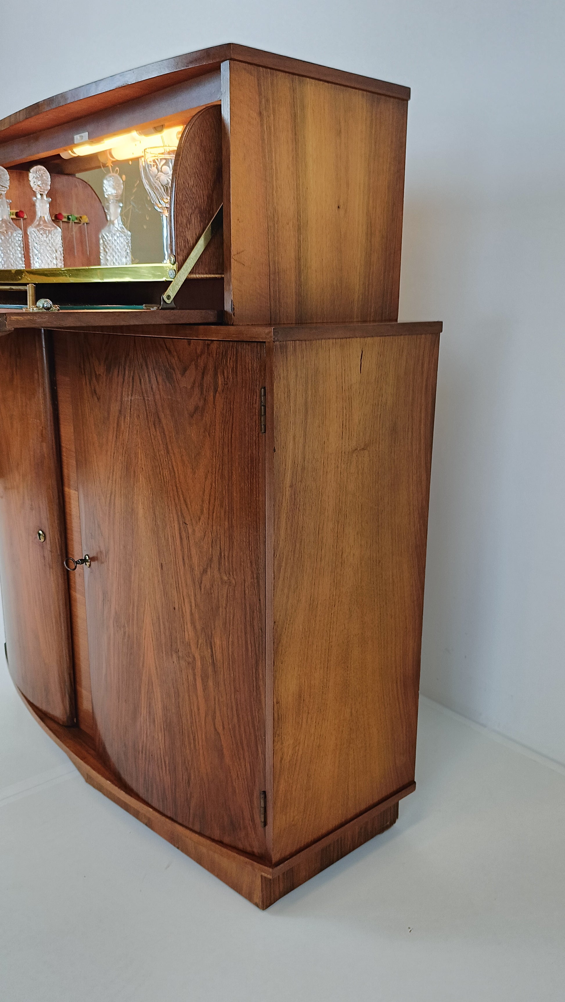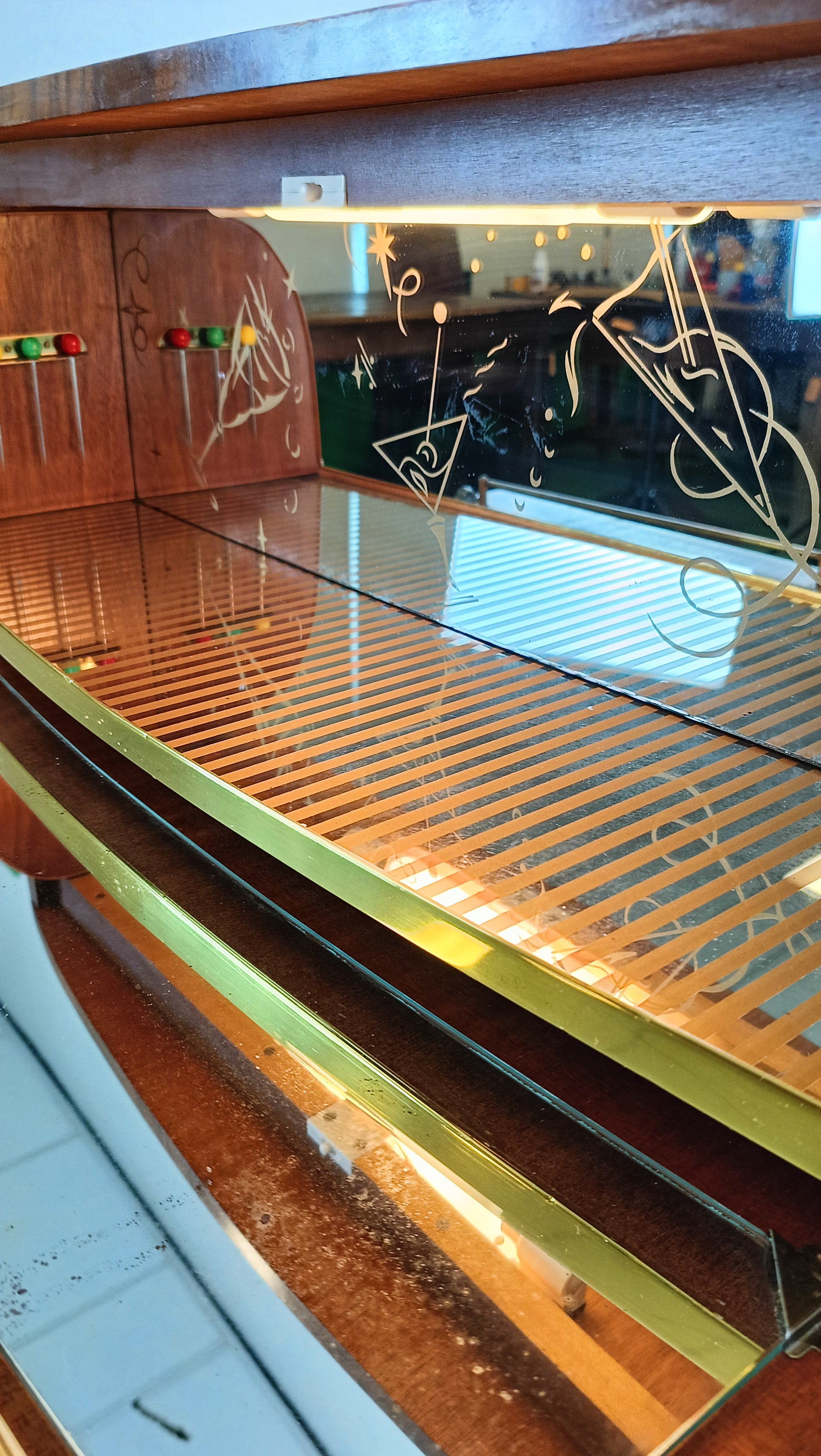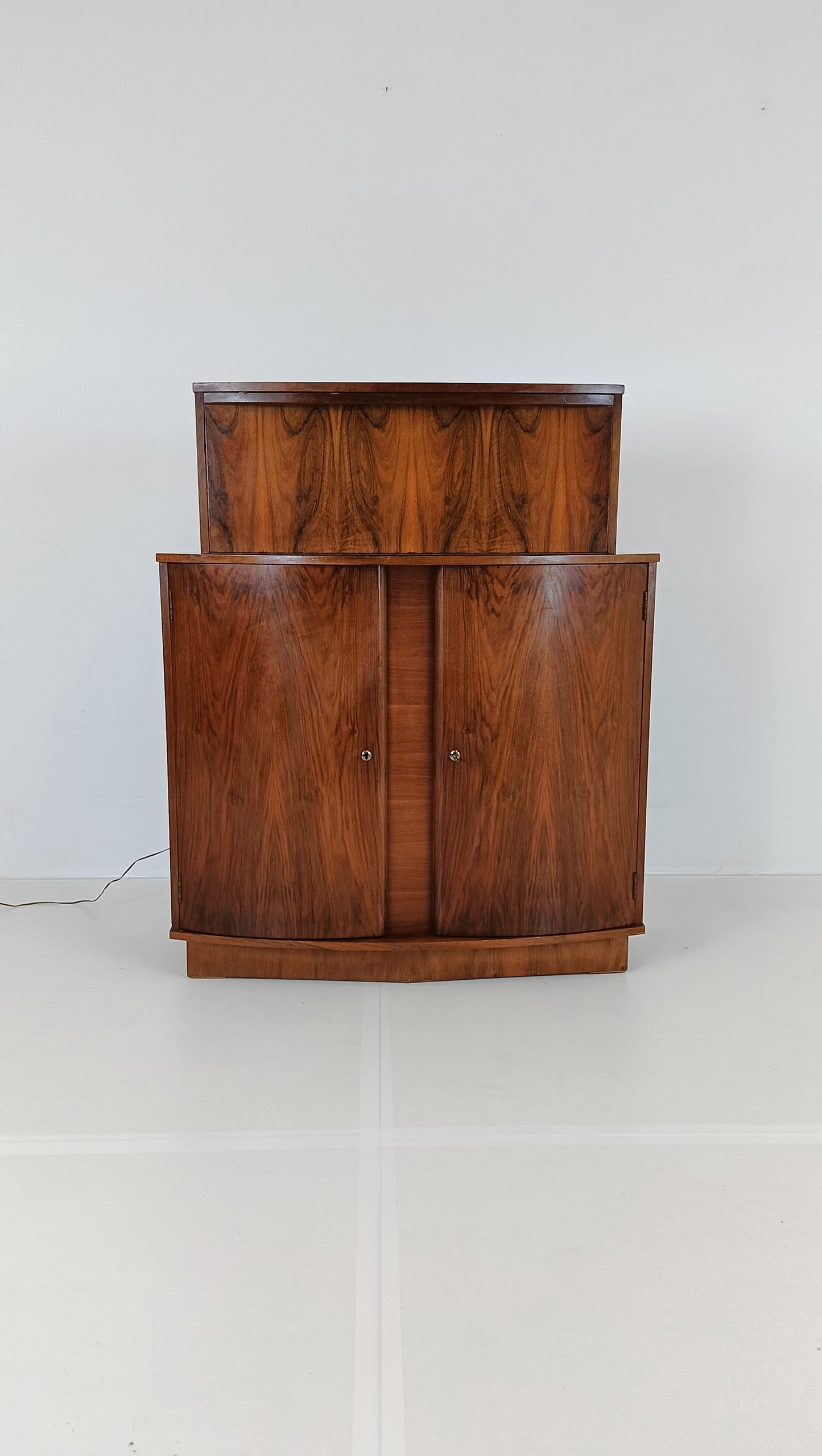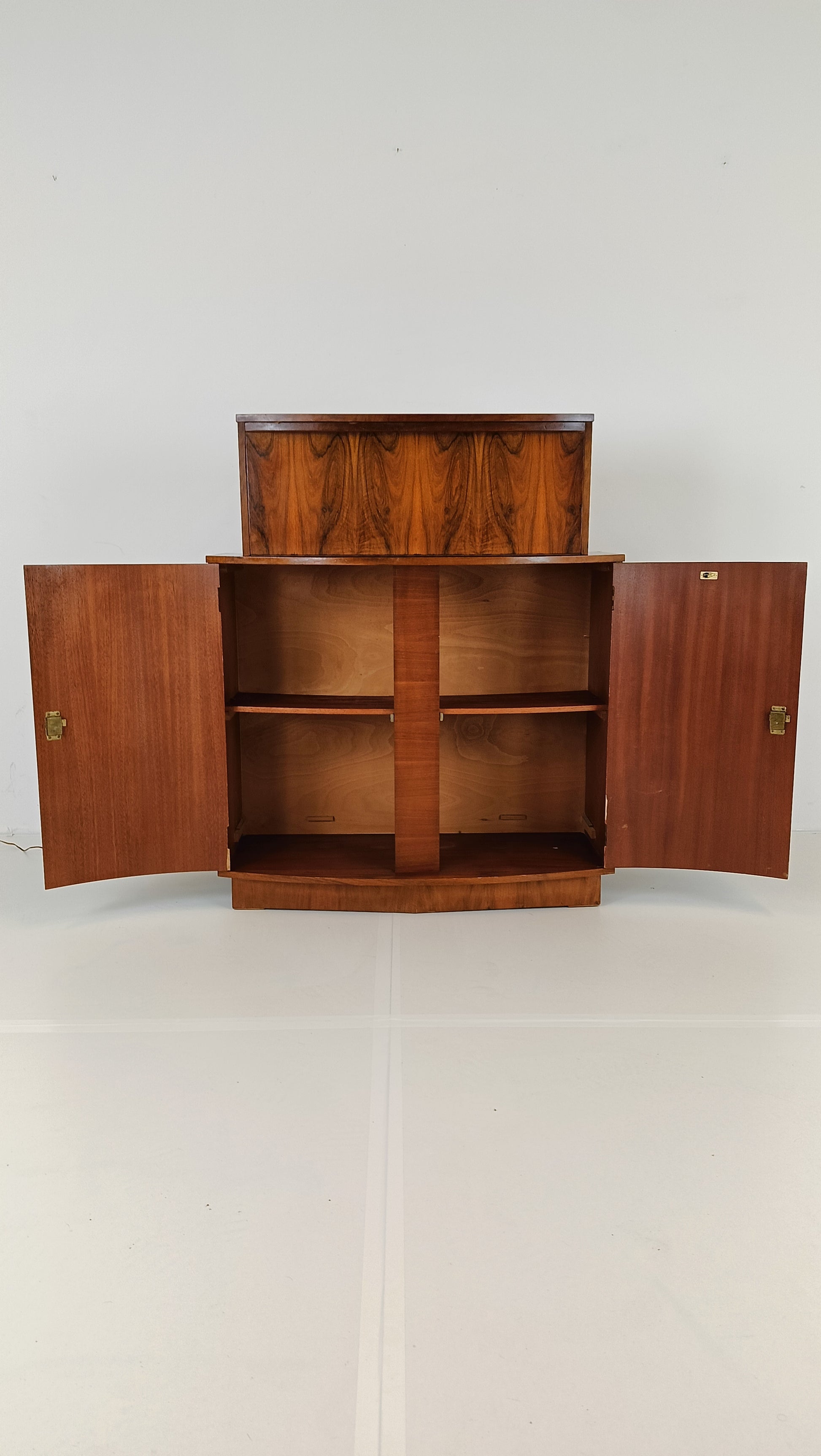 With summer in the air this incredible 1950s ‘Sureline’ George Serlin and Sons cocktail bar is bringing on the Cozy! Drop down front with Spectacular mirrored interior with atomic cocktail motifs to back glass, all original cocktail sticks present. Fab cherry red padded vinyl front on a walnut cabinet. Sat on brass tipped spindle legs. Just fabulous ✨⚡️✨ condition is exceptional. Light is fully working. Contains key for front doors.