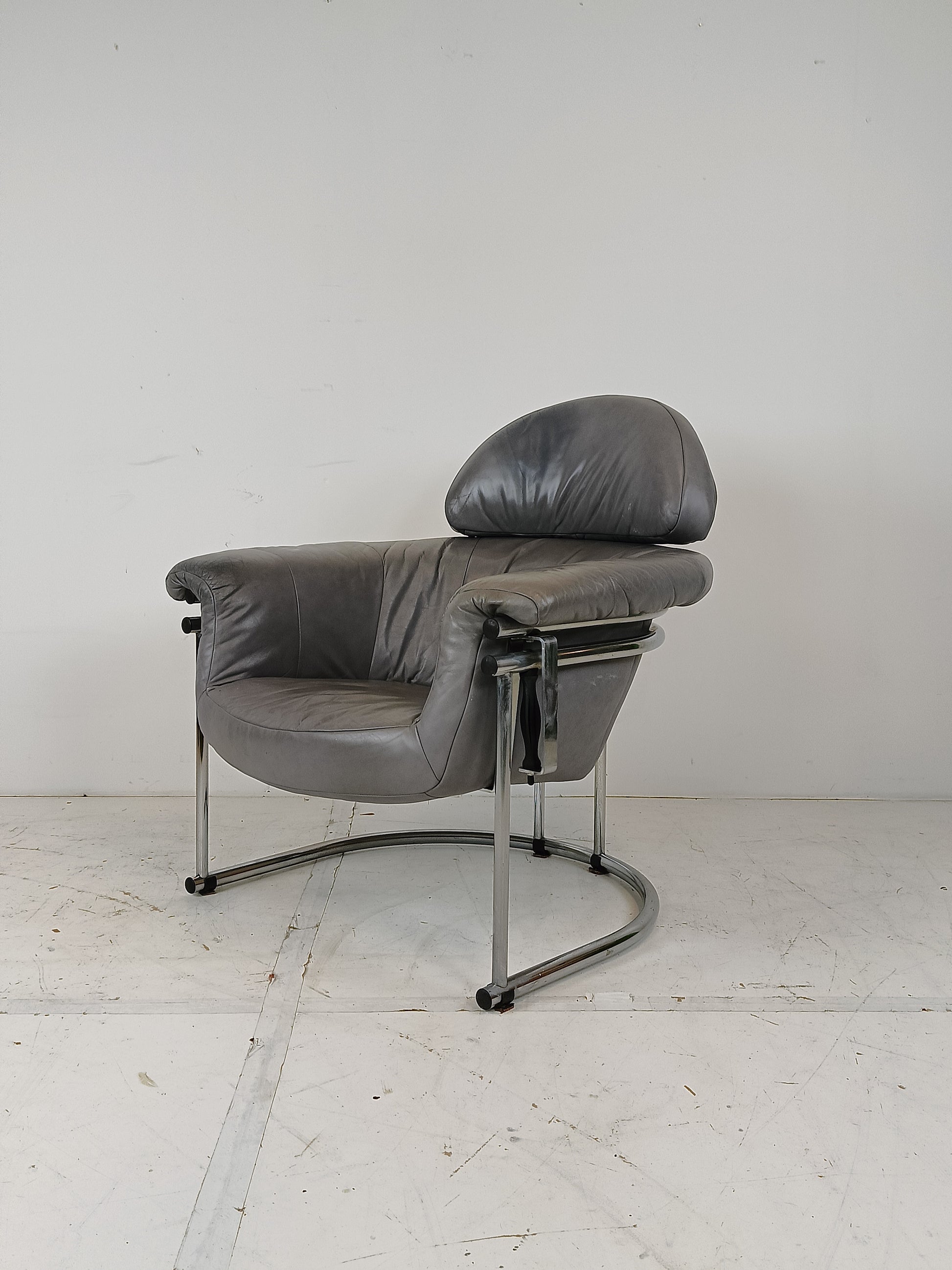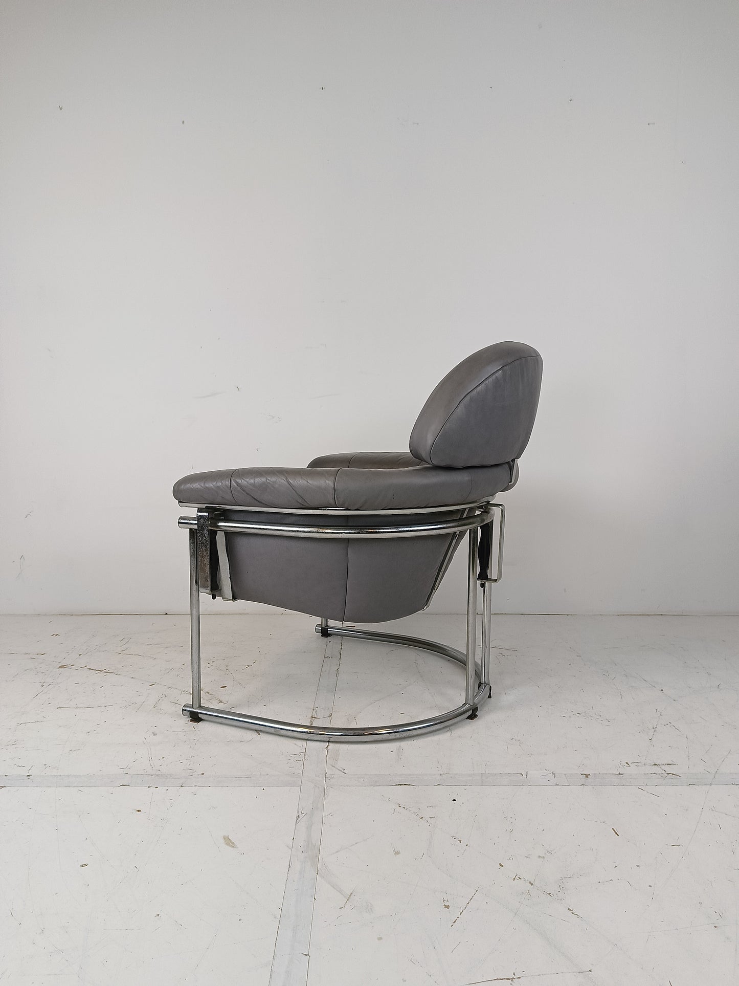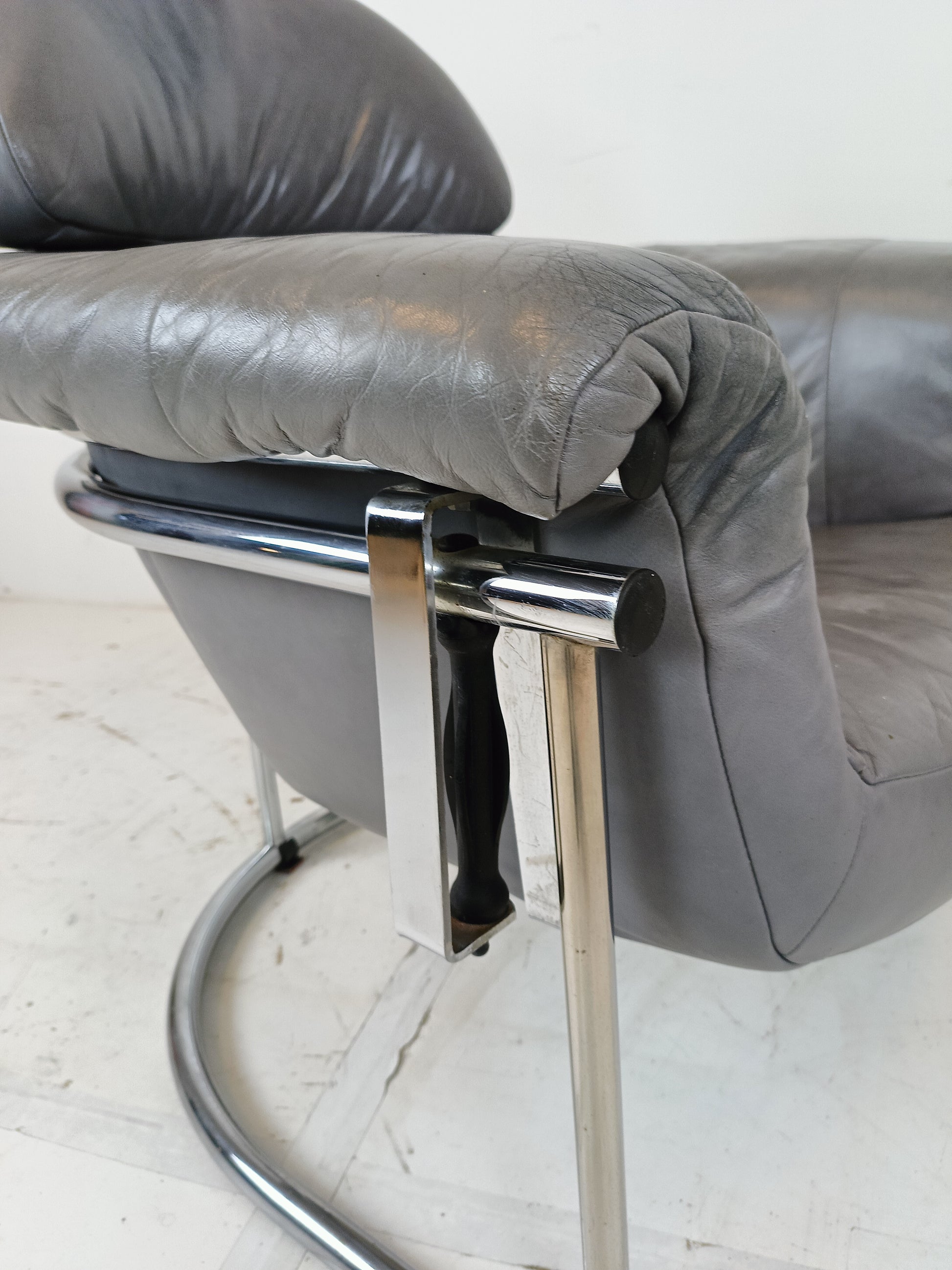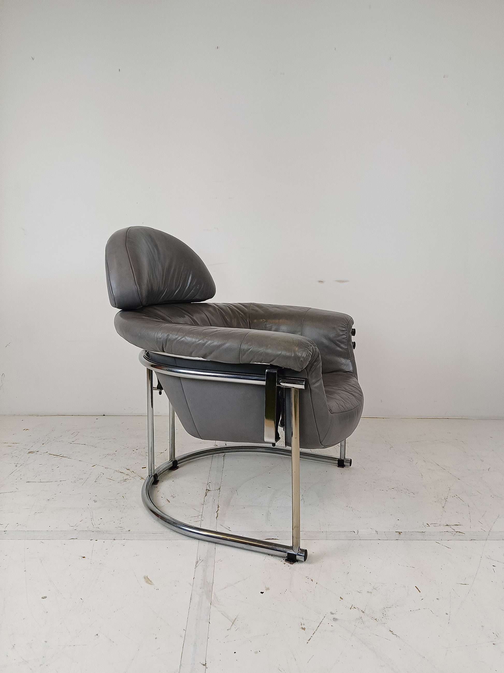 Rare lounge chair from the eighties. This chair is made of high-quality materials and can swivel slightly. The chrome tubular frame supports the leather seat in a unique design with hanging rubber spiral constructions. The chair can move but remains very stable. It is the perfect lounge chair with ample seating comfort. The thick leather is light gray with a hint of purple. There are signs of wear, these have been photographed.