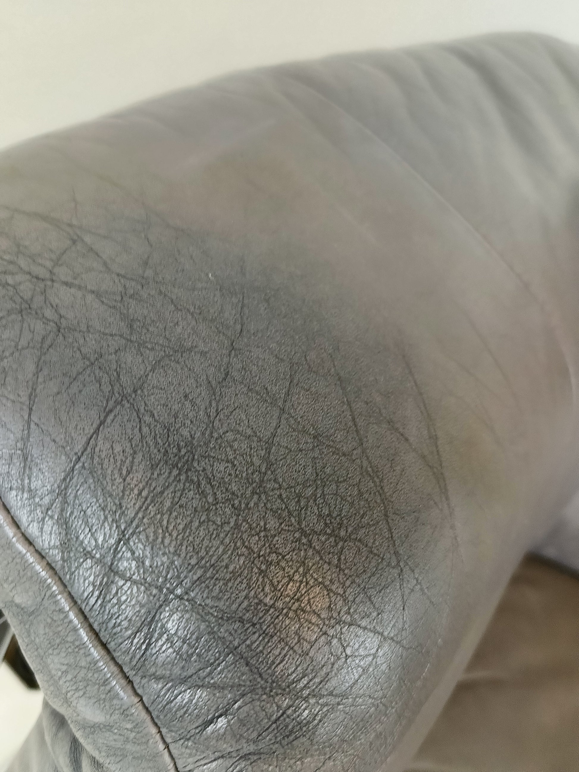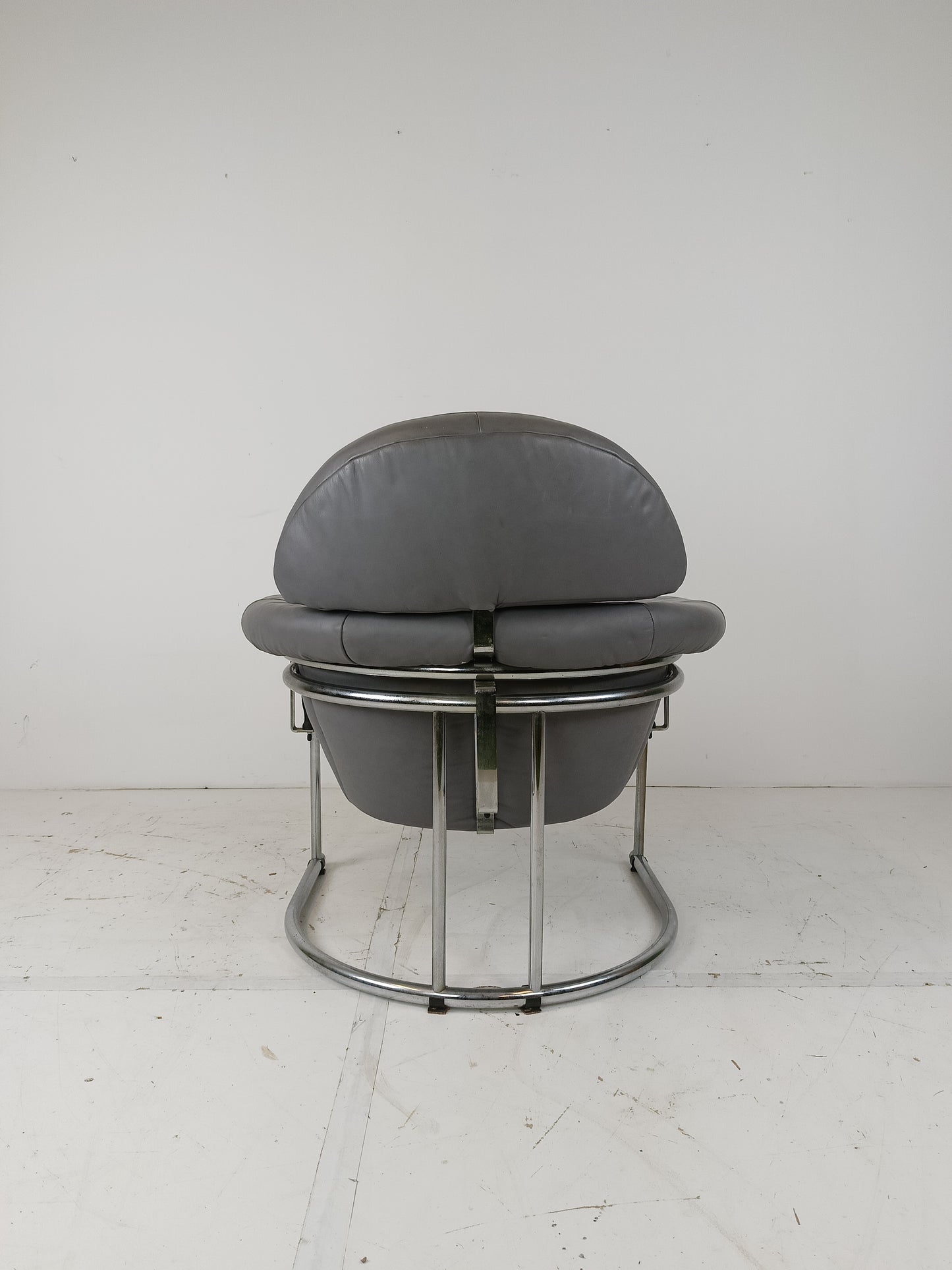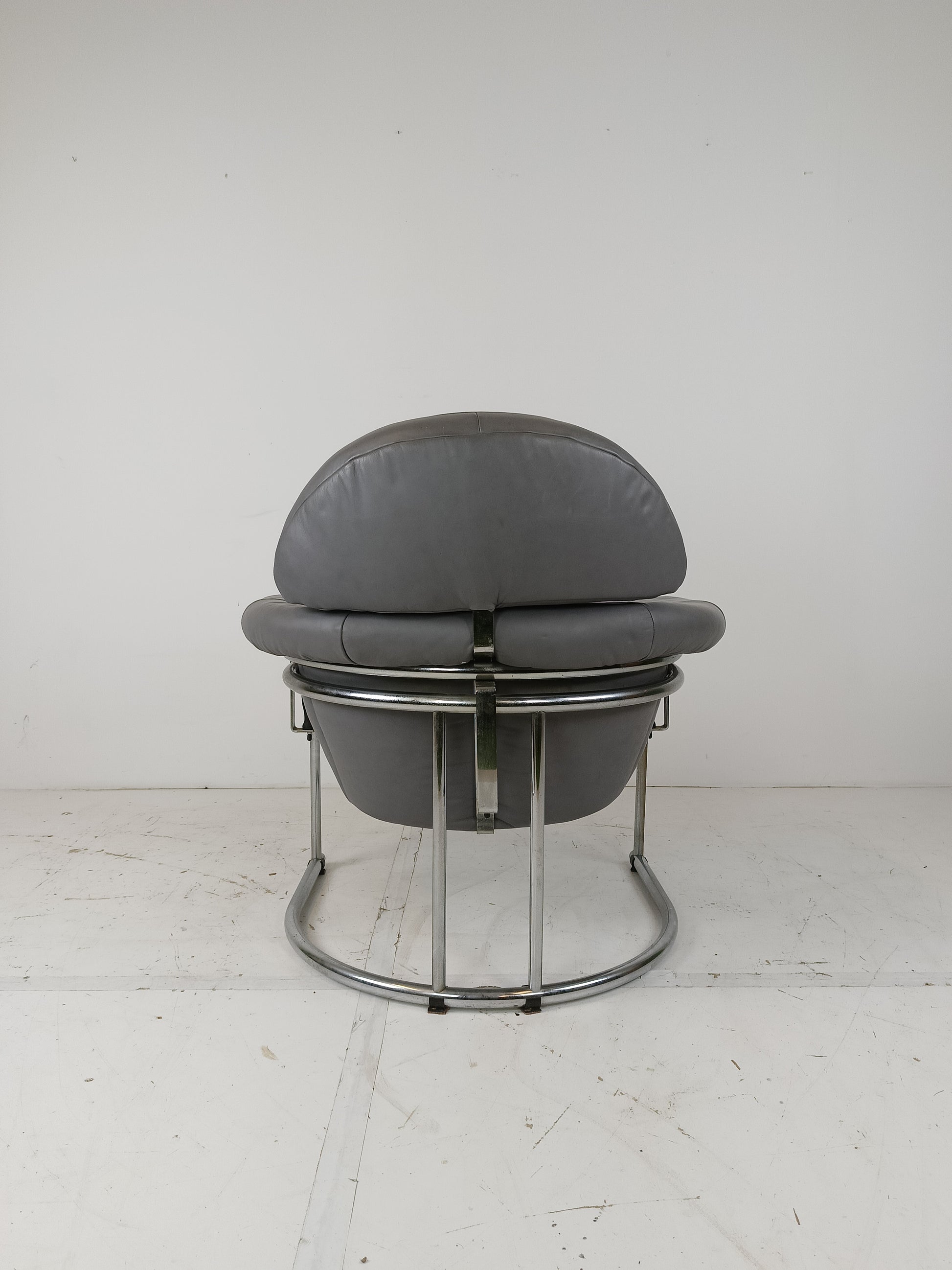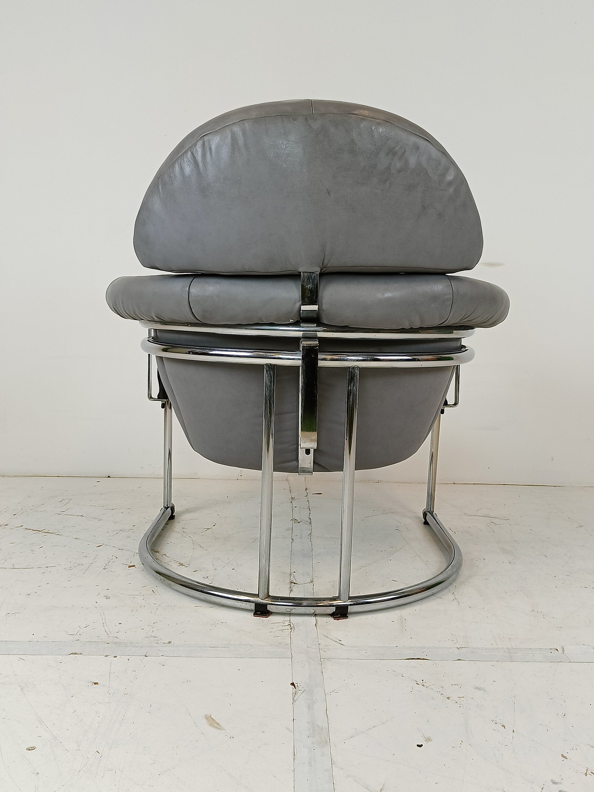 Rare lounge chair from the eighties. This chair is made of high-quality materials and can swivel slightly. The chrome tubular frame supports the leather seat in a unique design with hanging rubber spiral constructions. The chair can move but remains very stable. It is the perfect lounge chair with ample seating comfort. The thick leather is light gray with a hint of purple. There are signs of wear, these have been photographed.