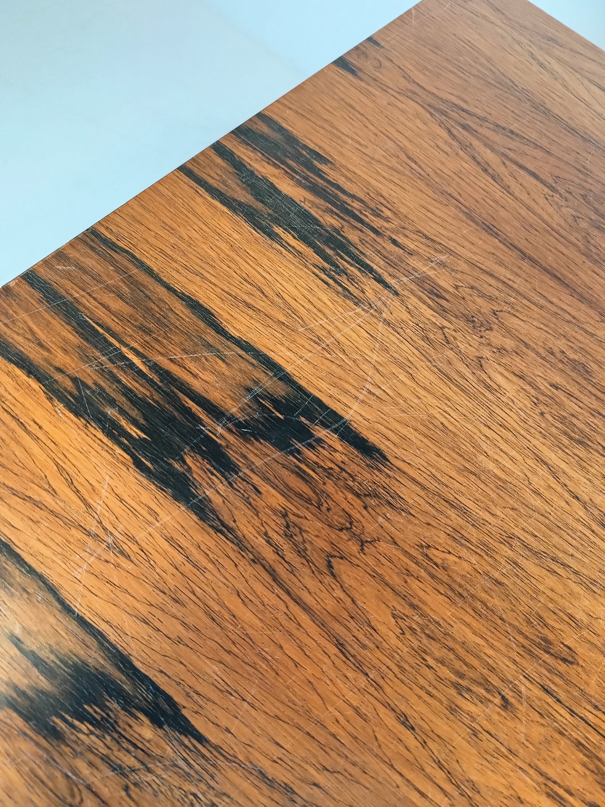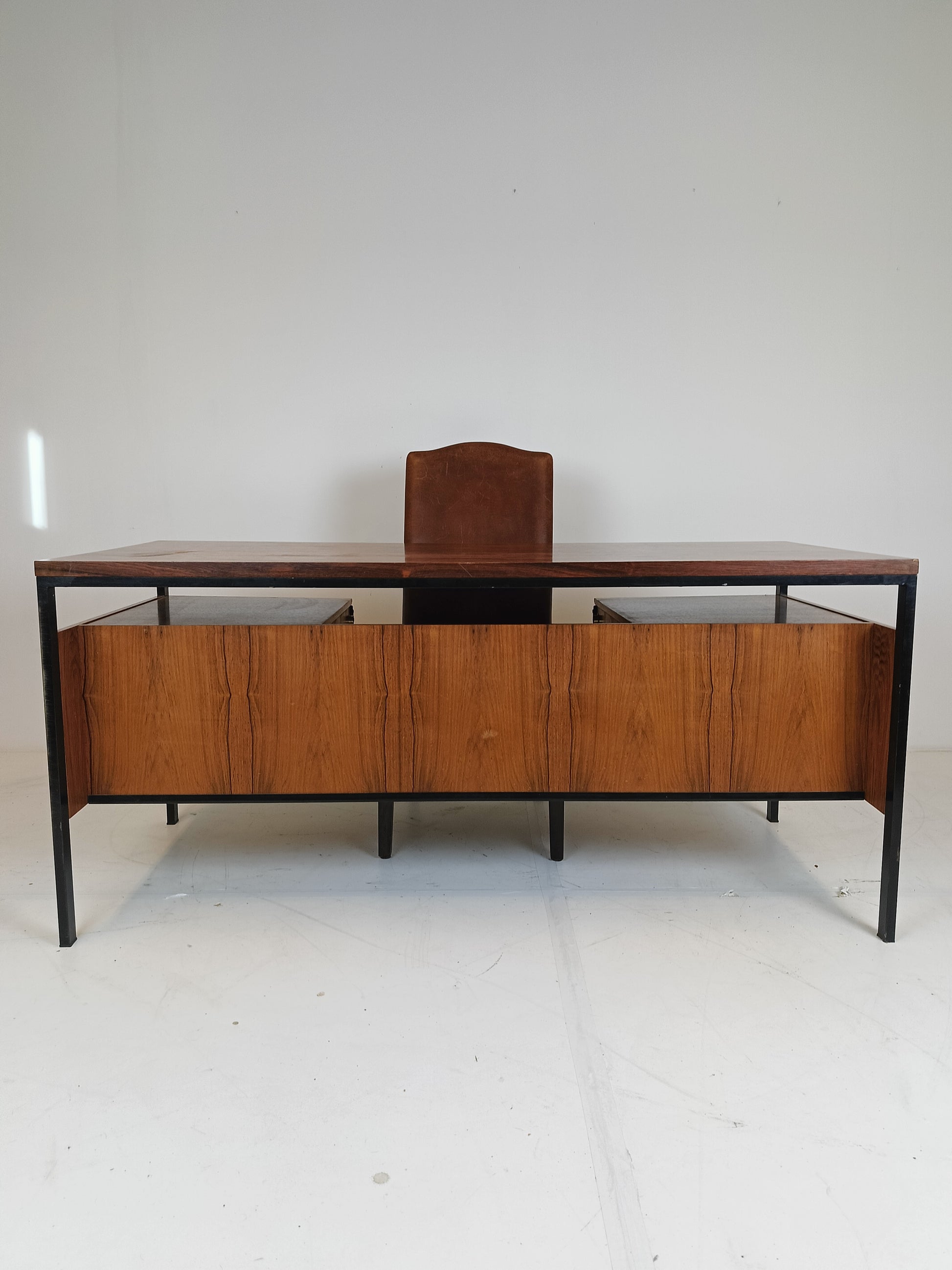 Large heavy desk designed by Friso Kramer and Coen de Vries for Eeka Kampen (NL) in the 1970s. Midcentury modern design with a luxurious finish in rosewood. Black metal frame, floating Santos Rosewood table top and two desk storage spaces with six drawers. The desk is checked, cleaned, oiled and finished again with a new wax layer. In very nice condition, the front corners of the drawers are partially restored, as shown on photos