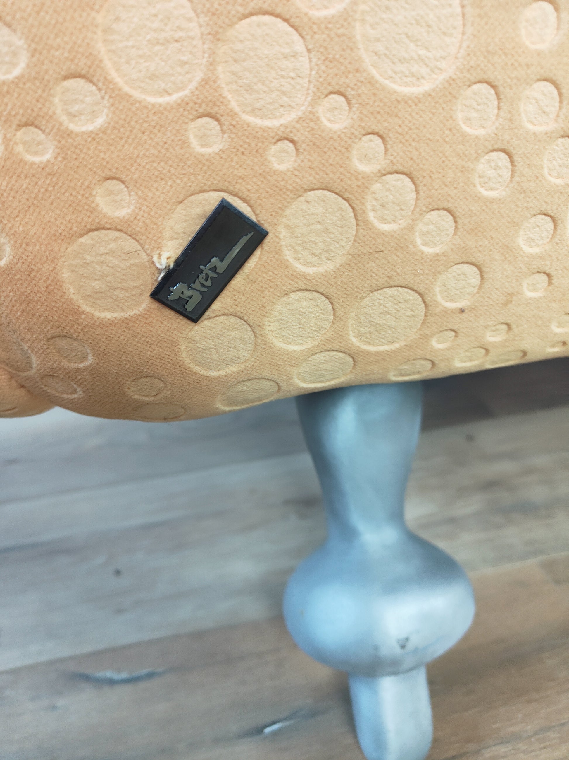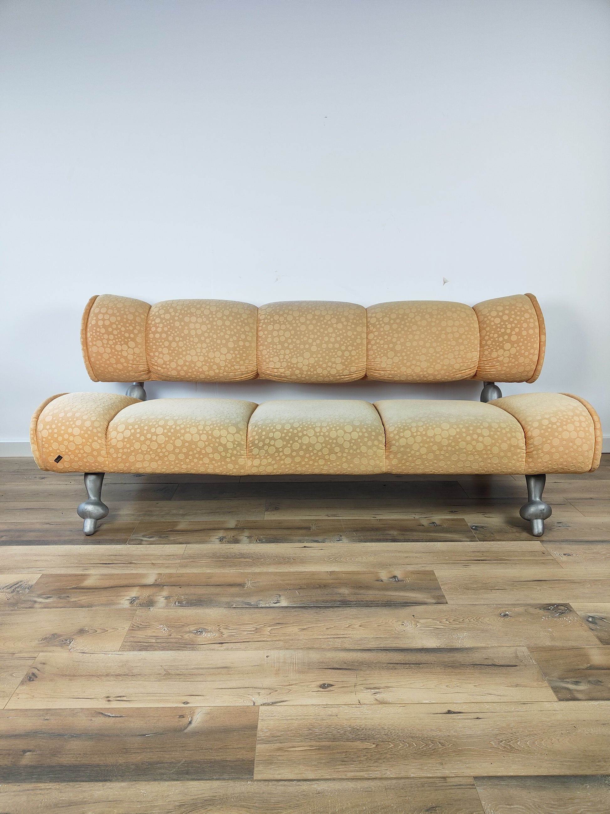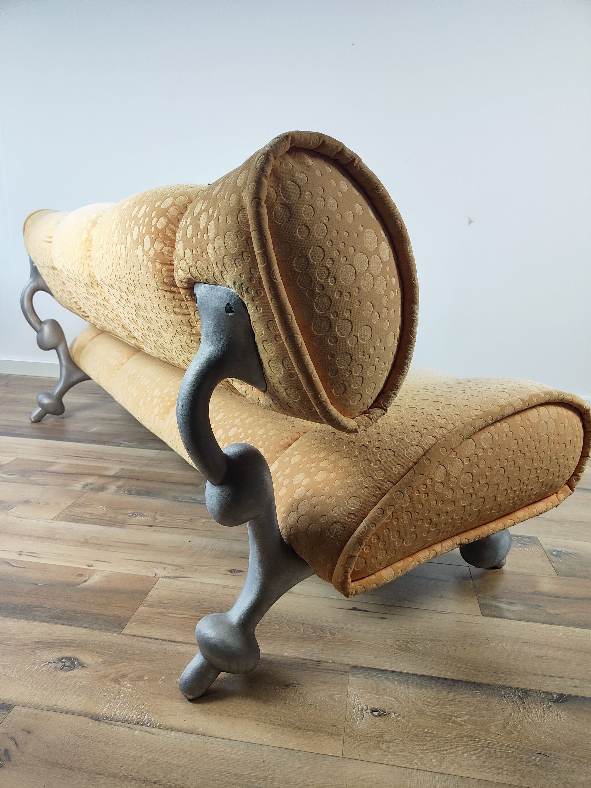 This sculptural bench with yellow upholstery and cast aluminum feet was manufactured by Bretz in the 1980s. This vintage item has no flaws, but it may show slight signs of use.