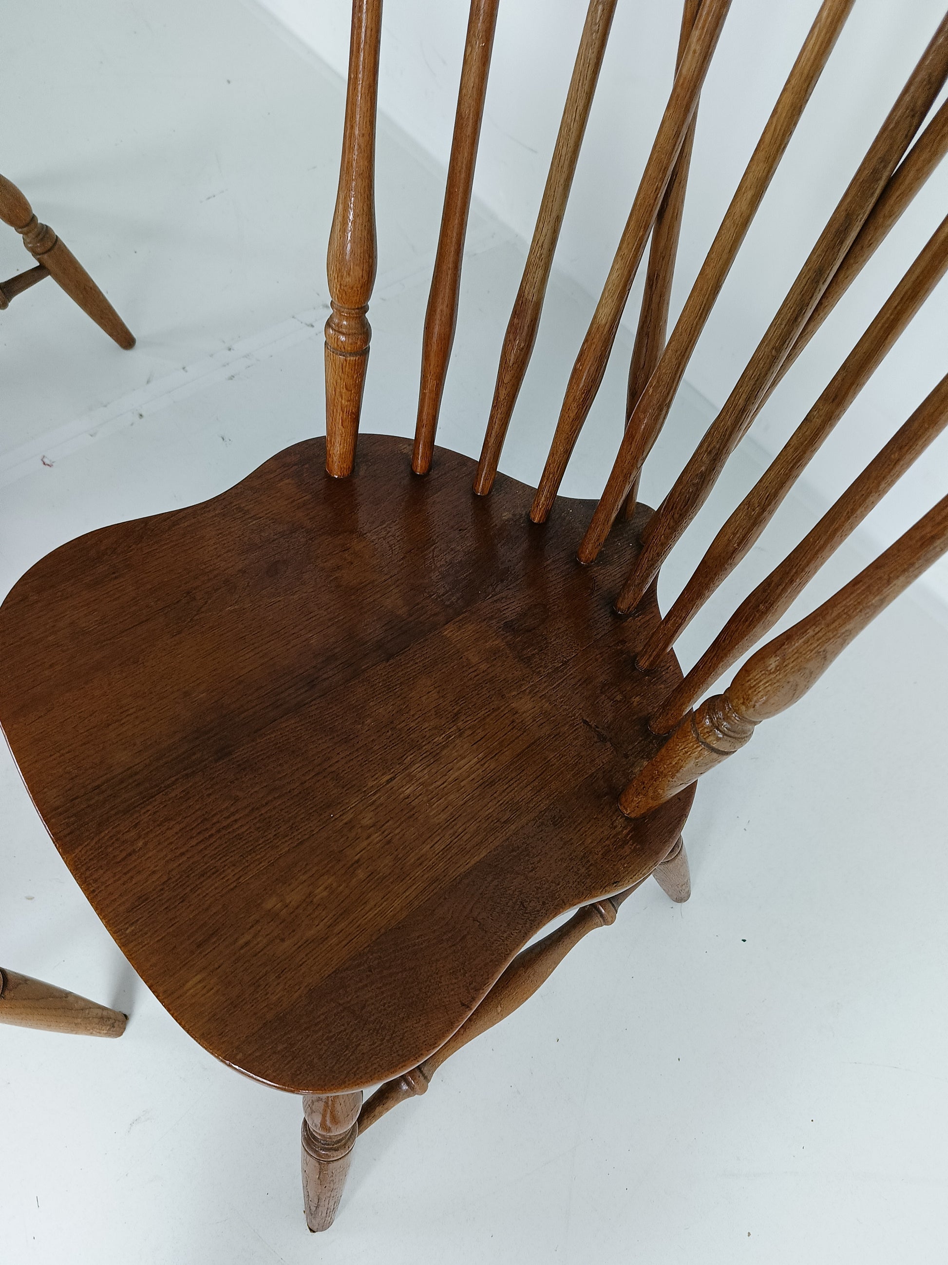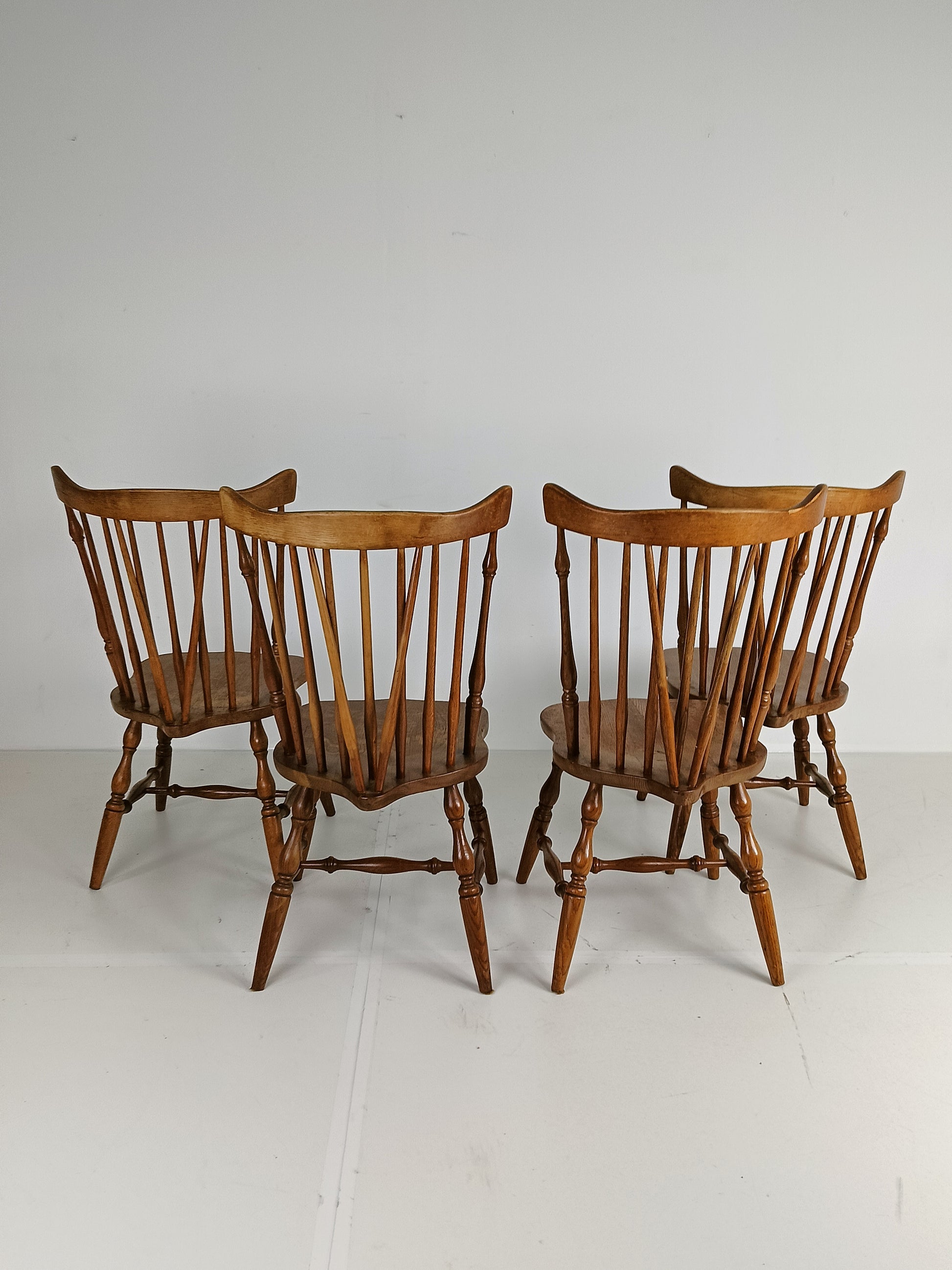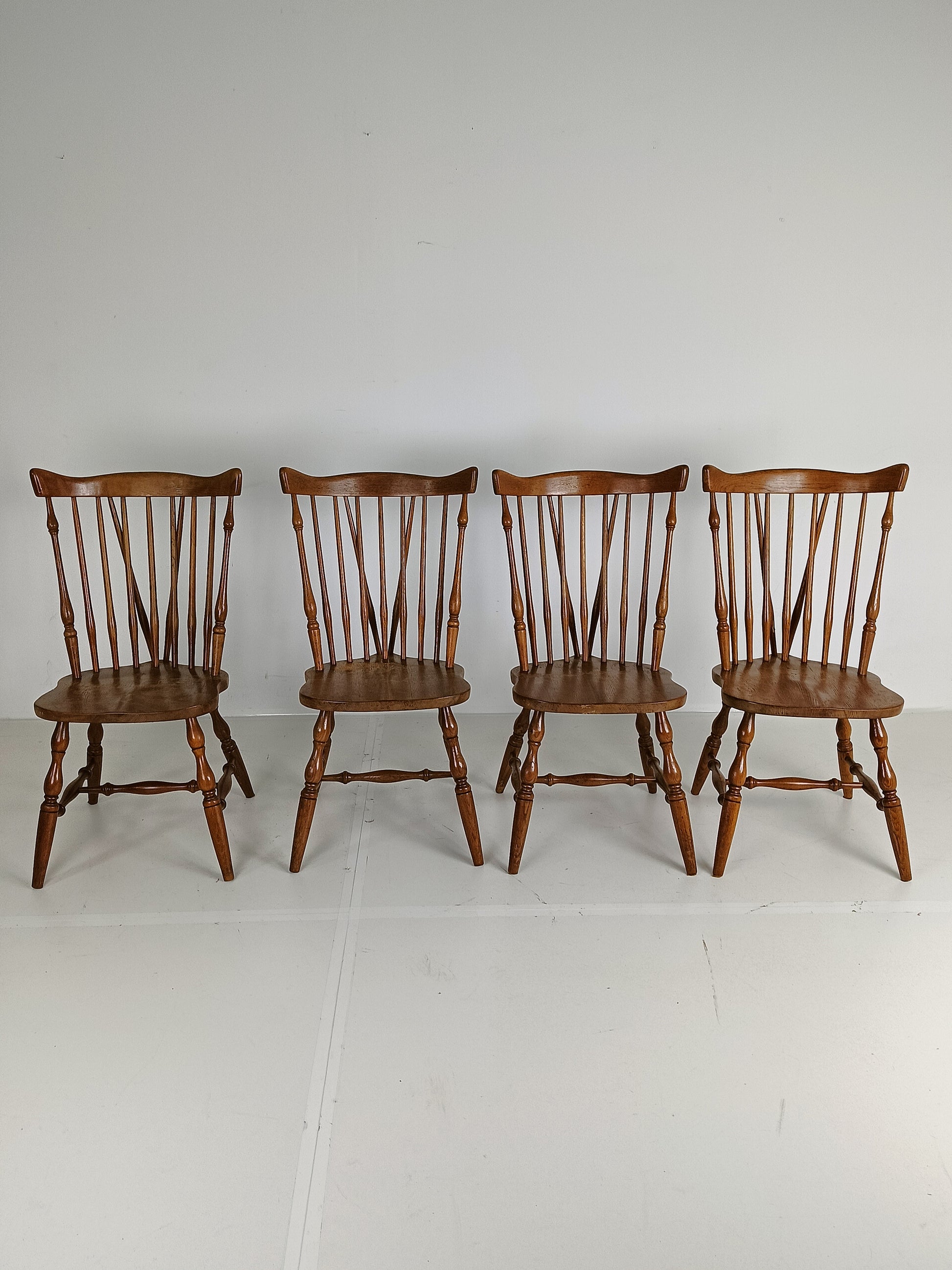 Beautiful Windsor style set of four chairs. Amazing set of antique dining room chairs from the 19th century and is made of solid wood with stunning patina. Each chair is unique but placed together form a nice set. The chairs have a high barred backrest and a comfortable shaped seat. Has signs of wear consistant with age and use. Sold as set of four.
