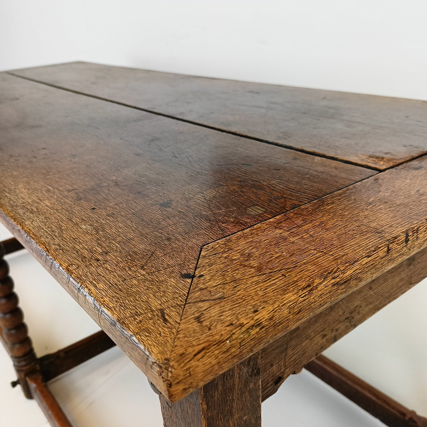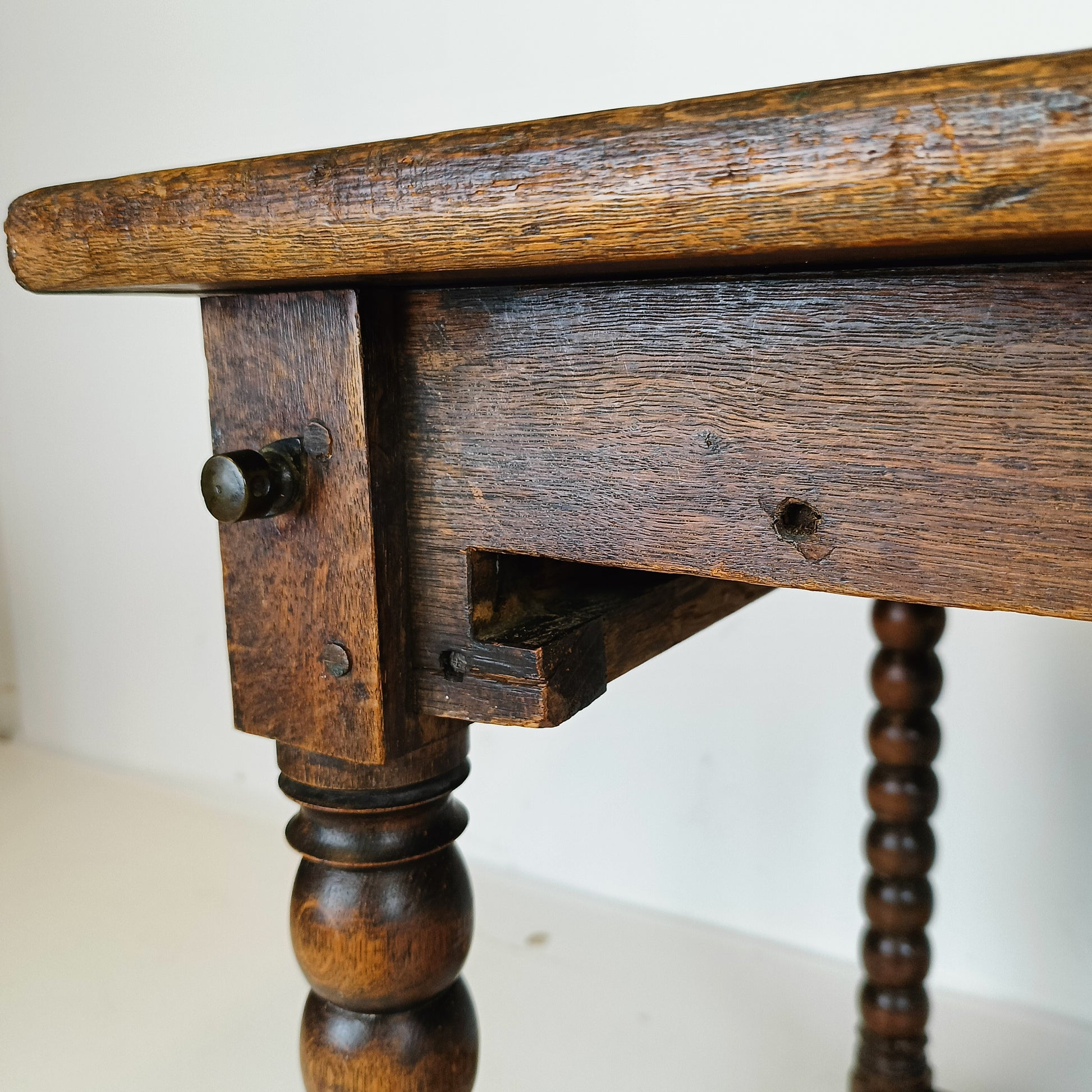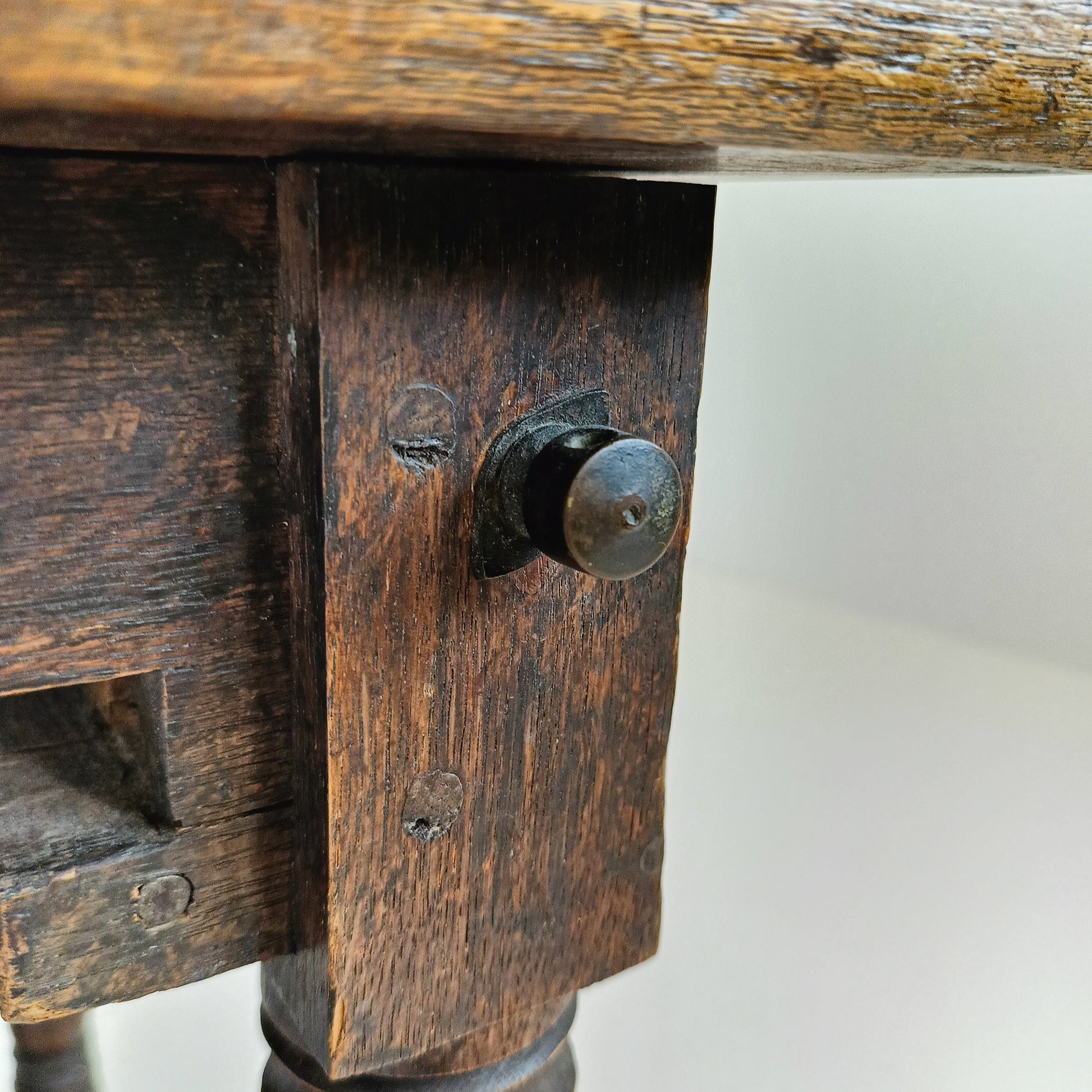 A early 1900 antique oak dining table is a beautiful example of Victorian craftsmanship. Made from durable oak, Stand on barley sugar turned legs aesthetic appeal, and connection to the past. Has signs of wear consistant with age and use.