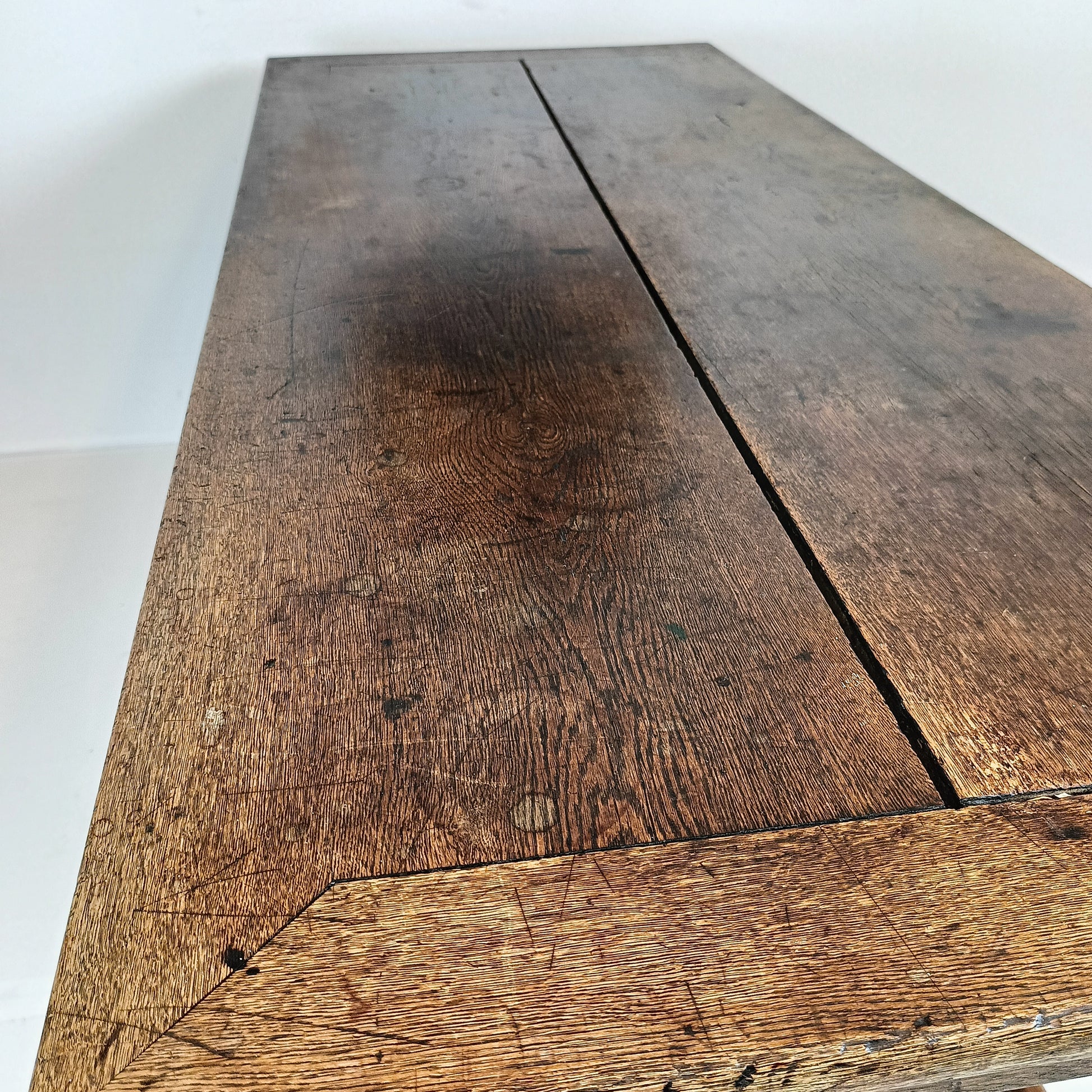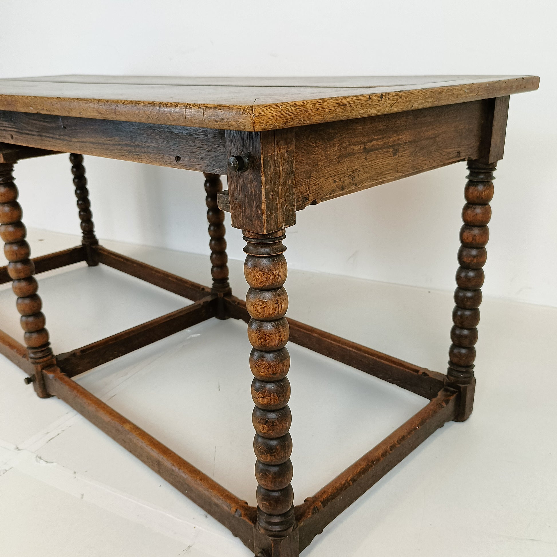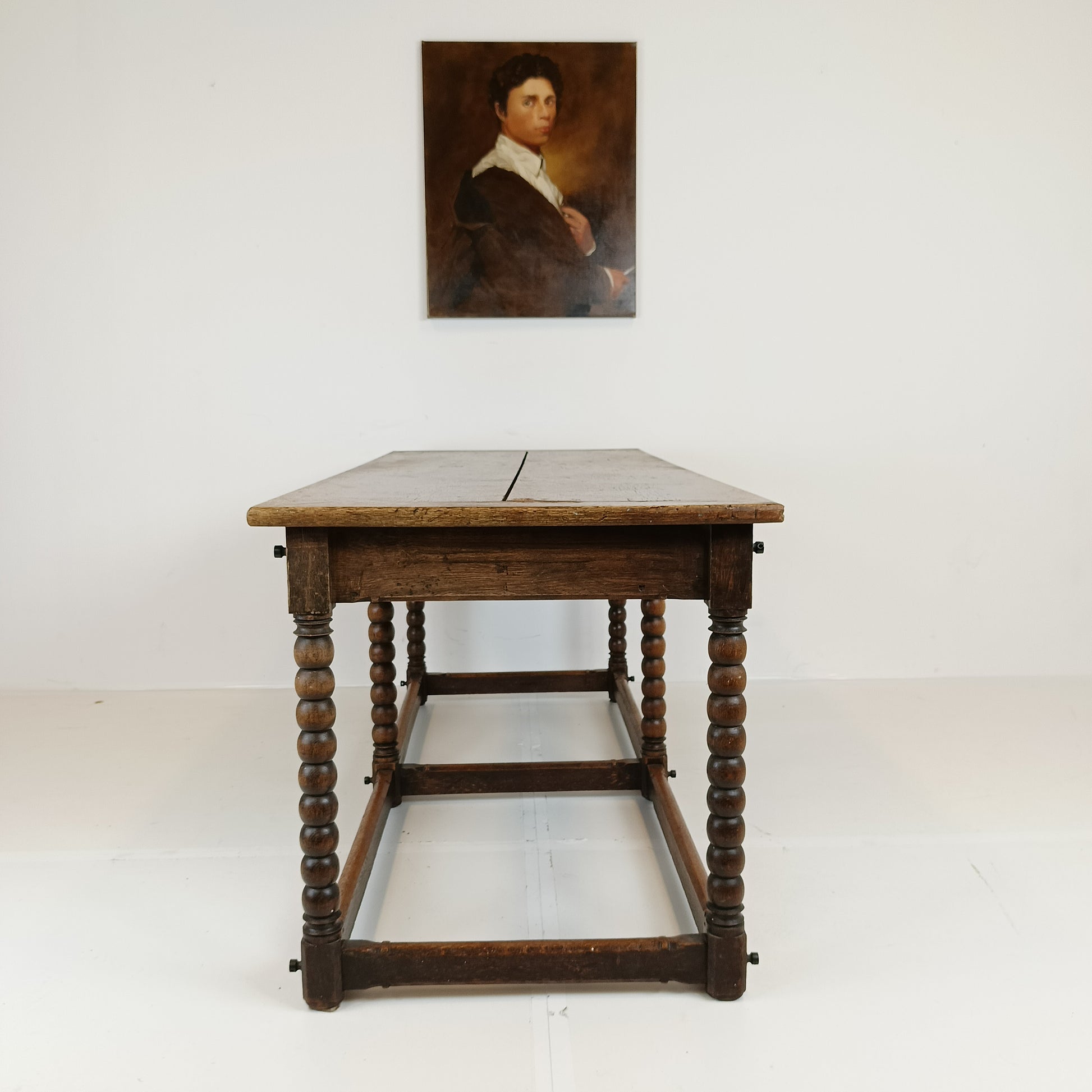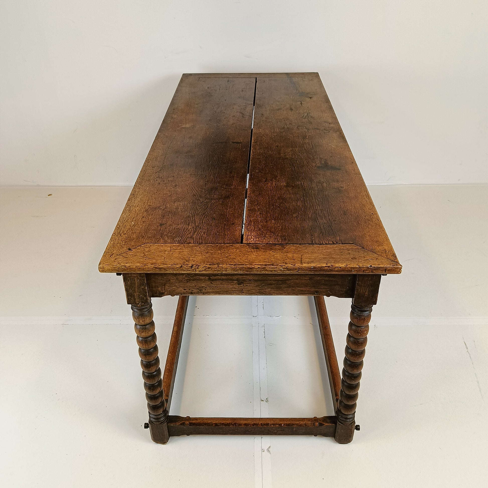 A early 1900 antique oak dining table is a beautiful example of Victorian craftsmanship. Made from durable oak, Stand on barley sugar turned legs aesthetic appeal, and connection to the past. Has signs of wear consistant with age and use.