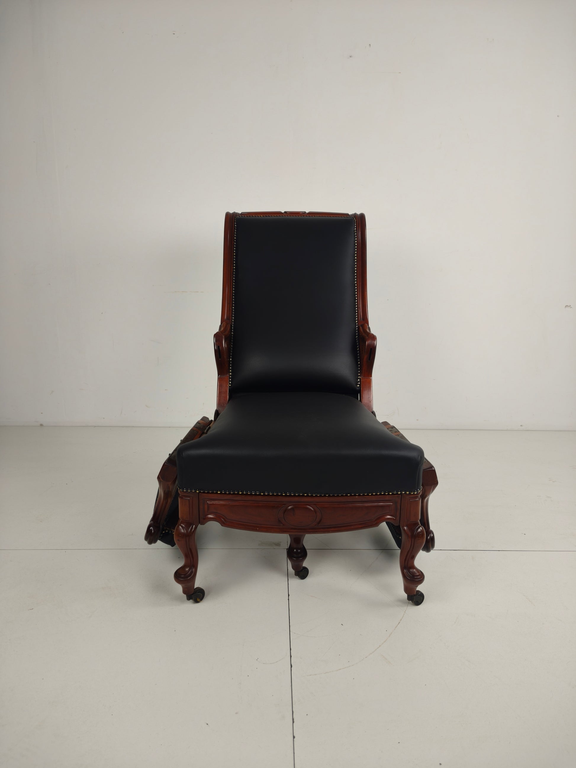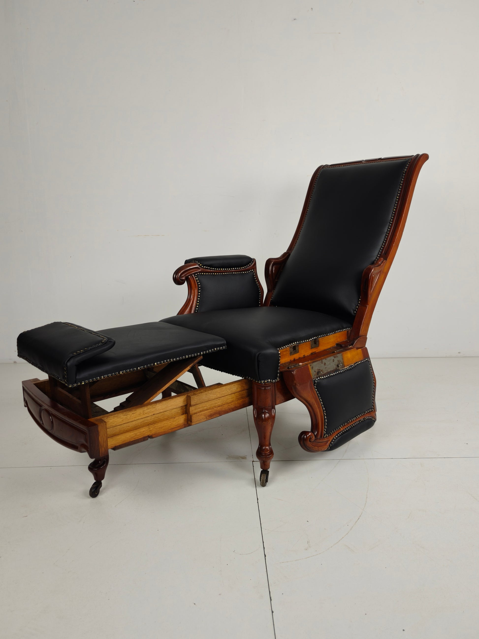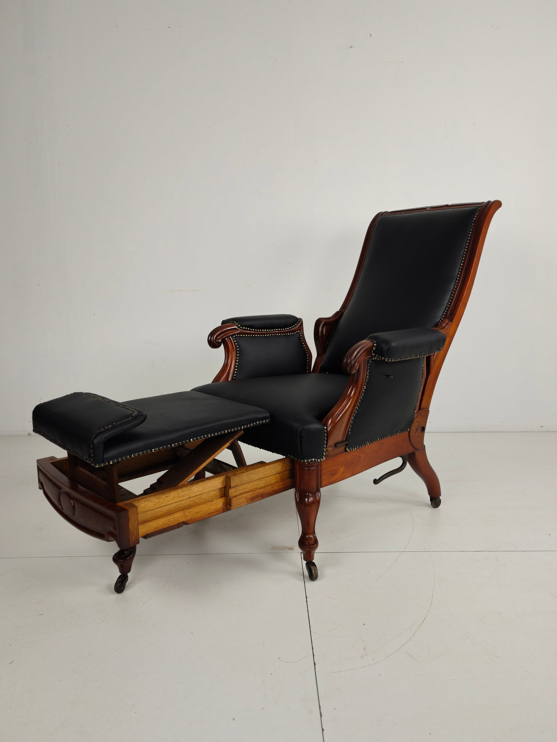 Beautiful and rare 19th-century adjustable library chair by Horrix, upholstered in black leather with decorative brass nails. The chair can be set in different positions and is marked “Horrix” on the underside.